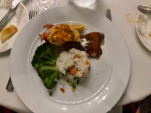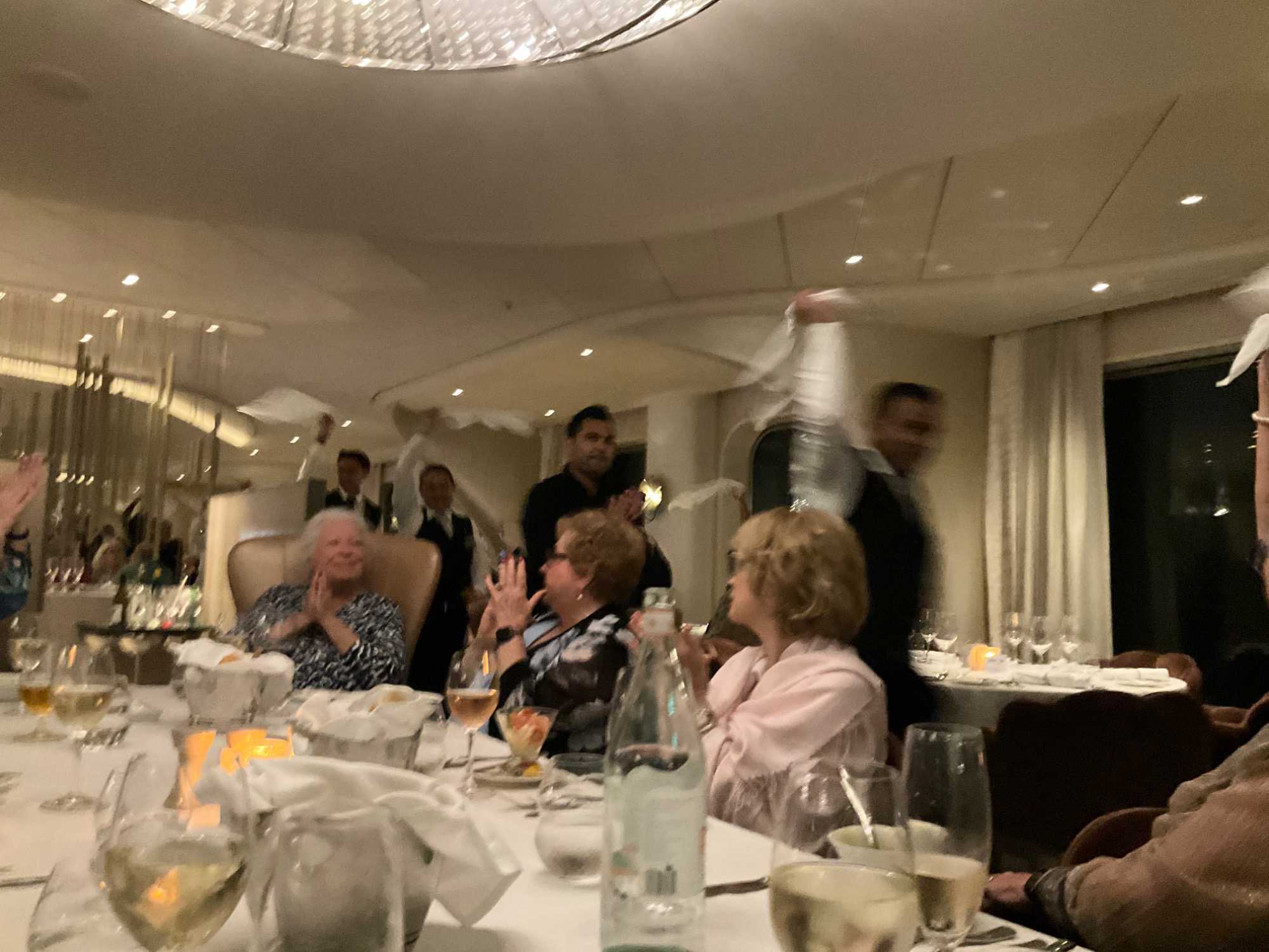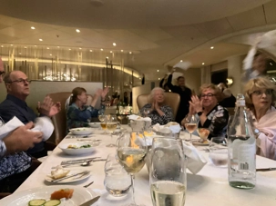 Pour le souper, on s'est retrouvé une dizaine de nos voyageurs à la salle à manger Cosmopolitan où, on nous avait réservé une "table ovale de dignitaires" . Quel plaisir on a eu, une fois de plus à échanger entre nous. On a applaudit et fait rouler nos serviettes de tables au-dessus de nos têtes comme se veut la tradition de l'avant dernier souper, pour remercier la grande équipe des cuisines et services.