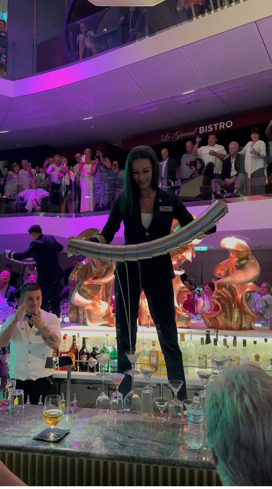 Ce soir, c’est la soirée du capitaine. Tout le monde enfile ses plus beaux atours. On est beaux et l'air est à la fête. Nous avons même pu apercevoir Capitaine Kate se prêter au jeu du spectacle du Martini Bar en la regardant verser des dizaines de Martinis en même temps ! C’était spectaculaire, tout comme la foule venue assister à ce spectacle haut en couleur. Au souper, bœuf Wellington, homard et bien d'autres plats appétissants sont à l'honneur. C’est aussi le temps de remercier le personnel du service en salle-à-manger. Ils défilent sous les applaudissements des croisiéristes et la musique entraînante de la chanson “Sweet Caroline”. Trop de choix, on veut tout goûter. Nous aurons pris assurément un peu de poids sur ce navire!