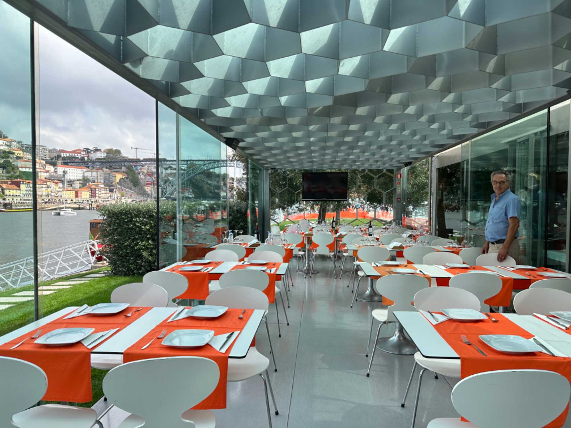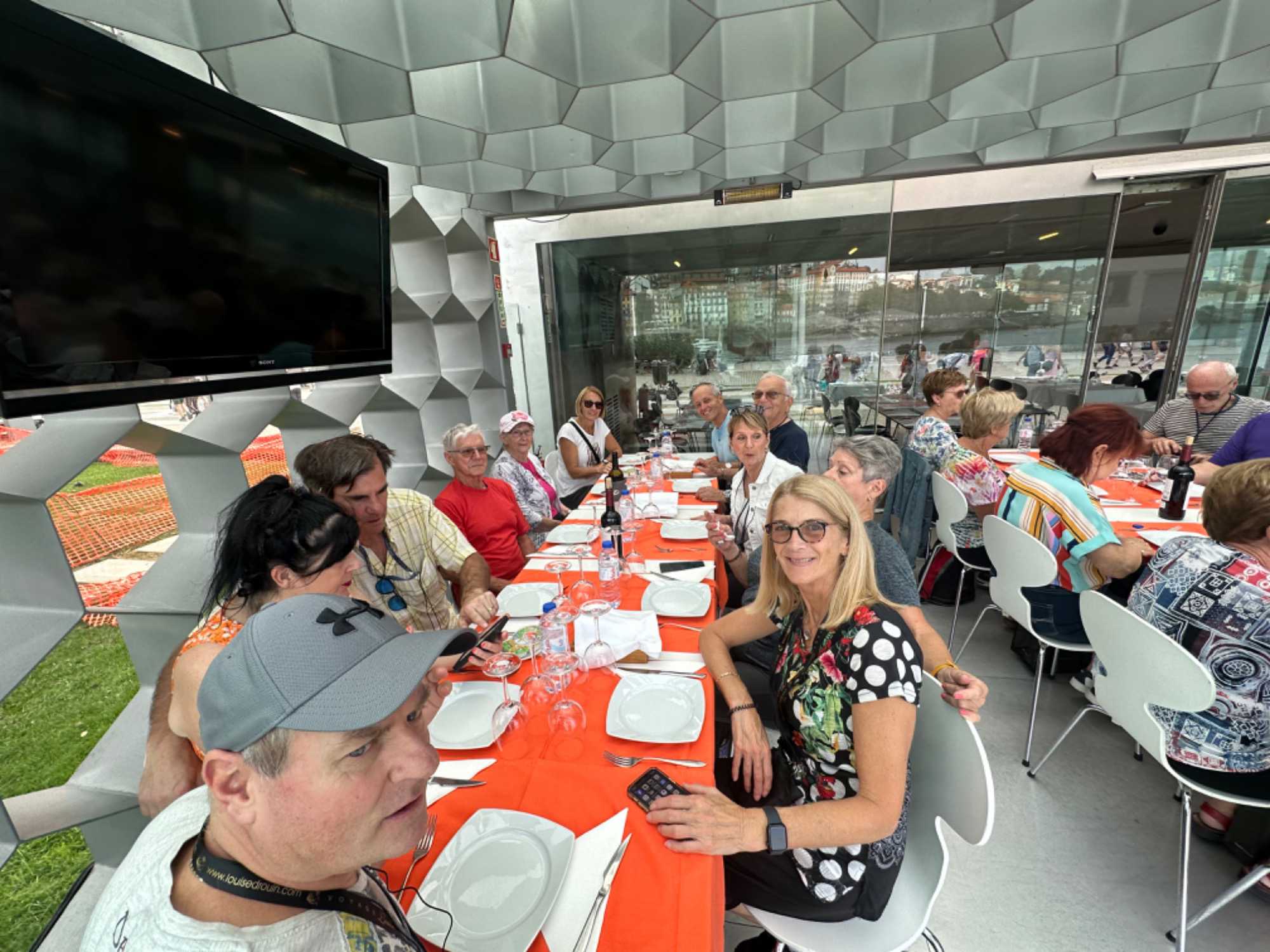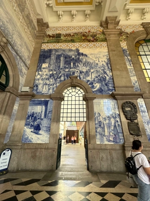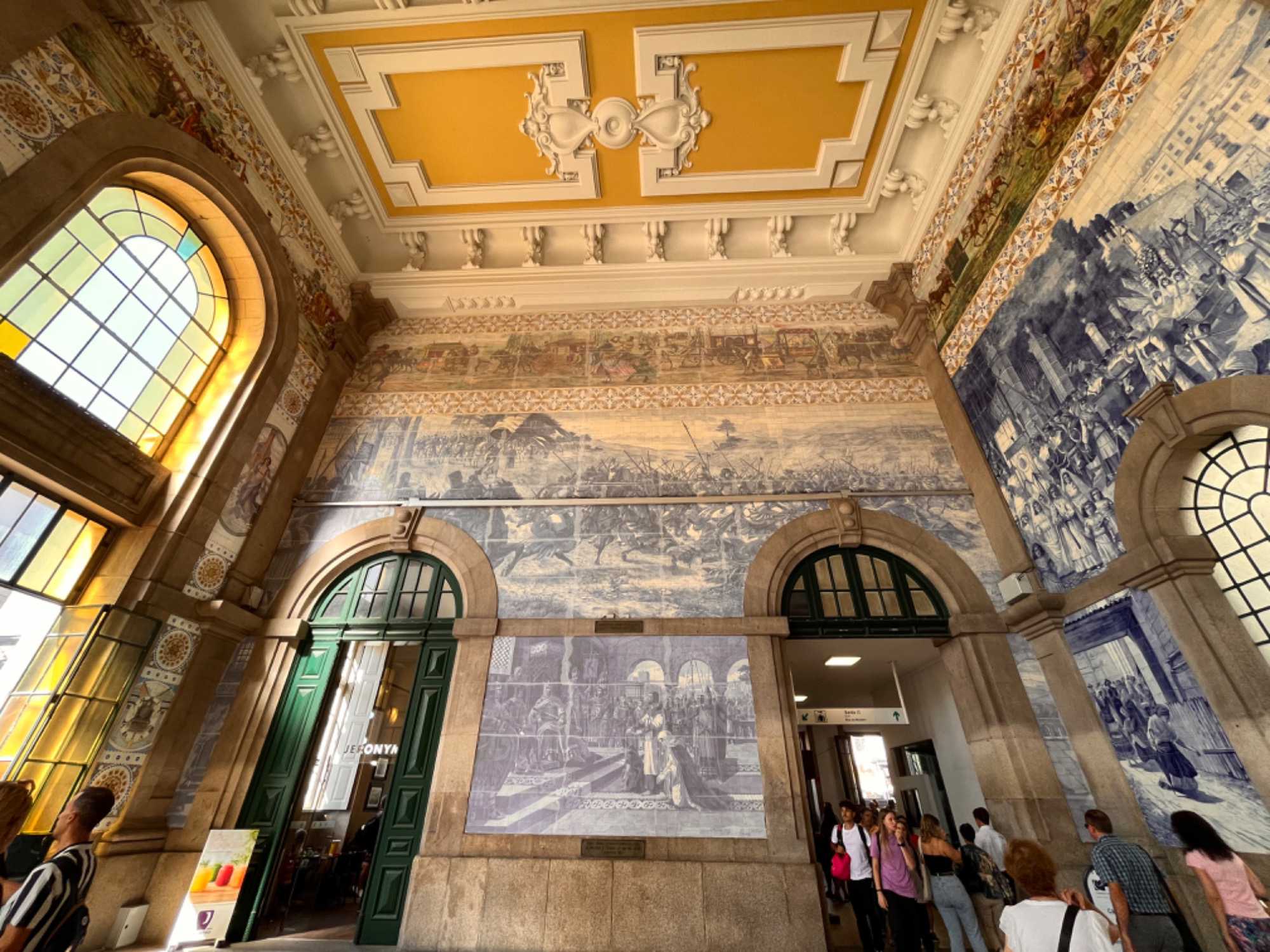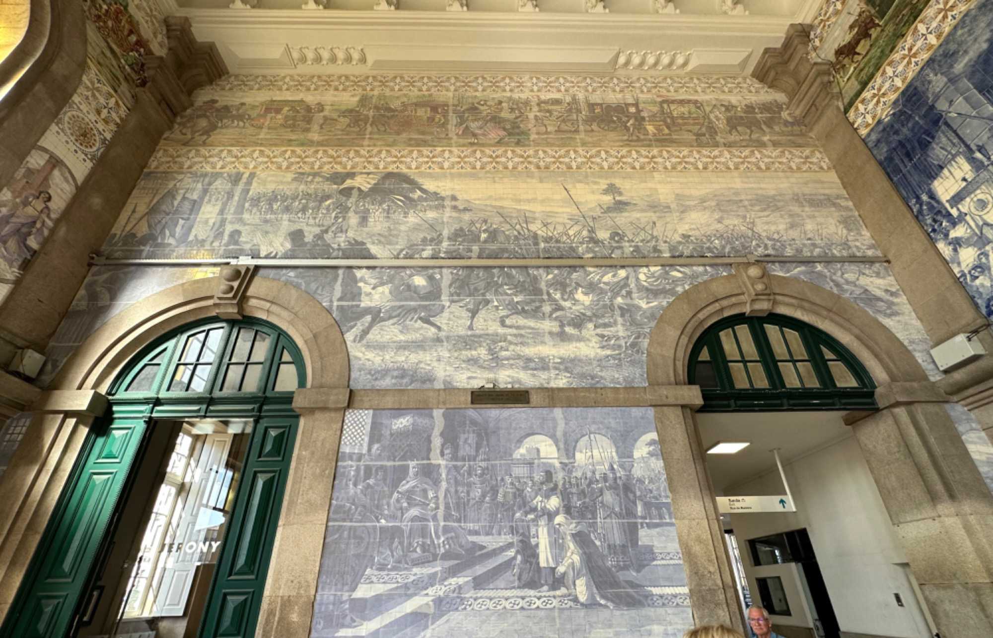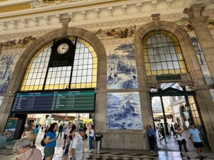 Après cet apéro matinal, place au lunch aux abords du Douro pour partager le repas sur la magnifique terrasse du restaurant Ar de Rio. Tous admirent le décor splendide et le doux soleil du midi où se marie le rouge et blanc des tuiles et le bleu du ciel. Nous avons droit à quelques classiques de la cuisine portugaise et sommes unanimes envers la générosité des portions. Puis, cap sur le haut de la colline pour un arrêt éclair à la très célèbre gare de Porto nommée São Bento. Grâce à la conduite imaginative de notre chauffeur qui a su se faufiler entre les zones de travaux majeurs, gracieuseté d’une nouvelle station de métro.