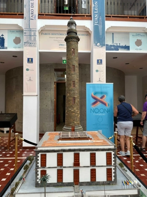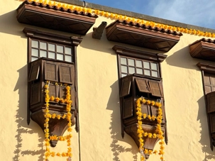 Paul notre guide nous rejoint directement au bateau avec l’autocar. Notre visite commence par un arrêt panoramique surplombant le quartier du port et Las Rehoyas. Nous pouvons apercevoir le navire de là-haut. Par la suite, nous circulons à pied dans les rues étroites et pavées de pierres de Las Palmas et nous nous arrêtons devant la cathédrale Santa Ana et à la maison de Christophe Colomb. Paul nous parle des voyages de l’explorateur qui a chacun d’eux a dû passer par les îles canariennes soit pour effectuer des réparations à son navire, changer de voiles ou simplement tracer sa trajectoire en fonction des vents. Le temps disponible nous permet un arrêt au marché local de fruits et de légumes comme de poissons et de charcuteries. Ensuite, retour à l’autocar pour emprunter l’avenue Canaria qui longe le littoral et nous conduit tout au sud vers Maspalomas, station balnéaire réputée. Des champs d’éoliennes observables de part et d’autre de la route fournissent 20% de l’approvisionnement en électricité de l’île, le reste étant assuré par les systèmes à essence diesel. Paul nous explique que l’île accuse un retard considérable d’une trentaine d’années en matière d’approvisionnement en énergie solaire, mais des progrès ont été faits récemment depuis la guerre en Ukraine, afin de limiter la dépendance énergétique face aux autres pays. Nous faisons un arrêt à l’emblématique phare à l’extrême sud de la pointe de Maspalomas dont la construction date de 1884. Certains ont même gravi les escaliers en colimaçon menant à sa terrasse. Nous pouvons y observer l’étendue des plages et des dunes de sable. Nous aurons aussi l’occasion de voir de plus près ces dunes, qui peuvent atteindre jusqu’à 25 mètres de haut, protégés par une réserve naturelle. On se croirait en plein désert !