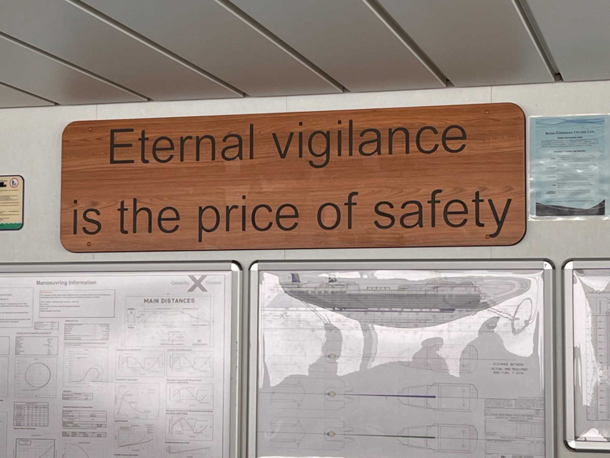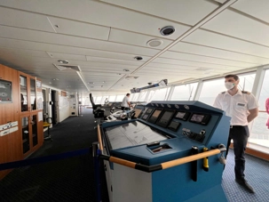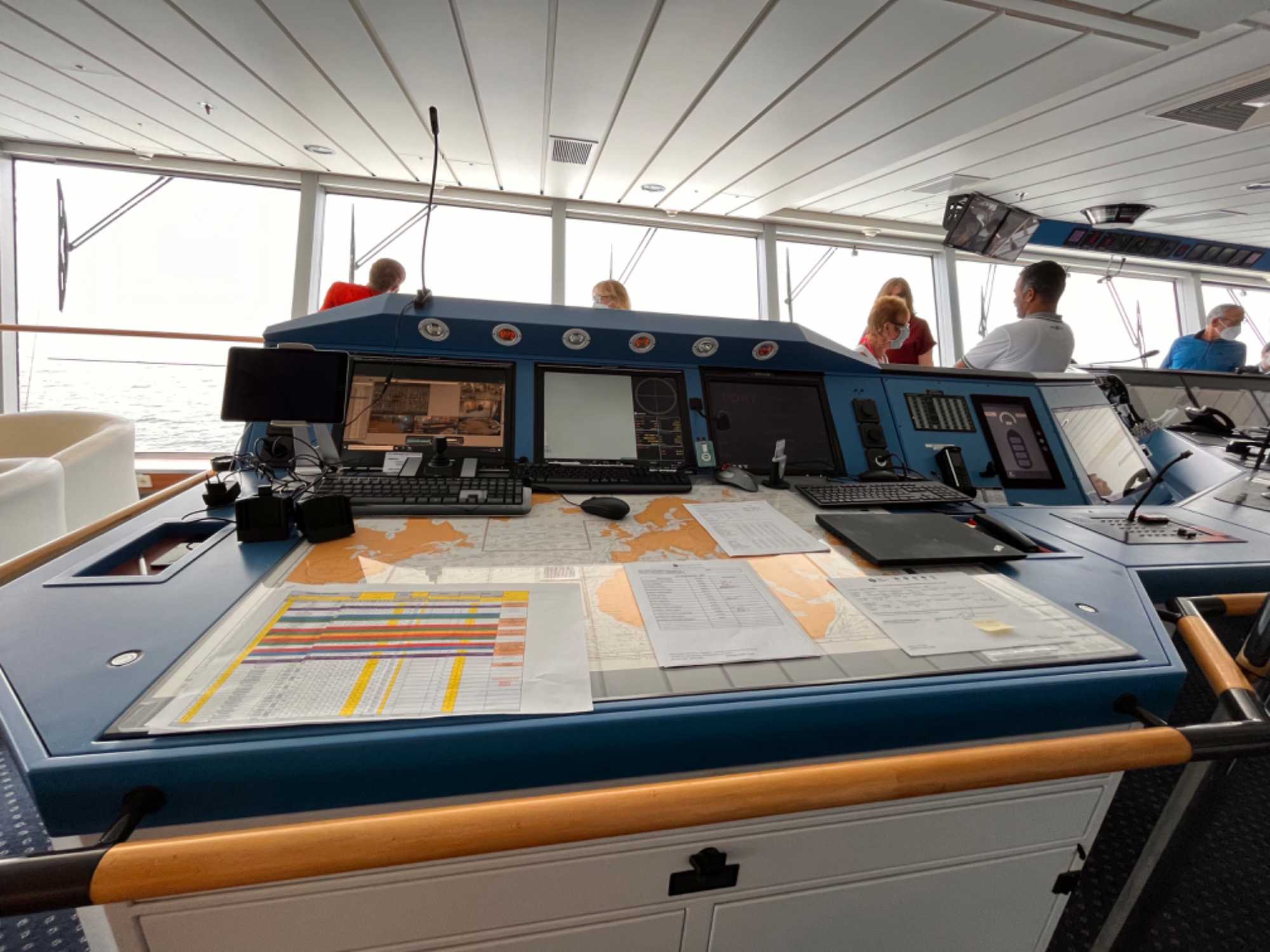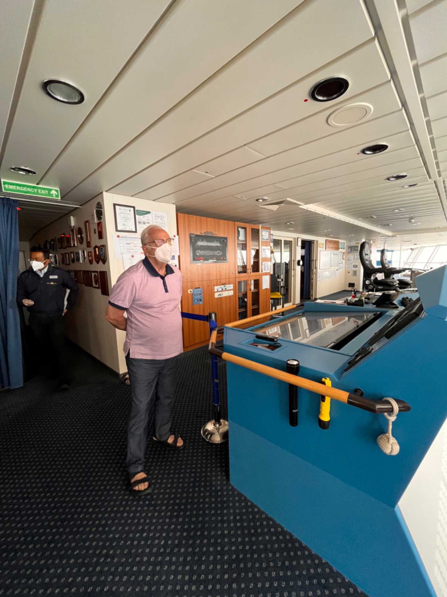 Une visite des coulisses du théâtre est proposée dès 9 h ce matin. Rencontre avec les artistes, visite à l’arrière-scène, de la salle de maquillage et de la régie. Les artistes ne manquent pas de reconnaître que Celebrity Cruises prend bien soin d’eux comme de leurs conditions de vie. Ils y sont ici pour 6 mois avant de rentrer à la maison, s’offrir un repos bien mérité. Puis à 10 h 30 Marie-Christine offre une visite de grand privilège à nos voyageurs, qui seront d’ailleurs le seul groupe à en bénéficier, soit la visite du poste de pilotage. Sous haute surveillance comme si nous entrions dans une voûte, les privilégiés circulent dans des aires hautement sécurisées afin de découvrir les rouages de la navigation de ce géant des mers. Technologie à la fine pointe, radars, sonars, stabilisateurs rétractables, manettes pour les moteurs pivotants et aides à la navigation, systèmes de communication numériques, radio et téléphoniques, tout est réglé aux quarts de tour. Ce qui a le plus impressionné nos voyageurs est le hublot du plancher, situé sur la partie excédante du navire qui permet au capitaine de visualiser l’accostage lui-même et d’envoyer ses commandements à la salle des machines. Comme l’accès est limité à un petit nombre de personnes, un 2e groupe profite de la visite à son tour à compter de 14 h 30. Une vistie fort appréciés de tous.