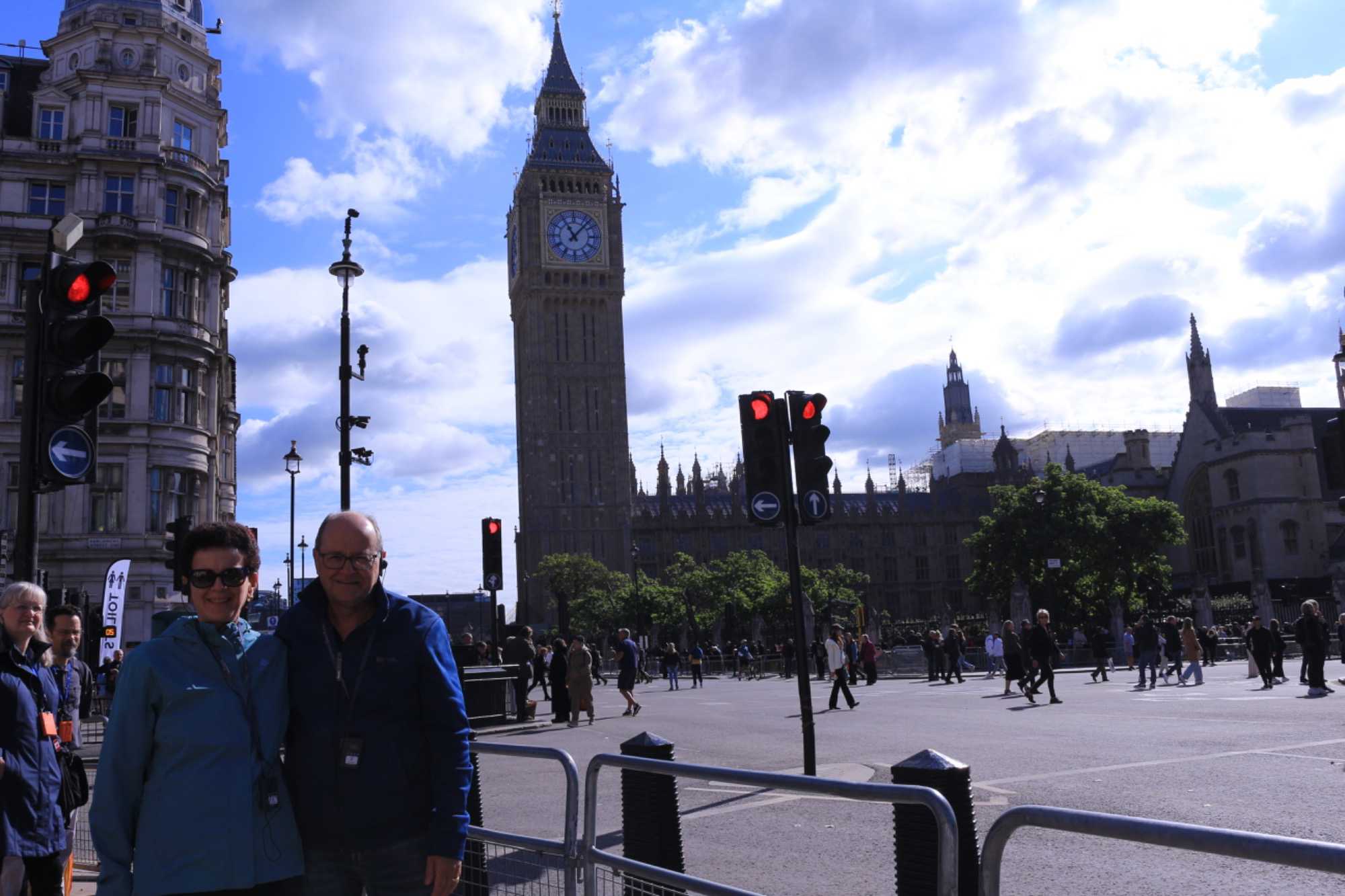 Nous traversons plusieurs quartiers, dont le « Chiswick » qui tire son nom des anciennes fermes laitières du secteur, celui de Chelsea, puis nous nous dirigeons vers Hyde Park où nous descendons au « Albert Mémorial ». Nous apercevons nos premiers taxis « Black Car », nos premiers autobus « Double Decker » et nos premières cabines téléphoniques si traditionnelles. Après avoir vu les affiches lumineuses du Piccadilly Circus, nous entrons dans Westminster (qui signifie Les ministères de l’Ouest). Nous aurons l’occasion d’y faire une bonne marche en raison des fermetures des rues du cœur de ce quartier. La sécurité est omniprésente, les gardes armés, les bobbies, les gardes des chefs d’États qui seront présents pour les funérailles de la Reine. Descente du car près de Trafalgar Square aperçu du Mall si solennellement décoré de drapeaux de «l’ Union Jack». Dire que le cercueil de la Reine est passé ici il y a quelques jours à peine. Big Ben et les monuments du quartier aux traits architecturaux si variés sont sous leurs plus beaux jours. L’affiche de la station du Underground Westminster nous rappelle que le métro de Londres est le plus vieux métro du monde (1863) !! Nous poursuivons vers le quartier des Musées, financier, tous aussi riches d’histoire puisque Londres fut d’abord sous occupation romaine après tout ! Tout ceci donne faim et ce sera au superbe resto-pub Jamie Adam’s Court. Quoi de mieux que de commencer par un bon “Fish’n Chips” londonien!!