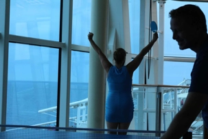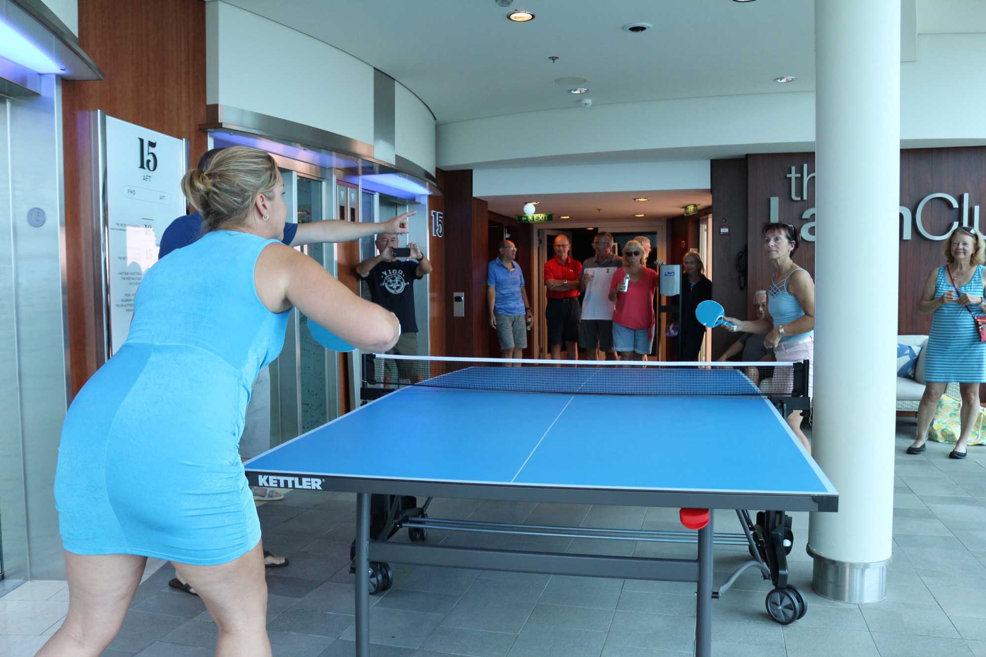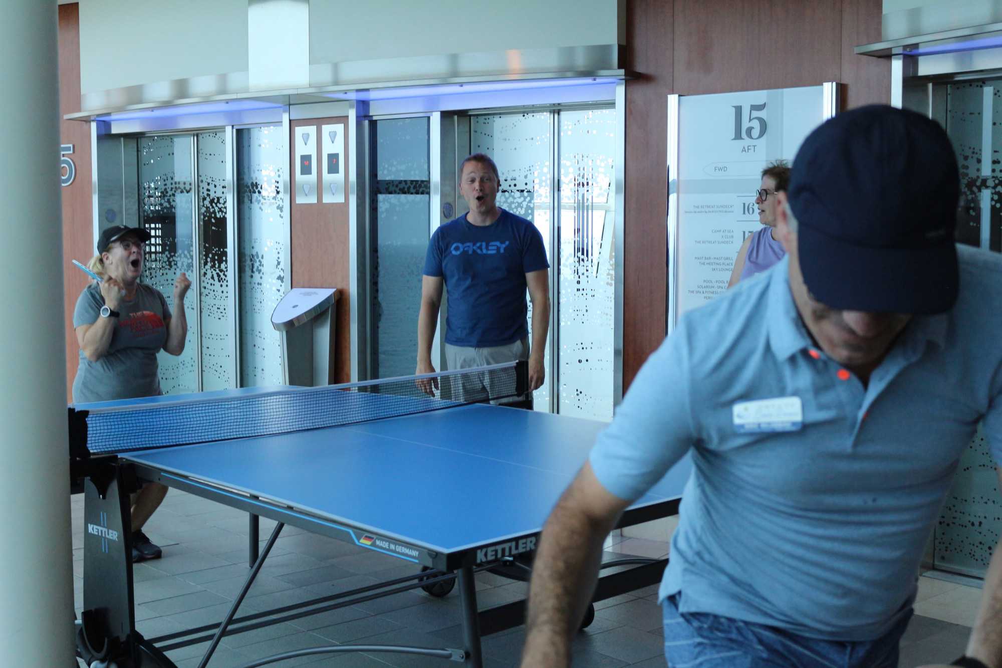 Nous avions déjà passé le détroit de Gibraltar lorsque nous nous sommes réveillés ce matin. Le navire longe maintenant la côte occidentale de l’Afrique sur des eaux calmes et d’un bleu profond. Les seules vagues présentes sont celles qu’il créée par le long sillon turquoise laissé sur son passage. Une journée en mer sur un bateau de cette envergure où les activités ne manquent pas, nous permet d’apprécier ses moindres racoins ! Justement, Jocelyne et Richard en profitent pour pratiquer leurs pas de danse et en apprendre de nouveaux… Certains iront au gym, d’autres se rendront au Sky Lounge tout à l’avant du 14e étage du navire pour lire ou discuter tranquillement. Mais, Annie doit s’affairer à préparer la ceinture du vainqueur du 1er tournoi international transatlantique de ping-pong, Celebrity 2022. À 15 h 30 précises, les concurrents se rassemblent et les joutes commencent. La foule enthousiaste, encourage ses participants avec vigueur tels ceux d’une salle comble à Wimbledon ! Benoit qui arbitre de son mieux, voit ses décisions remises en question dans de grands éclats de rire ! Tout y est, quarts de finale, demi-finale et enfin, le vainqueur d’une partie aux échanges de balle épiques est Richard Dubé! Quel plaisir on a eu ! Nous avons déjà hâte de préparer une autre activité !!