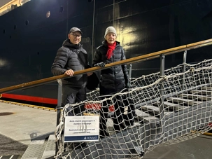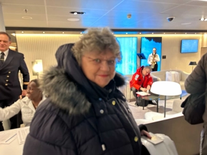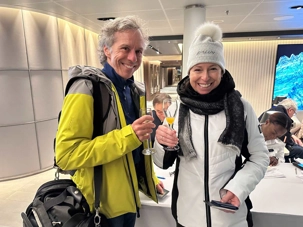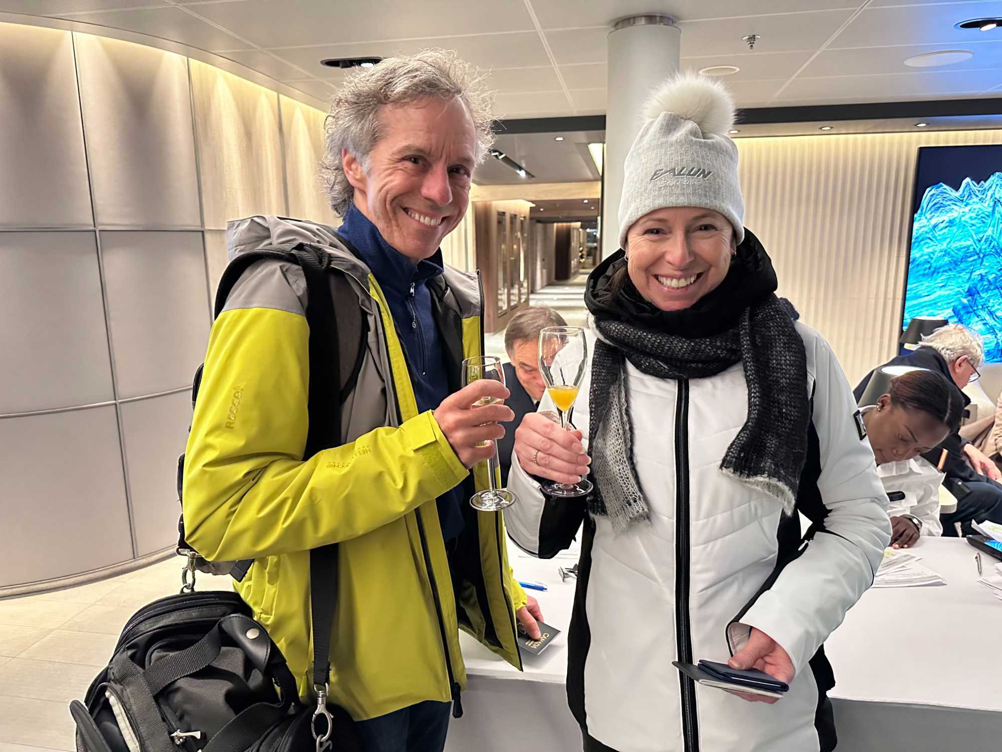 Maintenant le moment tant attendu de notre voyage approchait, celui de monter à bord du Commandant Charcot de la compagnie Ponant. Nous sommes tous fébriles et surtout prêts à monter sur ce navire d’exception. C’est une première pour moi aussi sur le Charcot. J’ai eu le bonheur de naviguer maintes fois sur les autres navires de Ponant mais le Charcot manquait à mon palmarès de beaux navires. Et je confirme, c’est plus qu’un beau navire, il est pour moi exceptionnel et je n’ai presque rien vu encore en ce moment. Nous montons tous à bord de notre hôtel flottant des 10 prochains jours avec grand plaisir. Déjà à notre arrivée, nous sommes accueillis par le commandant Charbel Daher et plusieurs membres d’équipage. Heureuse de le revoir à nouveau car il était aussi mon commandant sur l’un de mes voyages surprises fait sur un Ponant. Il avait vu mon nom sur le manifeste des voyageurs à bords et attendait l’arrivée de notre groupe. L’atmosphère est à la fête, le champagne coule à flot à notre embarquement et tout est en place pour que notre enregistrement se déroule dans la simplicité et dans la bonne humeur. Une superbe joueuse de saxophone accompagne ce moment unique de notre enregistrement. Quelques voyageurs en ont les larmes aux yeux et s’exclament tous, quel beau et incroyable navire!