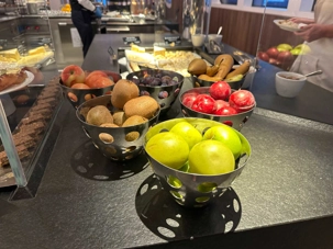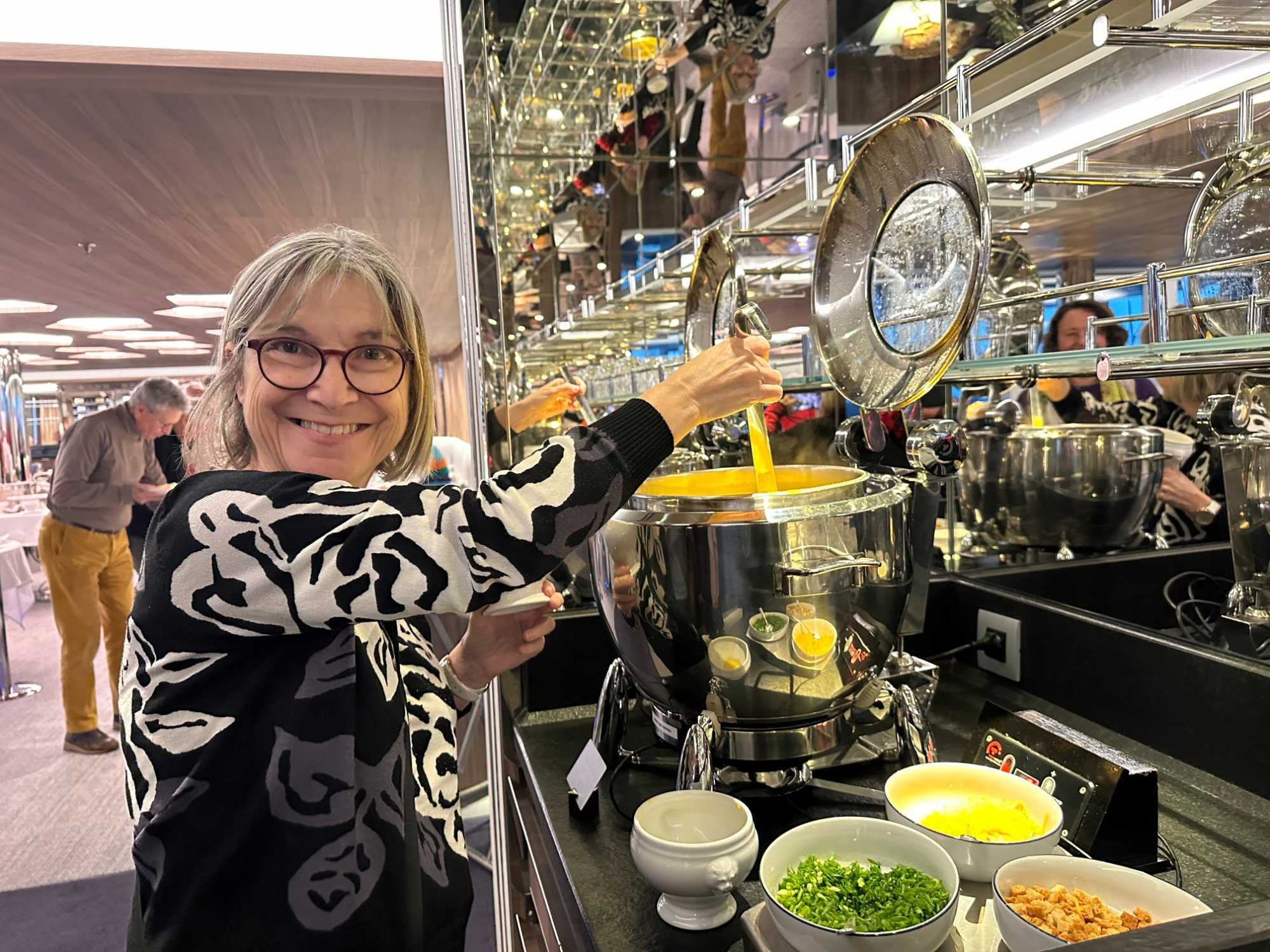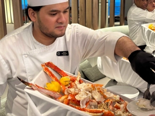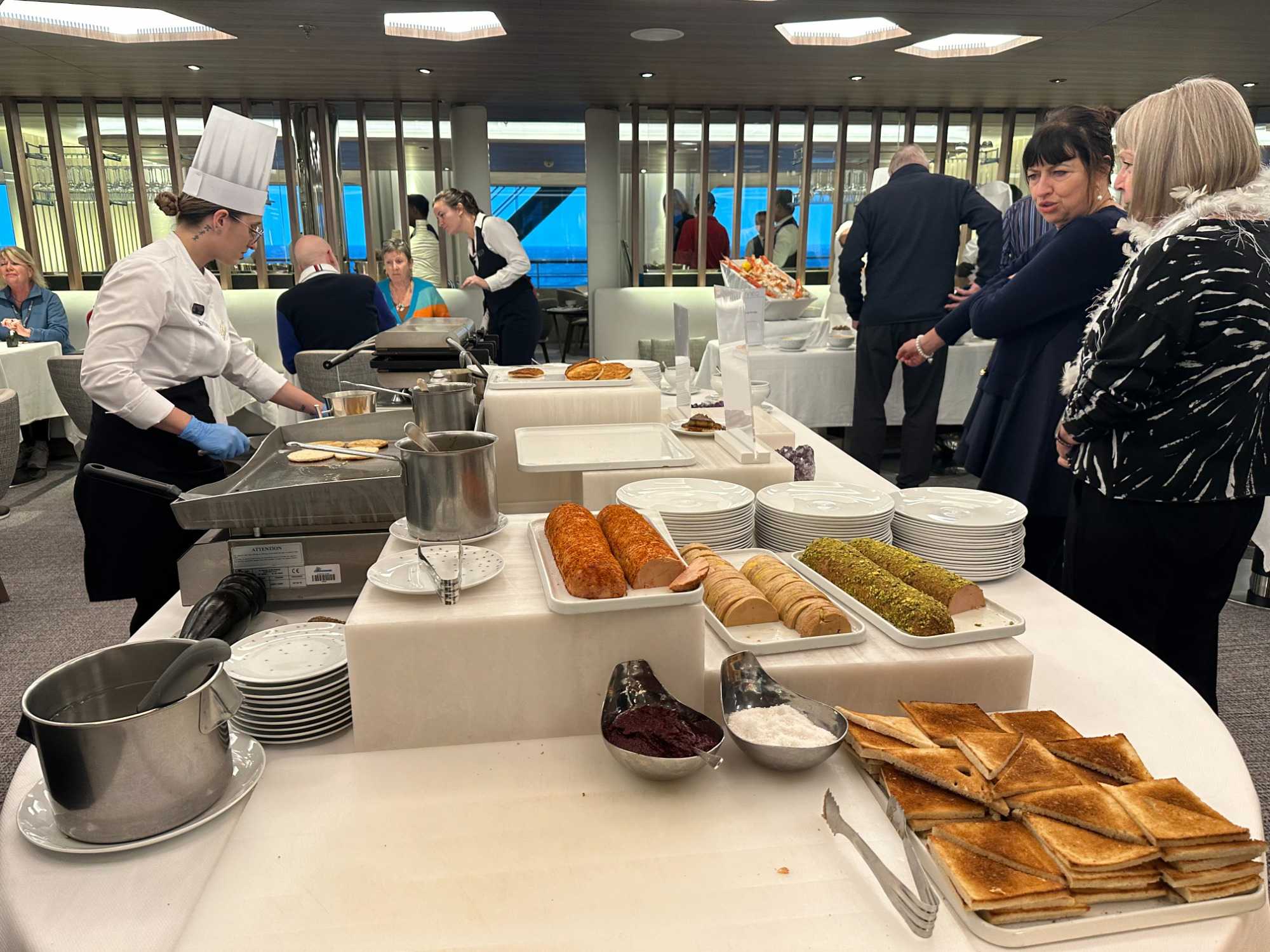 Après cette intéressante conférence de plus de 80 minutes nous sommes invités à un brunch spécial à la salle à manger. Tout était en place pour nous faire manger comme des rois. La présentation, le décor, les musiciens et chanteurs nous sommes traités aux petits oignons. Le champagne coule à flot et le bon vin également. Ce qui attire notre œil au buffet est les grandes pattes de crabe de la Norvège qui nous sont proposés, les grosses crevettes, et les huîtres pour ceux qui aiment les fruits de mer. Mais ne vous inquiétez pas car personnes ne sera en manque, les fromages, le foie gras poêlé, l’immense pièce de viande, le saumon, les pâtisseries etc sont à l’honneur. Un repas exceptionnel nous était encore une fois servi et c’est difficile de résister à de si bonnes choses. Les photos vous donneront le goût de venir essayer ce beau navire.