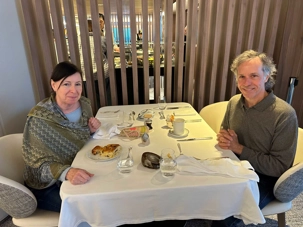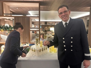 À 18 h 00 nous avons été conviés à un cocktail privé avec le Commandant Charbel qui se joindra à nous pour partager ce moment avec mon groupe. Une autre belle attention de Ponant que celui de nous faire partager une rencontre comme celle-ci où bien des voyageurs aurons la chance de poser quelques questions pour connaître plus sur Ponant et le navire. Nous nous sommes retrouvés tous ensemble pour ce moment accompagné de belles musiques au Pont 5 et d’un cocktail au champagne de Noël. Ponant sait bien faire les choses et nous sommes les premiers à pouvoir en profiter. Nous avons beaucoup discuté du Charcot et notre commandant était très intéressant et aussi passionné lorsqu’il nous parlait des expéditions polaires. C’est décidé pour ma part, je ferai cette belle aventure dans les prochaines années et plusieurs voyageurs sont intéressés de me suivre. Une autre belle soirée qui suivra avec notre repas à la salle à manger et oui on doit encore manger. Ce soir, pour ceux qui seront braves, nous pourrons aller danser sur le pont au party parka ou danse avec nos vêtements d’hiver sera au rendez-vous. Nous verrons les braves qui seront présents sur le pont pour danser et prendre un petit vin chaud!