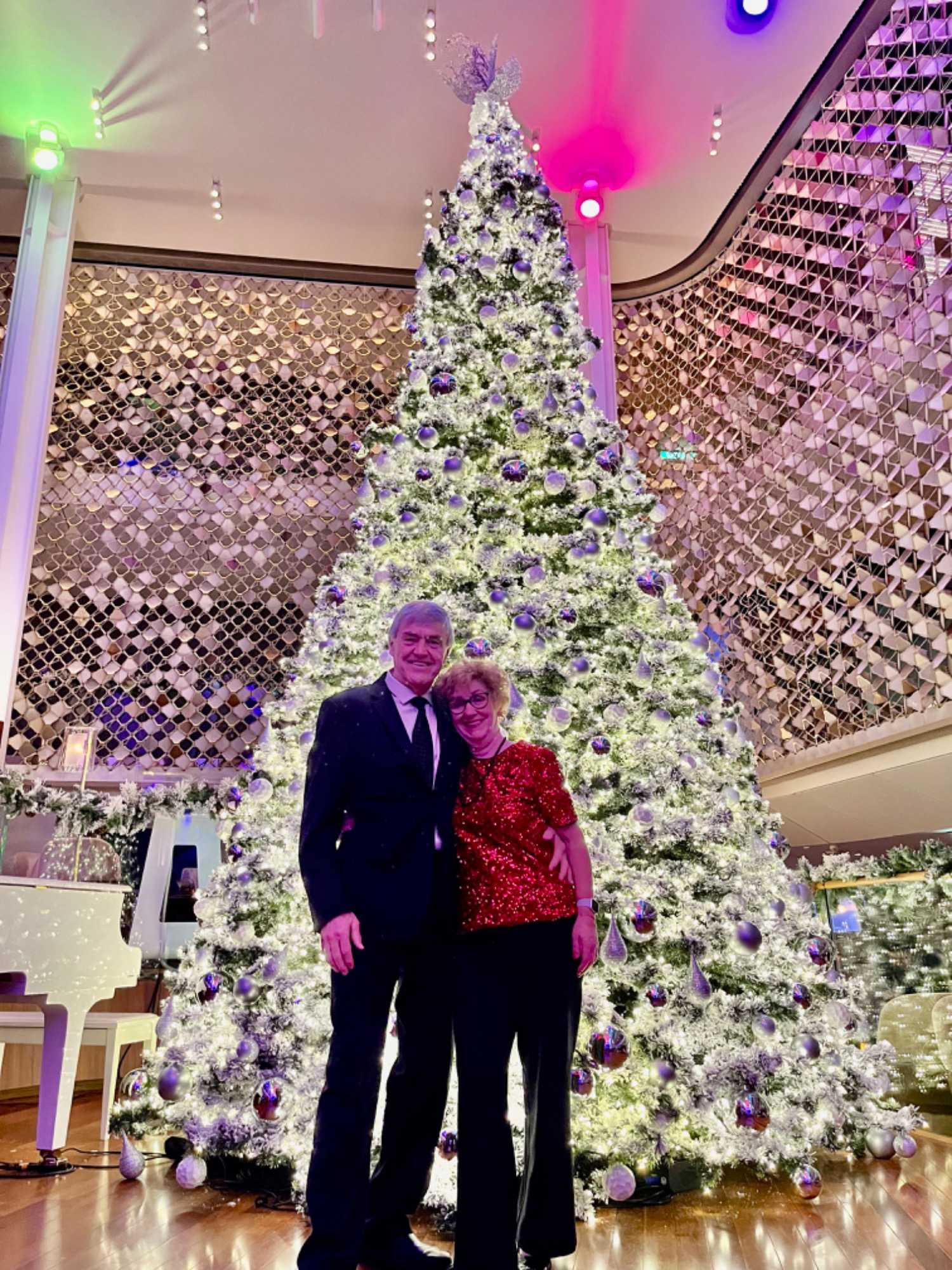 Ensuite, le grand spectacle très attendu de la soirée, « Crystallize », fait le bonheur de tous nos voyageurs. Le Théâtre est rempli à pleine capacité. C’est l’équipe de production de la compagnie Celebrity qui est en vedette ici. Il y a entre autres une violoniste, des musiciens, des chanteurs, des danseurs, des acrobates, tous performant dans une ambiance électrisante sous les effets lumineux enveloppant la salle entière. Il est rare de voir et d’entendre un spectacle aussi rythmé et plein d’énergie grâce à tous les effets spéciaux. La soirée n’est pas terminée, c’est la veille de Noël! On se promène sur le navire, la musique de Noël, les décorations et les sapins illuminés sont partout. Un peu plus tard, c’est la fête dans l’atrium du navire. Cet atrium est ouvert sur trois étages. En bas de l’atrium nous retrouvons le grand sapin tout illuminé au pied duquel un groupe de musique est installé pour nous faire entendre les plus beaux airs du temps des Fêtes et aussi plusieurs succès populaires. L’ambiance est vraiment à la fête, c’est certain, le navire est à pleine capacité.