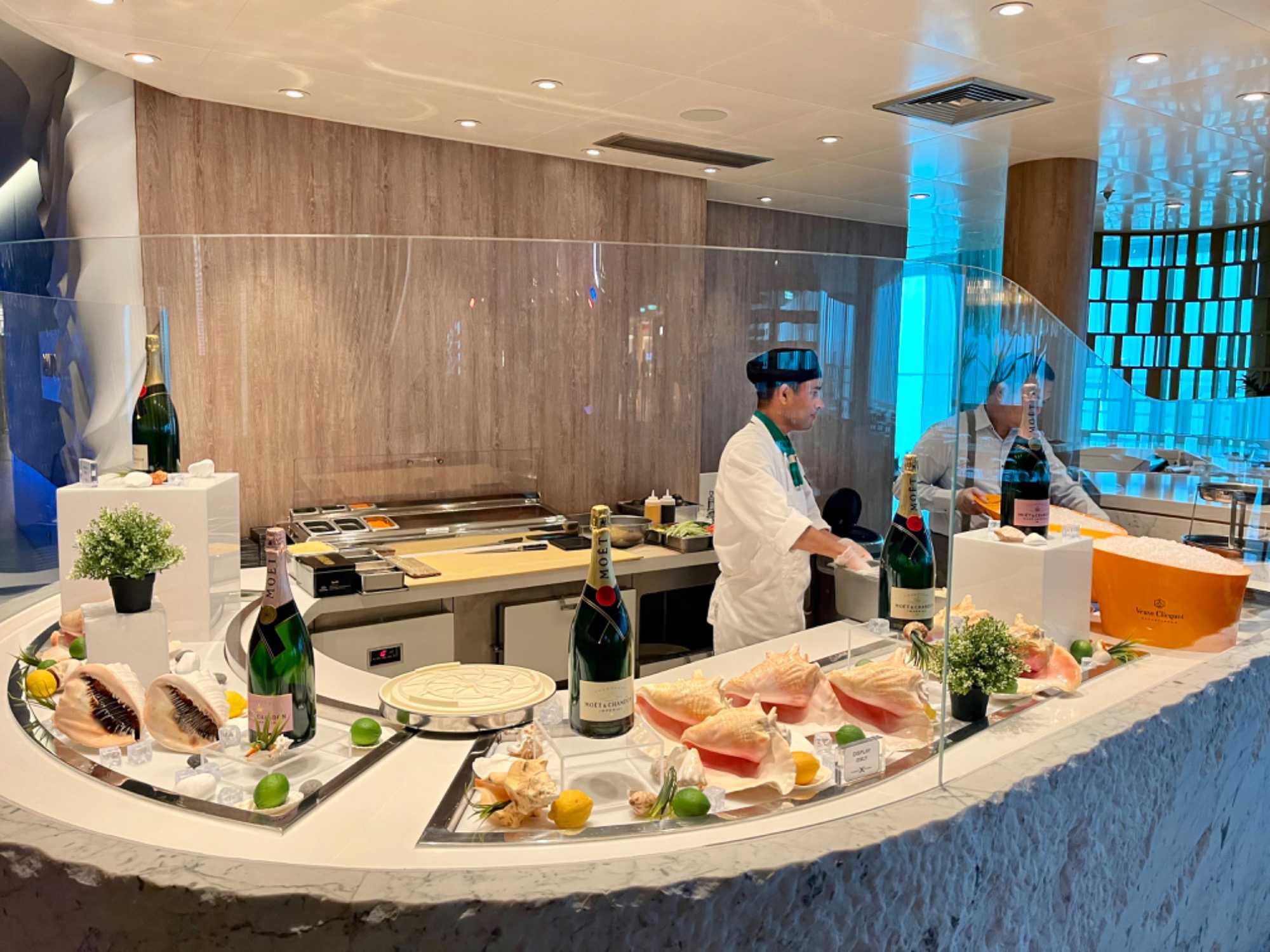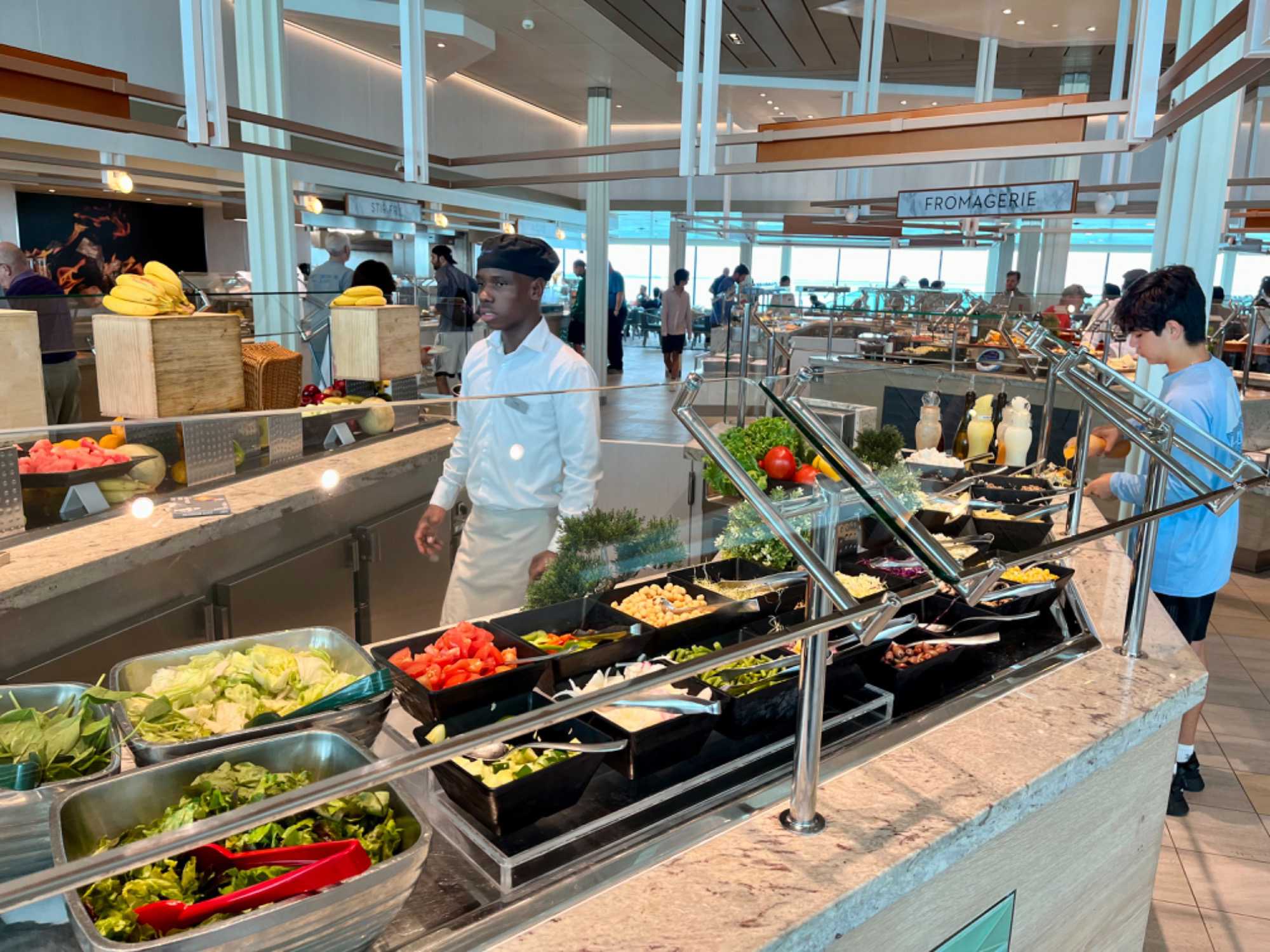 Après cette petite excursion, nous retournons dîner au navire. Nous avons pris plusieurs photos des comptoirs de l’Oceanview Cafe pour vous montrer la finesse des présentations et la grande variété des mets de ce fabuleux endroit utilisant une formule du type « buffet ». Aujourd’hui, la thématique de l’Oceanview Cafe et l’inspiration du chef cuisinier est basé sur : « les caraïbes »! On profite de toutes les belles installations que nous avons sur l’Apex pour se la couler douce!