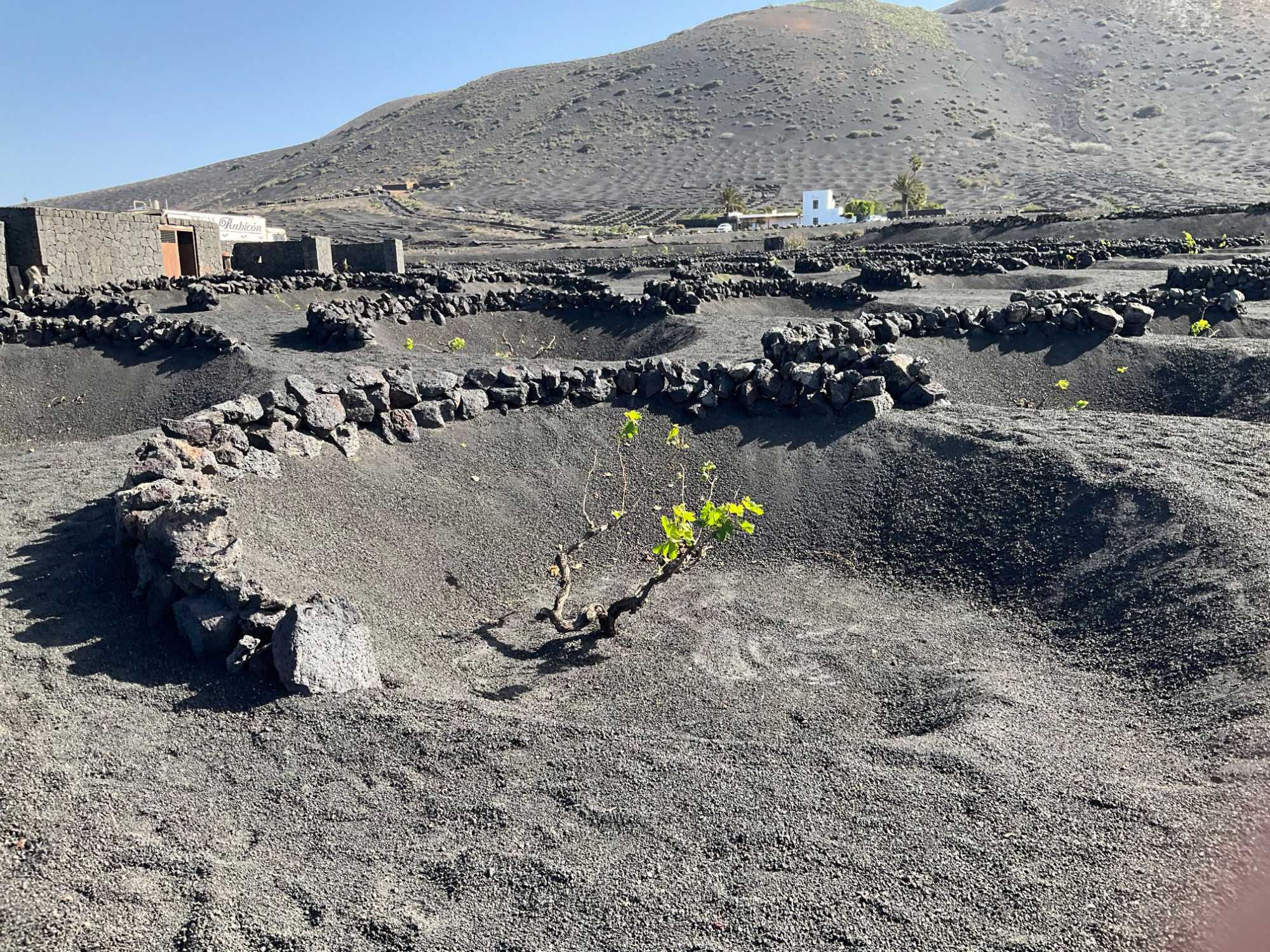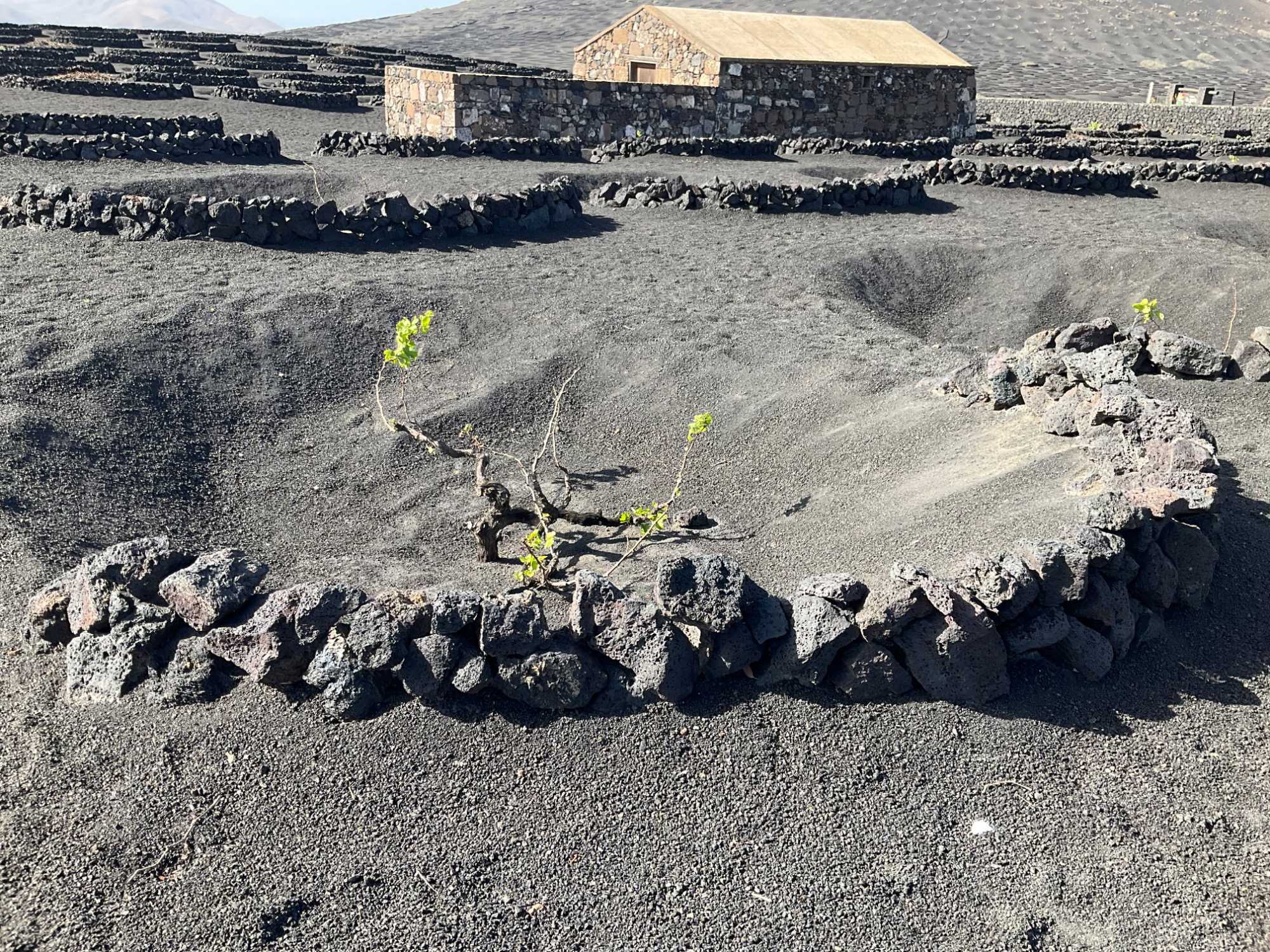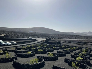 Un arrêt aux vignes de la Geria nous a dévoilé un spectacle étonnant qui incarne l'ingéniosité des habitants de l'île face à un environnement aride et volcanique. Pour protéger les vignes des vents forts des Alizés et, de la chaleur intense, les Lanzaroteños et les Lanzaroteñas, ont développé une technique innovante. Ils creusent des fosses circulaires appelées hoyos dans le sol, les remplissent de cendres et de pierres volcaniques, puis plantent les vignes dans ces petits cratères. Ces parterres de vignes affichent de minuscules paysages lunaires. Leurs murs de pierre semi-circulaires, connus sous le nom de zocos, protègent les plants des éléments tout en capturant l'humidité de l'air de l’eau condensée par la variation des températures entre la nuit et le jour.