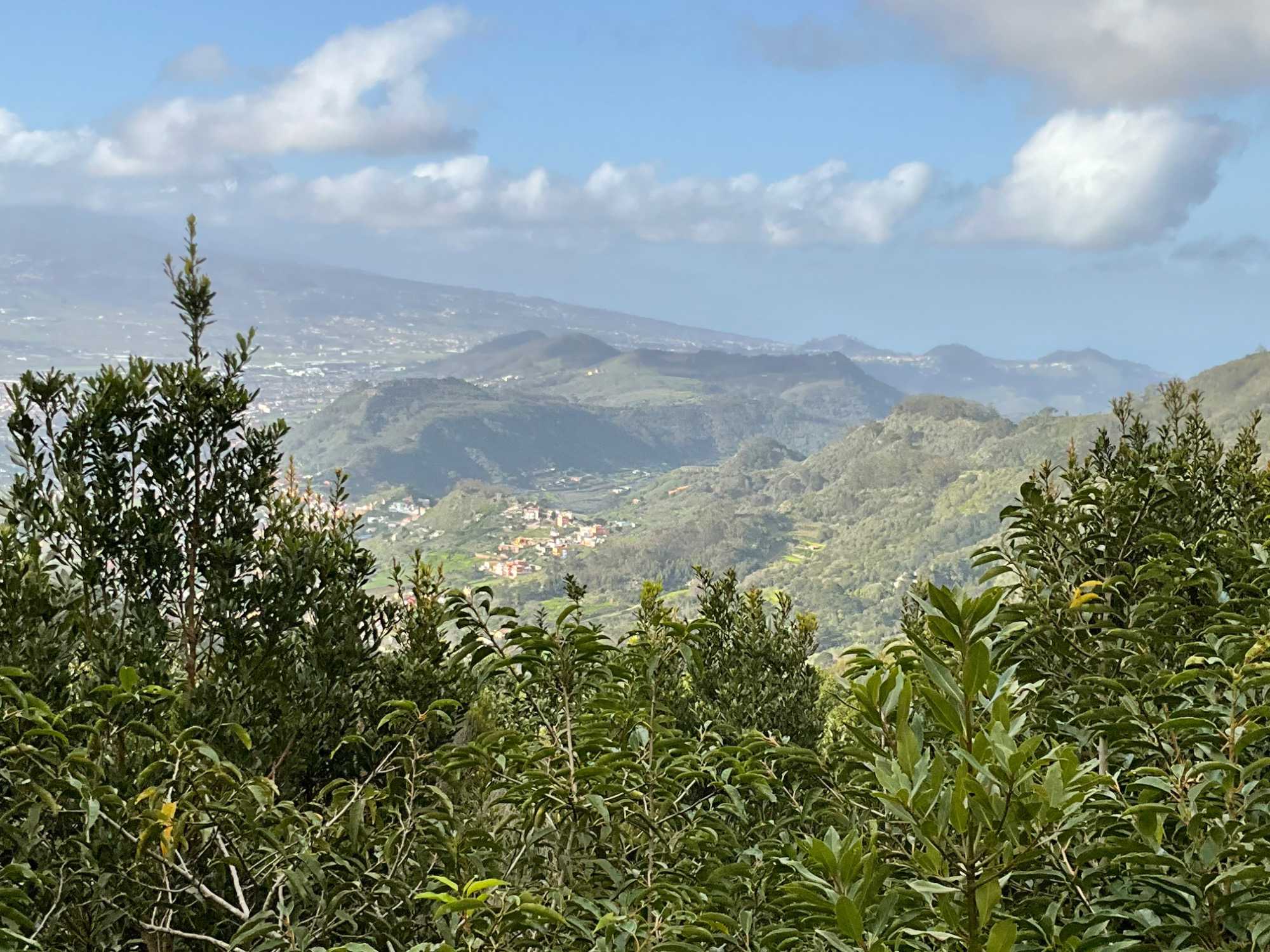 J’avoue qu'on préfére tous laisser le soin à Rachel, le soin d'amener nos voyageurs en montagne. Cette route étroite en S possède à peine l’espace pour un véhicule…et demi. Après la montée de las Mercedes, nous voilà tout en haut du Parc Rural d'Ananda. Et talam!!! La vue panoramique sur les montagnes de même que les petits nids des villageois de la vallé s'offre à nous. Ce que peu de gens savent c’est que les îles sont les pics de montagnes volcaniques qui se sont effondrés il y a plus de 150 000 ans et que l’une des montagnes qui formait l’île de Tenerife était plus haute que le Teide. Des éruptions postérieures sont à l’origine de Las Cañadas del Teide. On le voie bien d'ici ce Teidi, aujourd'hui il est ...recouvert de neige. Qui aurait cru voir de la neige dans les îles canaries! Un tableau grandiose! Les feux de forêt des étés précédents ont détruit la zone… du cou du canard (positionnement signifiant en haut de l’île). Dans les faits, la végétation de ce parc rural d’Anagha me fait penser à la végétation luxuriante et variée d'Hawaï. De par son altitude élevée, les montagnes arrêtent les nuages et ces derniers y déversent la pluie et y laissent de l' humidité…en grande quantité.Notre deuxième arrêt nous permet de visiter un petit centre d'interprétation de la nature où nous avons amplement le temps de bénéficier des connaissances en sciences nature les de Patricia.