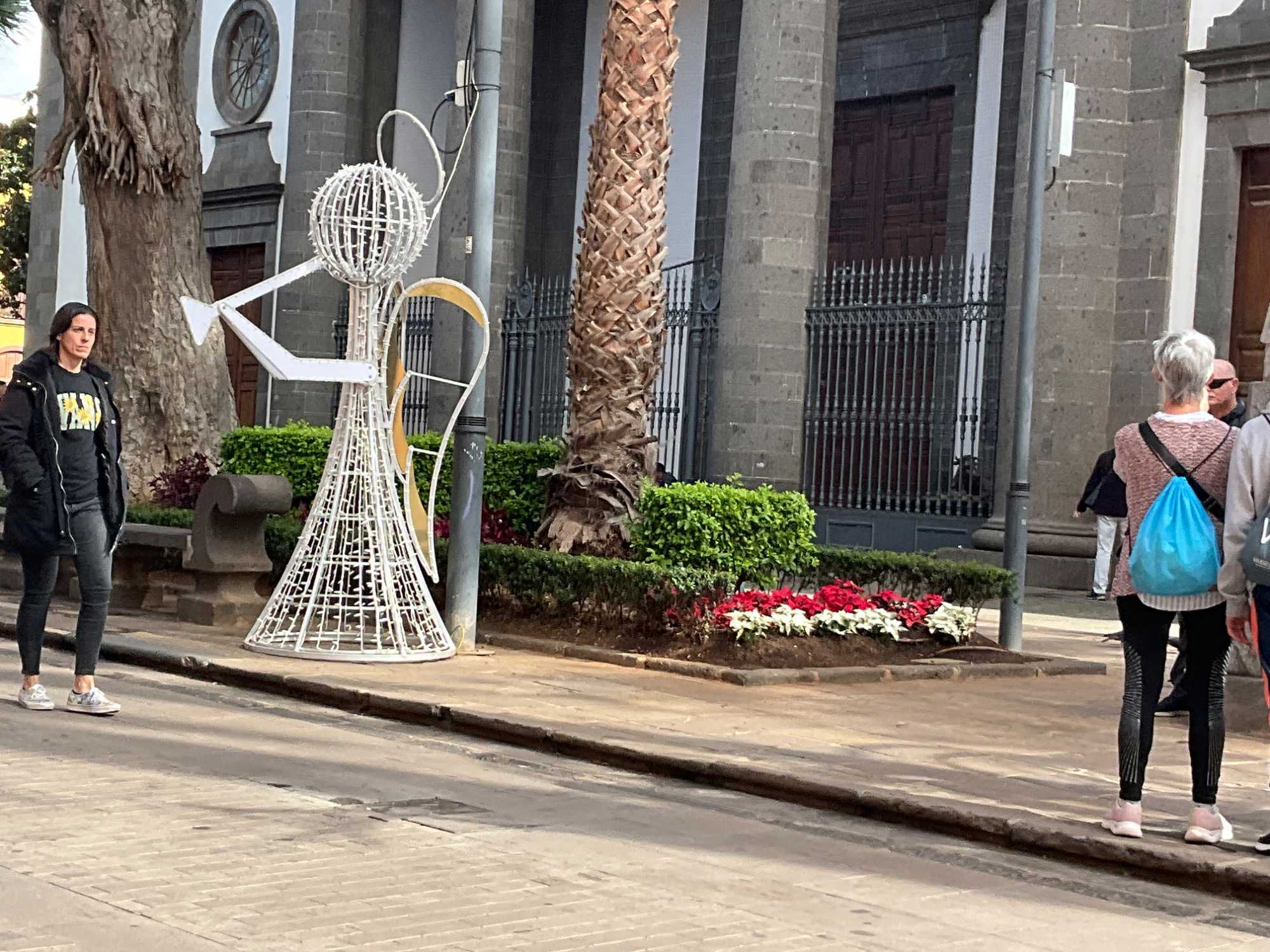 Nous avons donc eu p sept heures pour découvrir Tenerife. Dès notre arrivée au port de Santa Cruz, nous optons pour un tour de ville en autocar car la ville est trop grande pour la visiter à pied. En sortant du port, on croise l'église de l'Immaculée Conception ...sans ses cloches, le musée militaire, puis on circule sur La Ramblas, version miniature de celle qui porte le même nom à Barcelone. La ville impressione par sa diversité et ses espèces exotiques (flore). En rafale, voici ce que nous avons pu admirer: d’abord une horloge « florale » gigantesque montée de poinsettia, ensuite l’arbre du voyageur…"le flamboyant" qui a lui-même voyagé de Madagascar, surnommé ainsi pour son pouvoir désaltérant de l’eau conservée à la base de ses feuilles. On a croisé le palmier des canaries. Pour vous faire une idée de l’arbre, sa silhouette ressemble à un gros ananas. Notre guide Patricia, grande botaniste à ses heures, nous présente le jacaranda, le ficus mais.. qui n'est pas celui qui donne les dattes, le dragonnier genre de pin (on n’allait quand même pas l’oublier celui-là). Puis il y a des eucalyptus, des lauriers, des avocatiers , un manguier...Ce qui nous éblouit, ce sont tous ces points settias rouge qui forment une allée dans les rues, surmontés des palmiers. On a même vu un pointsettia "arbre ", une première. On apprend que Tenerife est un grand producteur de bananes. Bon ça va, fini le cours de botanique 101, on poursuit la visite.