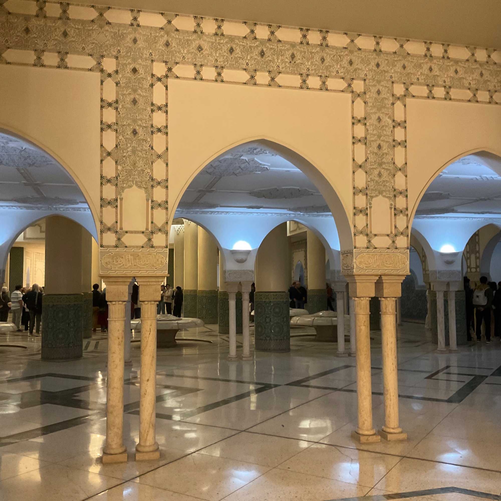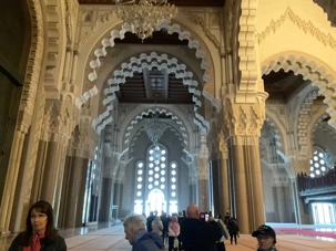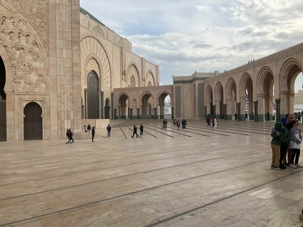 Le coup de cœur de tout le groupe, la majestueuse mosquée Hassan II. Impossible de la manquer avec son minaret carré de 210 mètres de hauteur, le plus haut au monde, on dirait un phare carré orienté vers la Mecque. Seule mosquée ouverte aux non musulmans, elle nous laisse sans voix. Véritable œuvre d’art, l’architecture reflète l’ingéniosité et l’habileté de tous les corps de métier de la tradition marocaine. Les détails sont subtils et toujours significatifs. Les majestueux plafonds en bois de cèdre, céramique, granit, tous les matériaux viennent du Maroc (95%) excepté les 50,000 mètres carrés de marbre qui viennent de la célèbre carrière de Carrare en Italie et, les somptueux et élégants lustres dénichés à Murano, Venise. Les céramiques relèvent d’un art remarquable qui nécessite trois jours de travail le mètre carré. Le plafond de la mosquée s’ouvre en deux,(tiens, on devrait peut-être leur demander des trucs pour le toit de notre stade olympique ) et donne 25 000 places à l’intérieur et 80 000 à l'extérieur. Attention! pas de siège, on ne s’asseoit pas à l’intérieur, on prie, les pieds nus et collés. Quand vient l’heure de l’une ou l’autre des cinq prières du jour, c’est le “muezzin” qui dirige la prière dans les super microphones de la mosquée. Ce monsieur aurait été choisi pour les qualités exceptionnelles de sa voix. L’histoire ne dit pas si c’est un baryton ou un ténor! Sadik explique les rites pour les ablutions aux fontaines, femmes et hommes séparés bien sûr. Enfin, la mosquée Hassan II se classe troisième au monde pour sa superficie. Débutée en 1986, il a fallu 7 ans pour la construire, 8500 artisans, 2500 ouvriers, 80 millions d’heures et …750 millions de dollars canadiens.