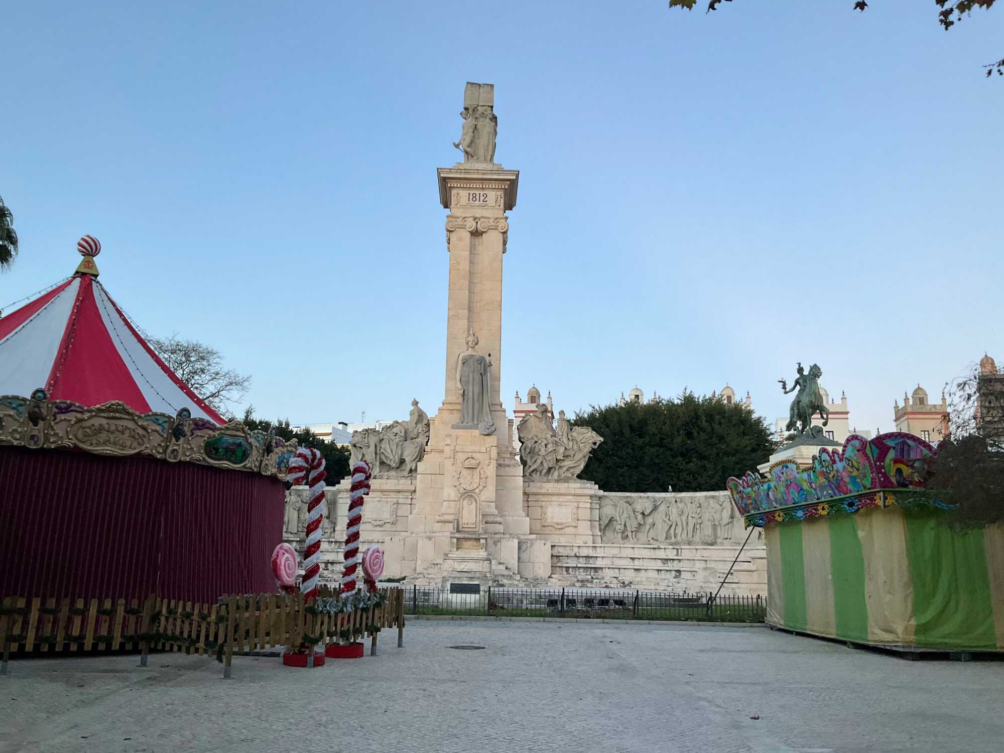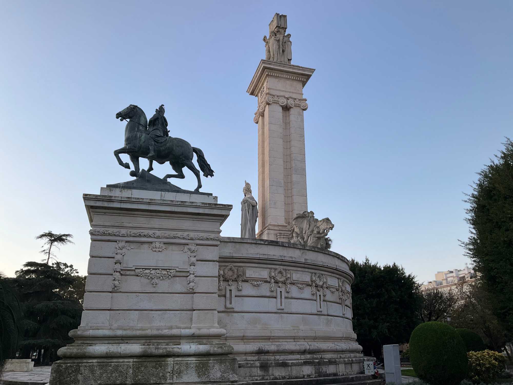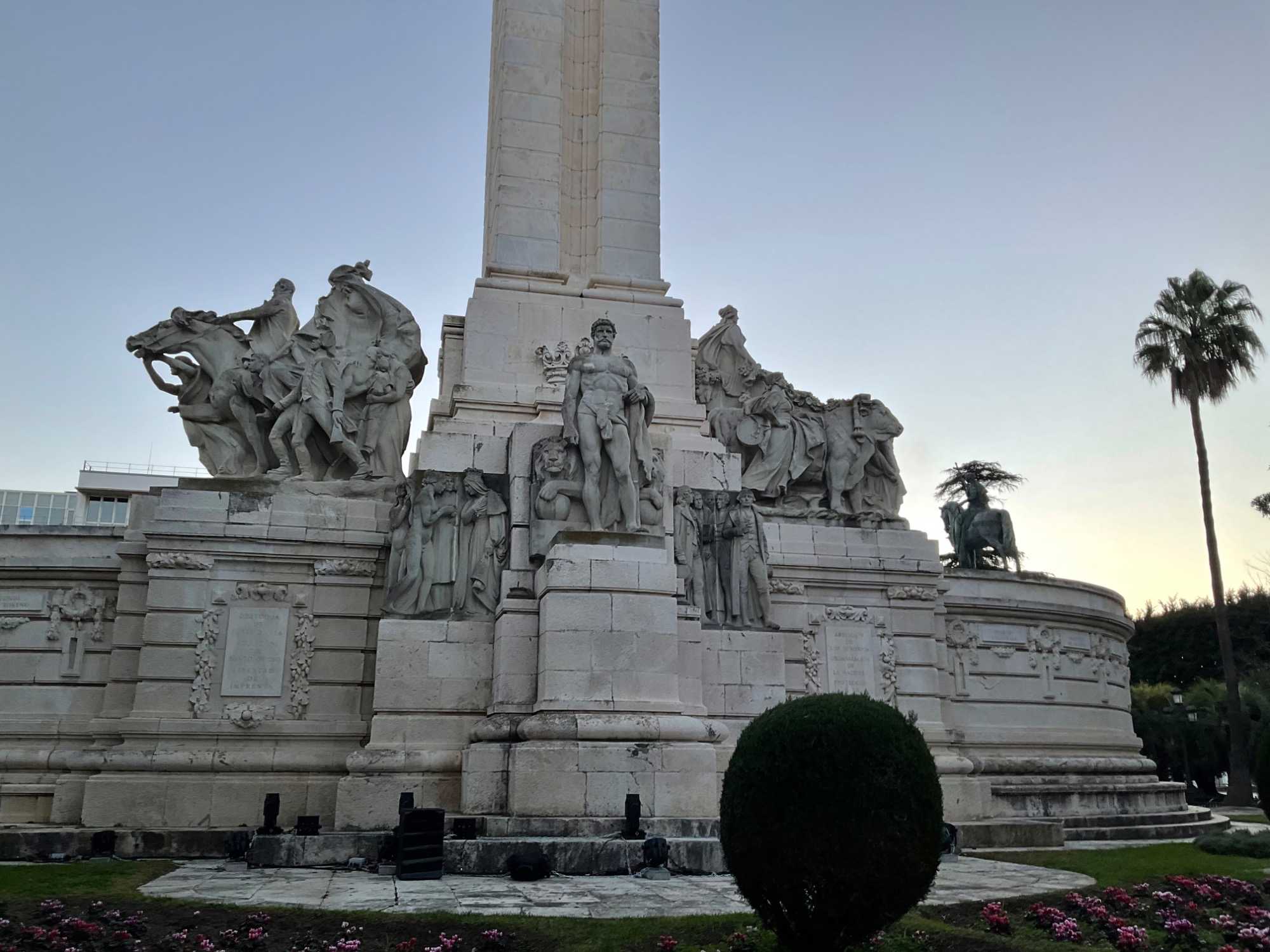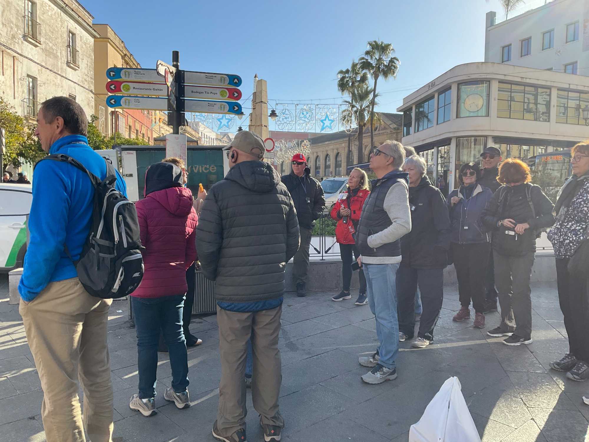 Notre rencontre avec Cécile, notre guide, est prévue pour 8:30. Nous sommes tous là, ‘’comme un seul homme’’ ...elle aussi. Après les présentations d’usage de notre femme de confiance, on se sent d’attaque pour découvrir ll’ampleur du territoire de la ville et surtout de l'intérêt de chacun de ses quartiers. Elle nous convie dans un premier temps, à une visite à pied. On y a vu des sculptures, des monuments et elle nous a dirigé vers la mer pour avoir une idée de la proximité de cette dernière. On y reviendra en fin de journée pour compléter notre balade à pied. Pour bien situer Cadix, Cécile mentionne que la ville a la forme d’une main pour la vieille ville et, d’un avant-bras pour la nouvelle ville. Située au sud-ouest extrême de l’Europe occidentale, elle fait 12 km carrés dont 6 km de long sur 2 km de large. Ville la plus ancienne d’Espagne (3000 ans d’histoire) grâce à sa situation sur le bord de la mer, tous ceux qui ont traversé Gibraltar n’ont pas réussi à la conquérir, même pas Napoléon. Fondée par les Phéniciens en 1104 av. J.-C., la ville a connu plusieurs épopées aussi fascinantes les unes que les autres. À l’époque des grands explorateurs espagnols au 15e siècle, ces derniers rapportaient de nombreux trésors des Amériques et ils élurent Cadix comme port d’attache, faisant ainsi de la ville l’une des plus florissantes d’Europe grâce à ses activités commerciales. C’est sûrement pour cette raison qu’elle fut la cible de nombreux groupes de pirates. De nos jours, Cadix est connue pour son passé opulent dont les empreintes sont encore présentes, mais aussi pour ses plages et ses festivals. En 1980, on y a découvert enseveli jusqu'ici, un théâtre romain datant du 1er siècles avant JC.