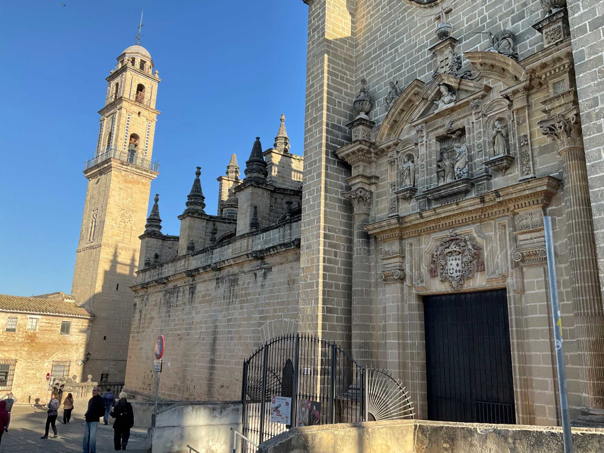 À Jerez, nous n’avons pas assez d'yeux lors de notre promenade à pied pour tout admirer. D’abord, l’Alacazar, cet ensemble de bâtiments fortifiés défensifs d'origine almohade (3000 ans), auxquels ont ensuite été ajoutés des tours, des palais palatiaux baroques, et qui est l'un des principaux monuments de la ville ; dans le coin sud-ouest de la muraille qui entourait la ville. Cécile nous rappelle que la forteresse servait de palais-forteresse à Jerez musulman, siège du pouvoir qui gouvernait la ville. Il est actuellement utilisé pour célébrer des événements et est ouvert aux visites touristiques toute l'année.Il demeure l’un des rares exemples d’architecture almohade existant dans la péninsule ibérique.