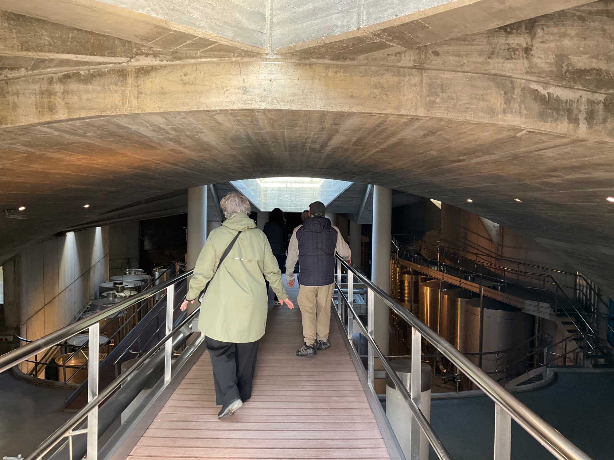 Ce qui est particulier dans les caves, ce sont les immenses murs de pierres que le vignoble a su conserver pour construire ses caves. On se croirait dans la caverne d'Alibaba, sublime et en plus, des œuvres d'art géantes complètent le décor ici et là près des grandes cuves en stainless.