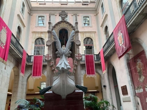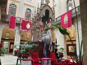 Maria a su convaincre les agents de sécurité de la mairie de nous laisser entrer dans cet édifice. Pour nous accueillir, une marionnette géante ressemble étrangement à Frida Kahlo. Un peu plus loin, un bateau flottant ...dans les airs, représenterait un cercueil, mais sans son occupant. De magnifiques toiles figuratives sont suspendues ici et là dans la mairie.