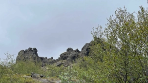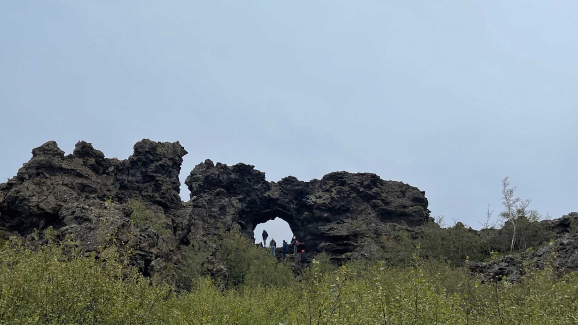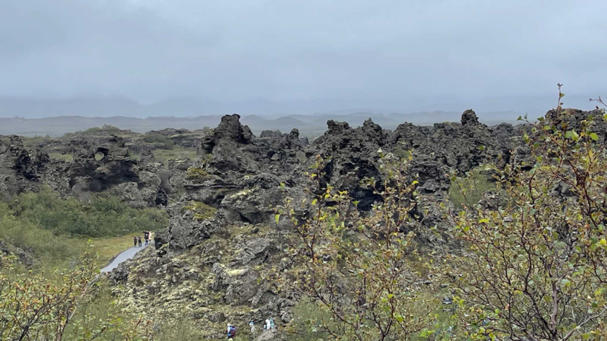 Direction Dimmuborgir, zone protégée depuis quelques années, le site a été formé il y a plus de 2300 ans au moment où une éruption volcanique a violemment touchée la région. La lave s’est alors écoulée dans une fissure de 12 kilomètres de long au sud du cratère Hverfjall. Un lac de lave s’est alors créé puis s’est solidifié. Les échappements de vapeur d’eau du terrain ont refroidi la lave lors de leur remontée dans le lac, provoquant des formations en colonnes et créant les sculptures de lave étonnantes. Certaines chambres de lave sont assez grandes pour y contenir une ou plusieurs personnes, d’où le nom de « châteaux » lorsque l’on parle de Dimmuborgir. Les formes inhabituelles de la lave donnent un air particulièrement mystérieux et magique à l’endroit. Le décor chaotique, fait de cônes, de cheminées, de trous, ressemble à une ancienne citadelle et les légendes nordiques décrivent l’endroit comme la porte d’entrée de l’enfer. L’endroit est sauvage, mais la végétation a réussi à trouver racine ici, la verdure contrastant nettement avec le noir des structures de lave. On y trouve des bleuets sauvages, Patrice ne manque pas d’en cueillir lorsqu’il y en a! Dimmuborgir est d’ailleurs à l’origine de plusieurs contes populaires dans lesquels les formations rocheuses sont des trolls, des fantômes ou encore des elfes. Selon un de ces contes, les « Yule Lads », des frères trolls qui étaient à l’origine des fauteurs de troubles, causant des méfaits chaque nuit. Il semble qu’ils aient été influencés par le Père Noël pour devenir des donneurs de cadeaux.