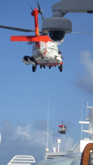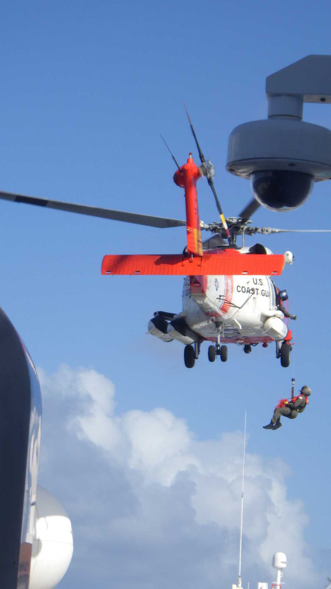 Mais... une urgence médicale a un peu chamboulé notre quiétude. Le capitaine nous a avisé vers midi qu’il y avait une personne à bord avec un grave problème de santé et qu’il fallait l’évacuer par hélicoptère vers Porto Rico. Ce fut le début d’un après-midi rocambolesque, je vous le jure. La garde côtière américaine est arrivée afin de faire un travail dangereux et spécialement spectaculaire. Nous étions tous dehors à regarder le déroulement de l’opération avec le cœur rempli d’émotion et de tristesse. Grâce à Dieu, ce n’était pas quelqu’un de notre groupe. C’était vraiment comme dans un film d’action. Finalement, après quelques heures, tout s’est bien déroulé et le patient fut évacué vers l’hôpital de San Juan. Il pourra maintenant recevoir les soins adéquats avec des équipements spécialisés. Nous n’avons pas eu beaucoup de nouvelles sauf que son état était stabilisé et qu’il était entre bonnes mains.