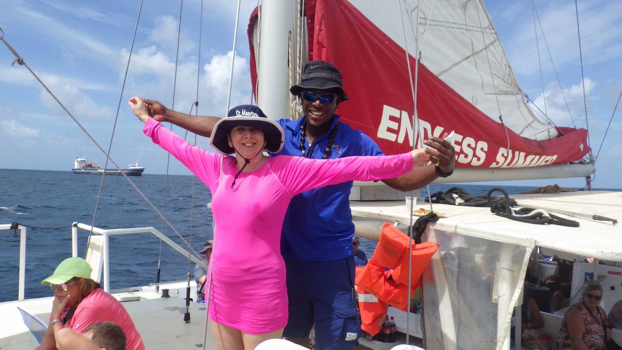 La brise rafraîchissante balayant la mer des Caraïbes offrait ce moment préservé alors que notre catamaran naviguait le long de la pittoresque côte nord-ouest de l'île en direction du magnifique site national de Pigeon Island. Certains voyageurs se sont promenés le long de la plage et même plusieurs se sont baignés. Pendant ce temps, d’autres sont partis avec moi le long des charmants sentiers menant au fort historique. Nous avons parcouru le littoral accidenté de l'île avant de partir pour la baie de Marigot, un magnifique port naturel entouré de collines boisées luxuriantes qui touchent les eaux cristallines de la mer des Caraïbes. Ensuite, ce fut une rencontre rapprochée avec les deux bouchons volcaniques montagneux, The Pitons. Nous avons aussi avec notre catamaran encerclé la base de ces pics naturels emblématiques émergeant des profondeurs du fond de l'océan et s'élevant dans les nuages. Un délicieux petit lunch nous a été servi avant une baignade rafraîchissante dans une baie isolée. Wow ! Je peux vous dire qu’il m’a fallu mettre de la crème solaire deux fois… il fait beau par ici!