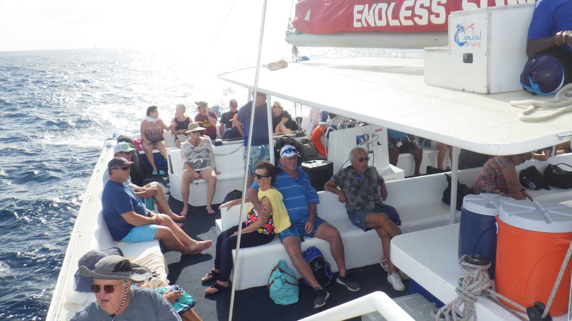 Nous sommes partis en fin d’avant-midi pour notre excursion Trésors de la Côte Ouest en catamaran avec un groupe de 20 personnes super enjouées et bien badigeonnées de crème solaire.