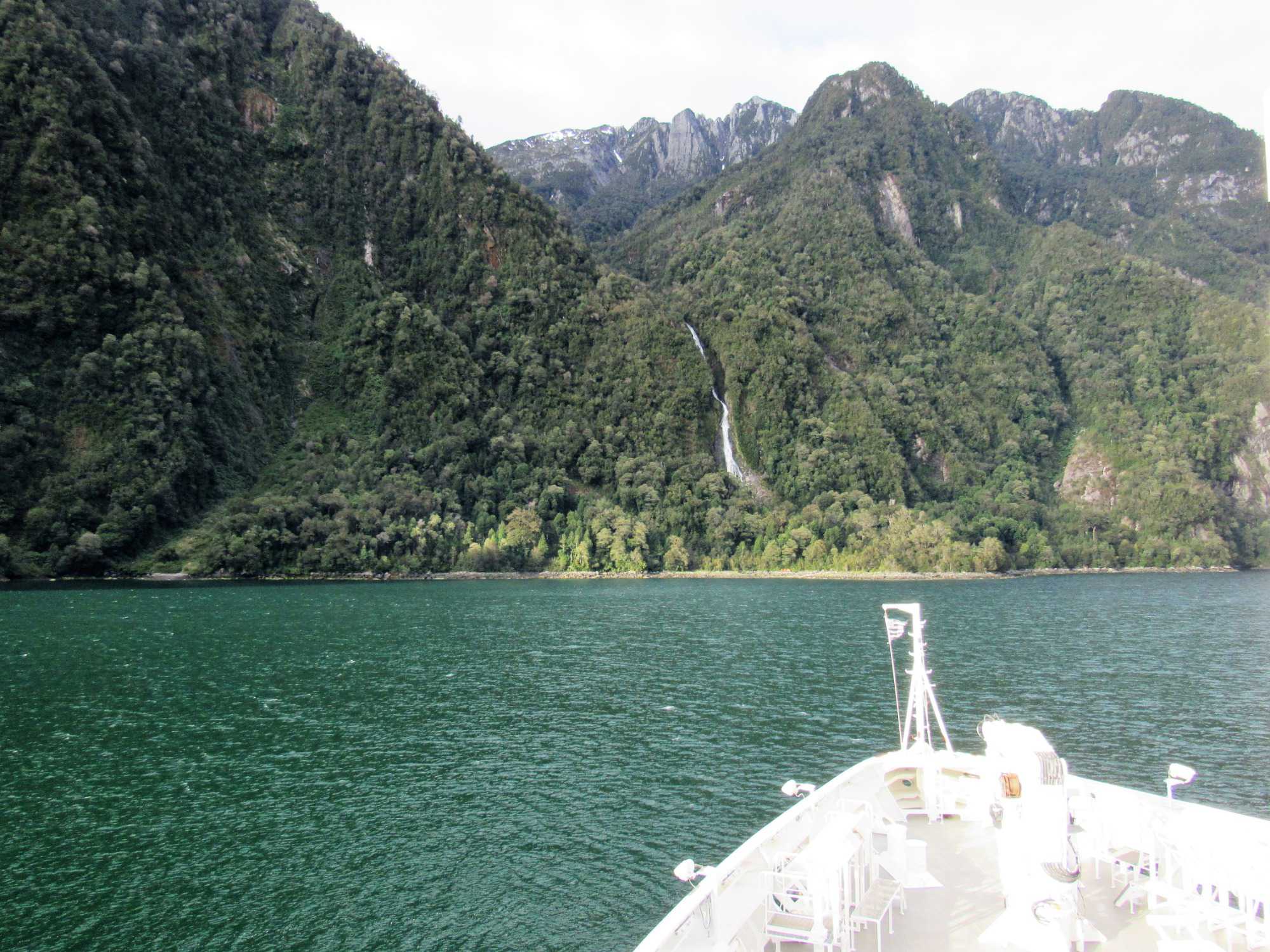 Les québécois sont de merveilleux voyageurs qui sont si conciliants. Nous nous retrouvons donc pour admirer la belle navigation jusqu’à une chute ou l’on aperçoit 3 tentes appartenant à des kayakistes qui se sont rendus avec leurs kayaks au pied de la belle chute. Ensuite le capitaine tourne tout doucement et rebrousse chemin. Les premiers Fjords nous ont bien plu mais le plus beau est, eh oui, à venir. J’ai la chance d’avoir fait cette navigation et on peut s’attendre à de grandioses découvertes.