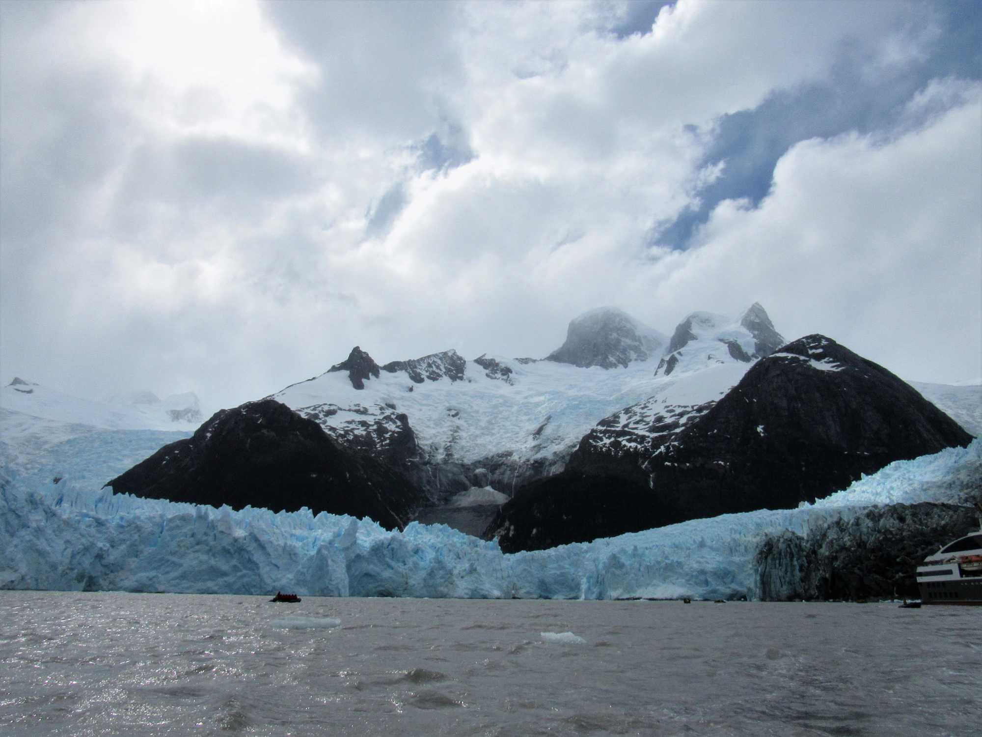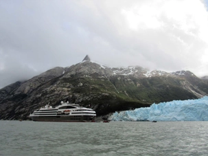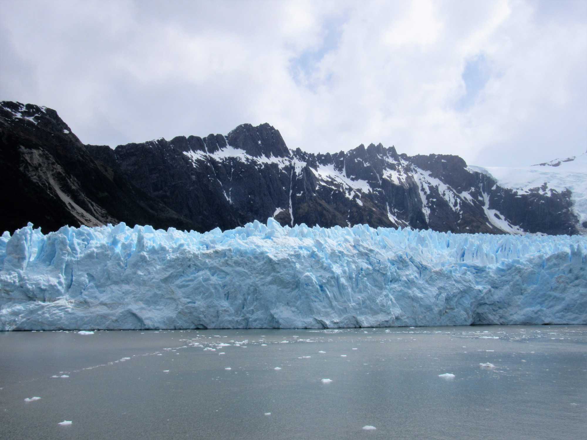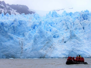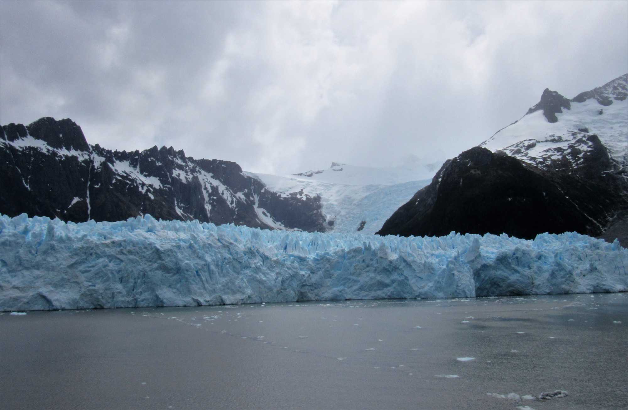 Je peux vous dire aujourd’hui, en écrivant mon récit, que ce fût pour le mieux car oui nous avons admiré ce beau glacier mais comme nous n’avons pas fait d’expédition zodiac nous avons rebroussé chemin et emprunté un autre fjord jusqu’au magnifique Glacier Pia ou=ù nous avons pu faire un débarquement en zodiac. Ce fût le summum car il est plus que magnifique ce dernier glacier et c’est celui qui restera marqué à jamais dans notre mémoire, ce Pia. Notre bateau fait demi-tour et jusqu’au dîner, il emprunte donc à nouveau le fjord Garibaldi puis le canal Beagle pour rejoindre le dernier grand glacier du voyage, et le plus impressionnant, le glacier Pia. En chemin, plusieurs cascades s'écoulent des glaciers pour se jeter dans le fjord. Quel spectacle! Je suis comme une girouette je sors sur le balcon, je photographie et m’émerveille, je rentre pour continuer d’écrire mes récits et immortaliser mes photos et je lève les yeux sur les paysages qui sont toujours plus beaux. Je recommence donc mon petit jeu tout le reste de la matinée.