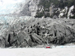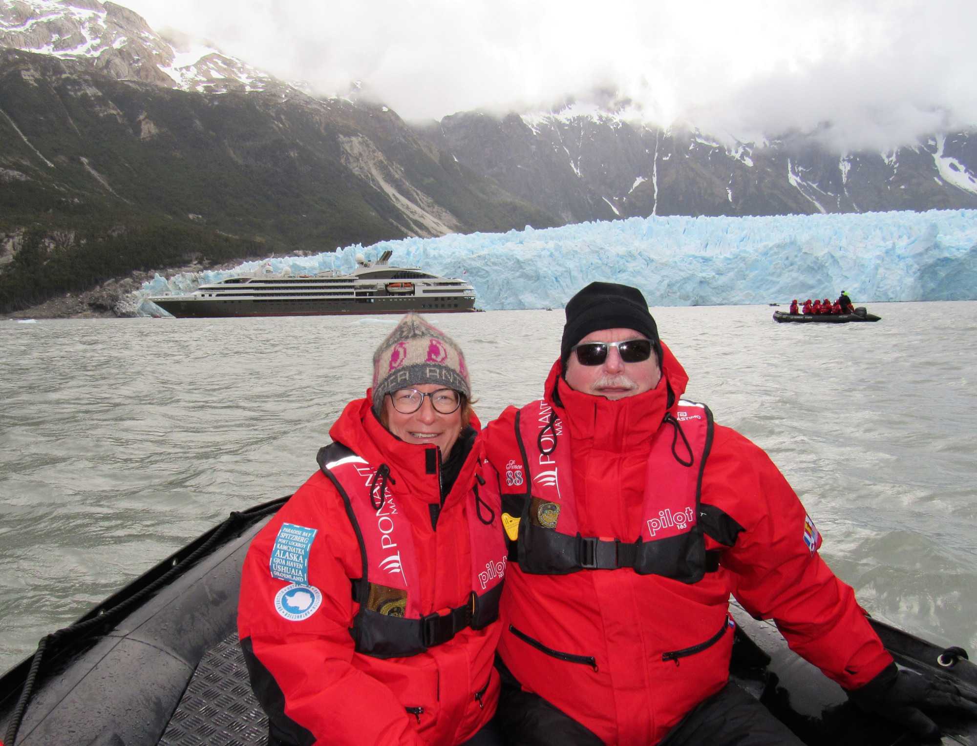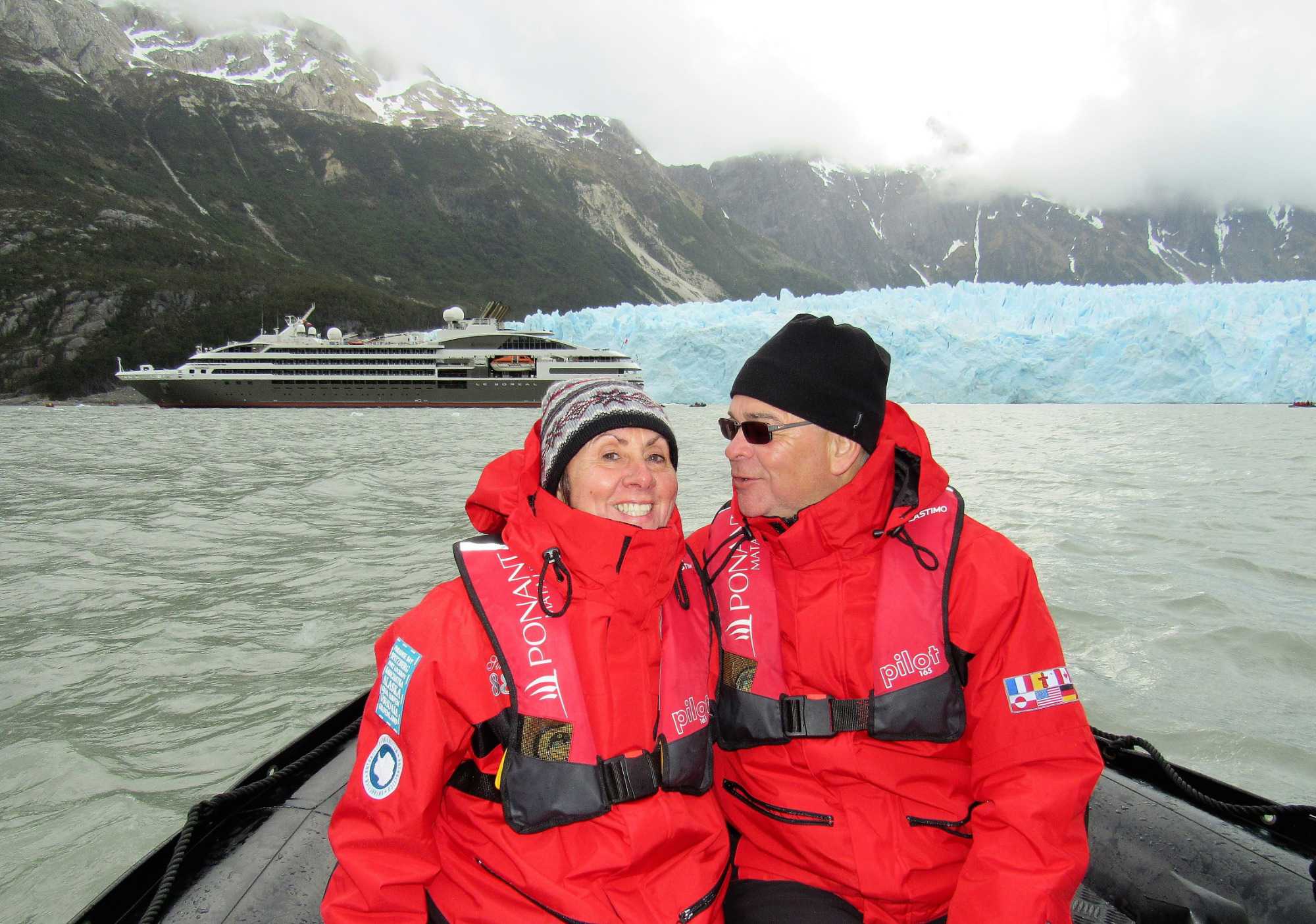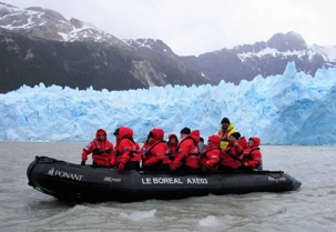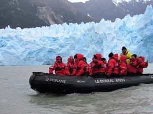 Tout de suite après le dîner on s’approche du glacier Pia. Le glacier Pia est d’après moi le plus important glacier visible durant notre voyage. Un colosse d’environ 1.3 kilomètre de large et long de plus de 3 kilomètres et sa hauteur d’après les livres serait de 100 mètres. Même à une distance de sécurité d’environ 400 mètres, chaque petit humain dans sa parka rouge à bord d’un zodiac et qui se promène devant semble n’être qu’un point de couleur. Le glacier Pia sans cesse en mouvement craque, explose et forme des crevasses. À intervalles réguliers, d’impressionnants grondements nous indiquent que des morceaux de glace se détachent du glacier et tombent dans l’eau avec grand fracas. Jusqu’à ce qu’un coup de tonnerre plus fort que les autres parvienne aux oreilles des voyageurs attentifs et curieux que nous sommes. Bien décidés à observer ces chutes de glace, nous attendons assis dans nos zodiacs ces moments inoubliables. Les vagues puissantes emportent avec elles ces débris de glace fraîchement tombés. Nous avons été chanceux et plusieurs blocs de glace se sont détachés durant notre balade en zodiac. Les glaciers peuvent parfois sembler sales, pollués par de larges trainées grises ou noires. En réalité, il s’agit de la moraine, une accumulation de roches, de sable ou d’argile transportés par le glacier durant son avancée. Surtout sur ce glacier le versant droit était tout gris comme sur les photos mais sous le gris prononcé on retrouve la glace rapidement. Rester quelques minutes face à cette immensité glacée est une expérience indescriptible. Aucune photo ne rend suffisamment forte cette ambiance unique et la sensation de puissance presque effrayante qui émane du glacier. De retour sur le navire pour un petit café bien mérité et heureux de cette superbe journée de navigation et de découvertes. Un pur bonheur!