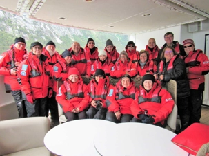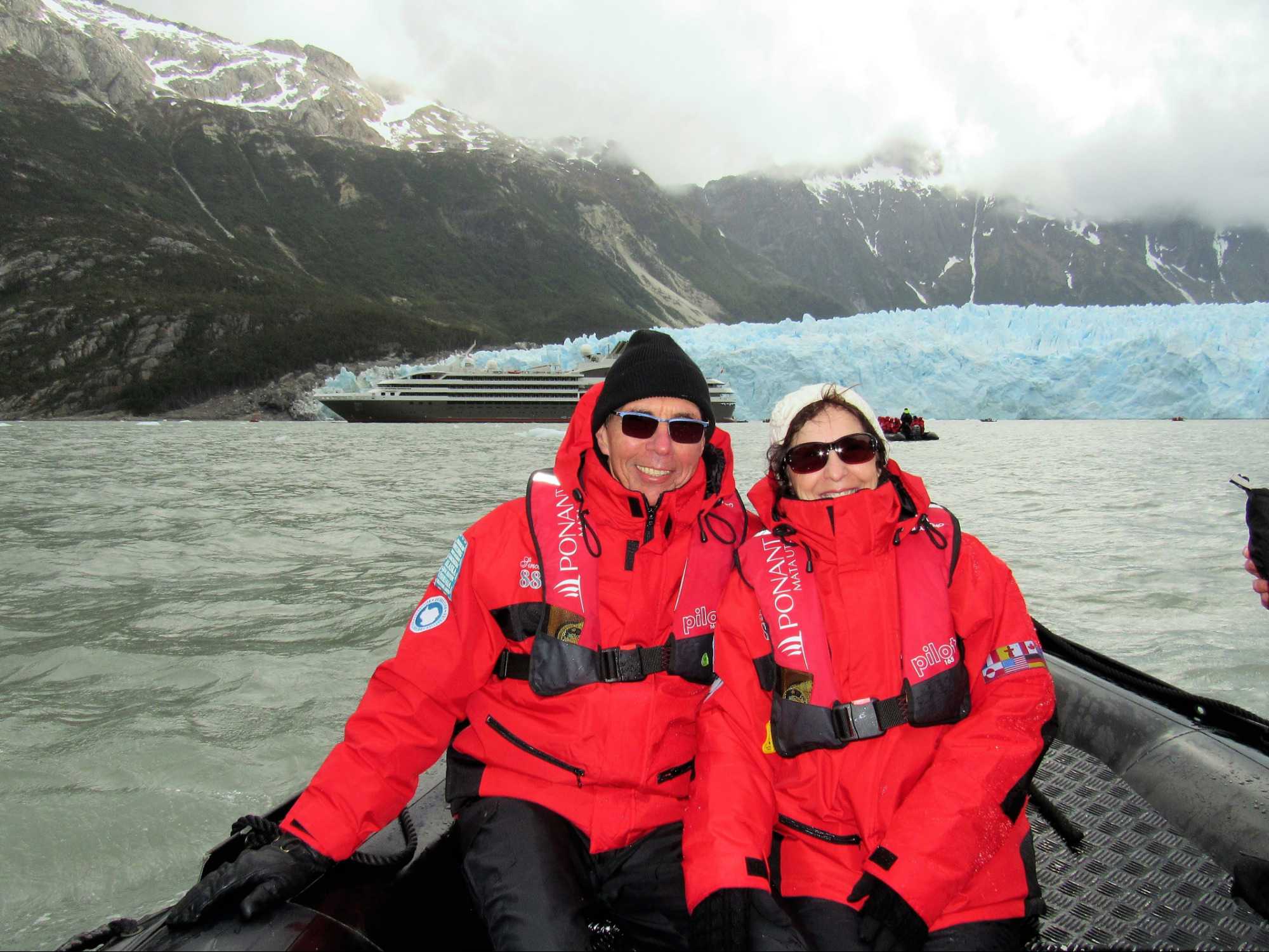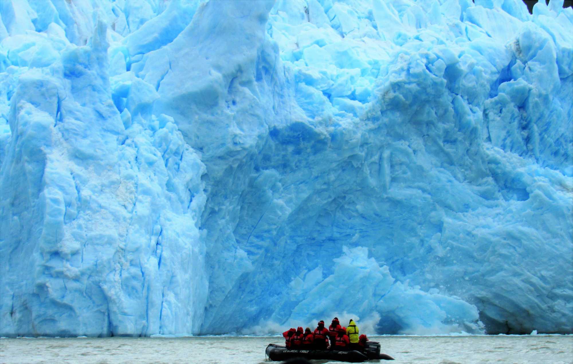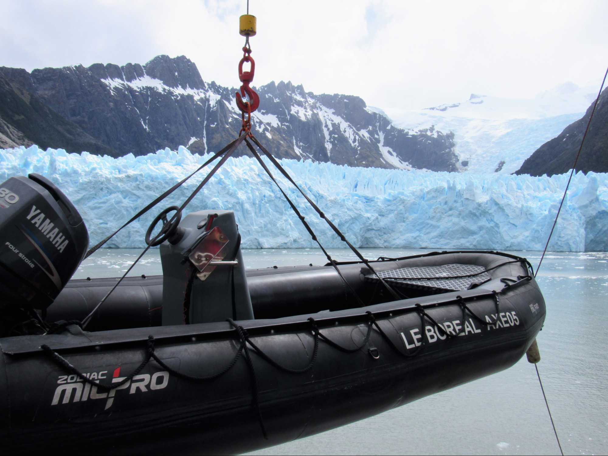 Tout de suite après le dîner on s’approche du glacier Pia. Le glacier Pia est d’après moi le plus important glacier visible durant notre voyage. Un colosse d’environ 1.3 kilomètre de large et long de plus de 3 kilomètres et sa hauteur d’après les livres serait de 100 mètres. Même à une distance de sécurité d’environ 400 mètres, chaque petit humain dans sa parka rouge à bord d’un zodiac et qui se promène devant semble n’être qu’un point de couleur. Le glacier Pia sans cesse en mouvement craque, explose et forme des crevasses. À intervalles réguliers, d’impressionnants grondements nous indiquent que des morceaux de glace se détachent du glacier et tombent dans l’eau avec grand fracas. Jusqu’à ce qu’un coup de tonnerre plus fort que les autres parvienne aux oreilles des voyageurs attentifs et curieux que nous sommes. Bien décidés à observer ces chutes de glace, nous attendons assis dans nos zodiacs ces moments inoubliables. Les vagues puissantes emportent avec elles ces débris de glace fraîchement tombés. Nous avons été chanceux et plusieurs blocs de glace se sont détachés durant notre balade en zodiac. Les glaciers peuvent parfois sembler sales, pollués par de larges trainées grises ou noires. En réalité, il s’agit de la moraine, une accumulation de roches, de sable ou d’argile transportés par le glacier durant son avancée. Surtout sur ce glacier le versant droit était tout gris comme sur les photos mais sous le gris prononcé on retrouve la glace rapidement. Rester quelques minutes face à cette immensité glacée est une expérience indescriptible. Aucune photo ne rend suffisamment forte cette ambiance unique et la sensation de puissance presque effrayante qui émane du glacier. De retour sur le navire pour un petit café bien mérité et heureux de cette superbe journée de navigation et de découvertes. Un pur bonheur!