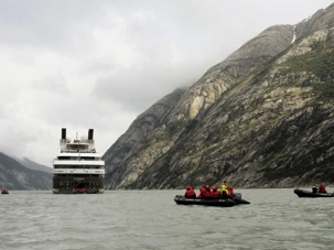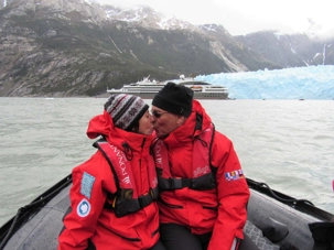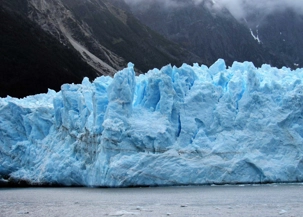 De notre balcon, nous pouvons admirer les hautes montagnes et les glaciers qui couronnent celles-ci. Nous attendons le commentaire du commandant Garcia qui nous invite à l’avant pour l’approche du Glacier Garibaldi. Le vent est très fort et on doit s’agripper aux balustrades pour ne pas tomber. J’ai de bien drôles de photos… Nous avions un débarquement prévu à cet endroit mais Dame Nature en a décidé autrement et c’était impensable de sortir en zodiac dans ces conditions de vent. Par contre, le soleil frappait sur le glacier pour l’illuminer de cette belle couleur bleue. Quand le soleil décide d’être acteur de la scène, le paysage qui se profile est magique, mêlant le vert sombre de l’épaisse forêt et le teint bleuté du glacier. Comme souvent, les rayons transpercent la glace pour offrir aux photographes des tons d’un bleu turquoise et lumineux, on prend des photos encore des photos car l’on ne peut s’en empêcher heureusement que nous sommes loin de nos anciens appareils avec des pellicules.