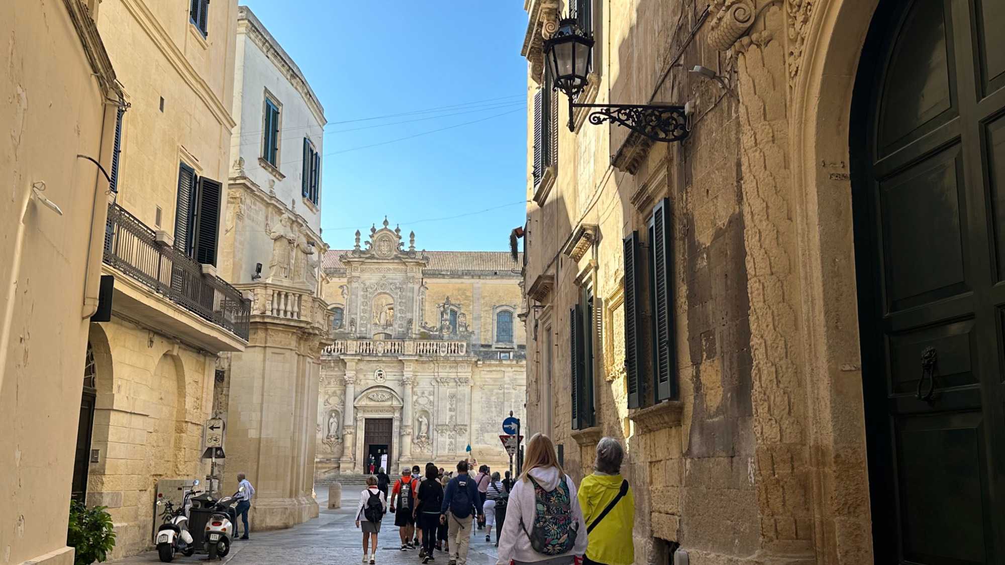 À partir du port de Brindisi, haut lieu des départs vers la mer Ionienne, et vers l’Orient, nous nous dirigeons en autocar vers Lecce, située à environ 30 minutes de route. Lecce est surnommée “la Florence du Sud” car elle fait partie des plus belles villes baroques. Quand on pense à l’art Baroque, il nous vient en tête ces éléments d’architecture qui en sont la caractéristique : l'exagération du mouvement, la surcharge décorative, les effets dramatiques, la tension, l'exubérance des formes, la grandeur parfois pompeuse et le contraste. Rome, Venise, Florence regorgent de monuments de cette époque et de ce mouvement né en Italie qui a connu son apogée entre le 16e et le 18e siècle.