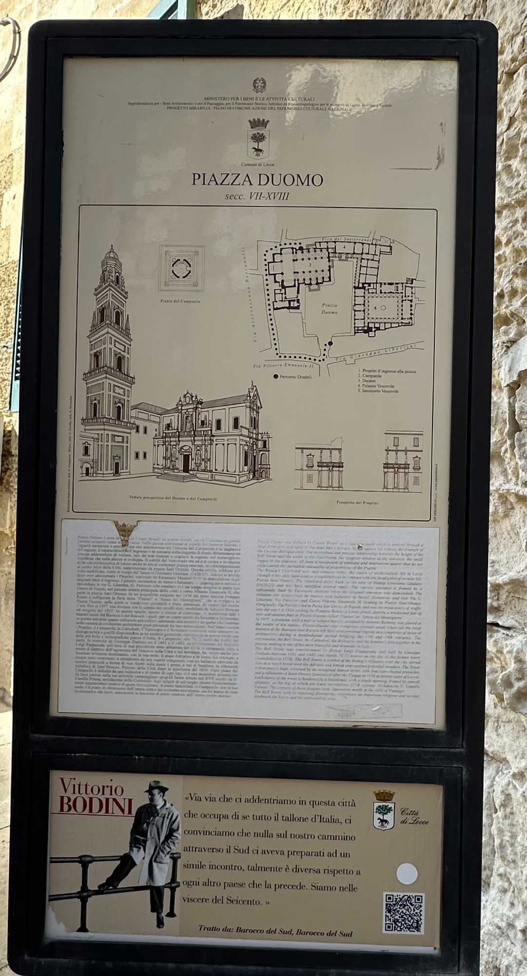 À plusieurs endroits de la vieille ville, les ruines datant de l’occupation de l’empire romain ont été mises en valeur. Ainsi, on peut admirer les vestiges de l’amphithéâtre romain datant du Ier et IIème siècles. Nous avons même aperçu les ruines des anciens thermes romains préservées et exposées sous le théâtre Verdi. Tout près, la colonna di Sant’Oronzo, le Saint Patron hissé sur sa colonne semble veiller sur ses habitants. On ne peut manquer la Piazza Duomo, qui est certainement l’une des plus belles places à voir à Lecce. Avec leur style baroque, les ornements des fenêtres et les portes d’entrées imposantes sont de toute beauté.