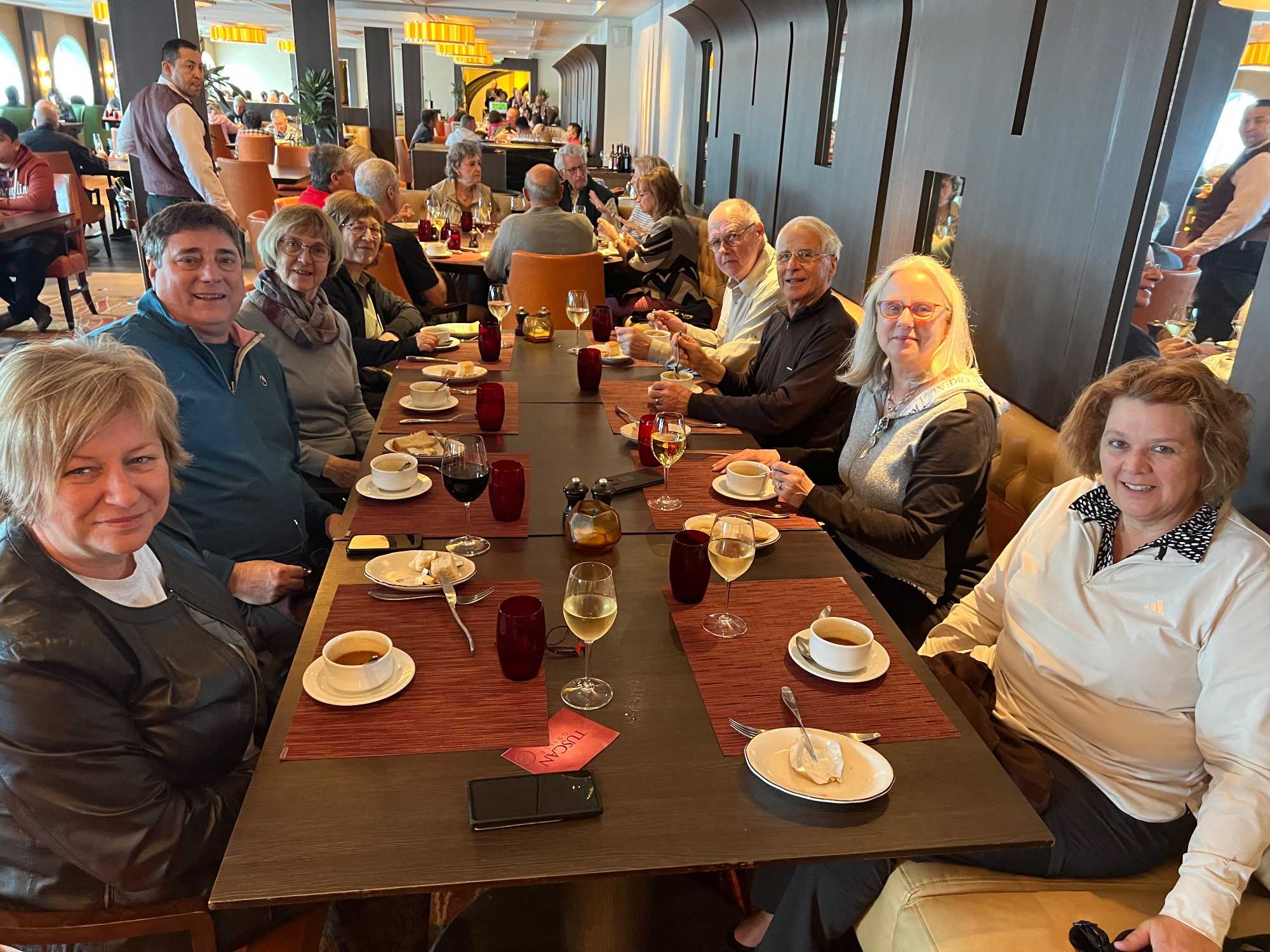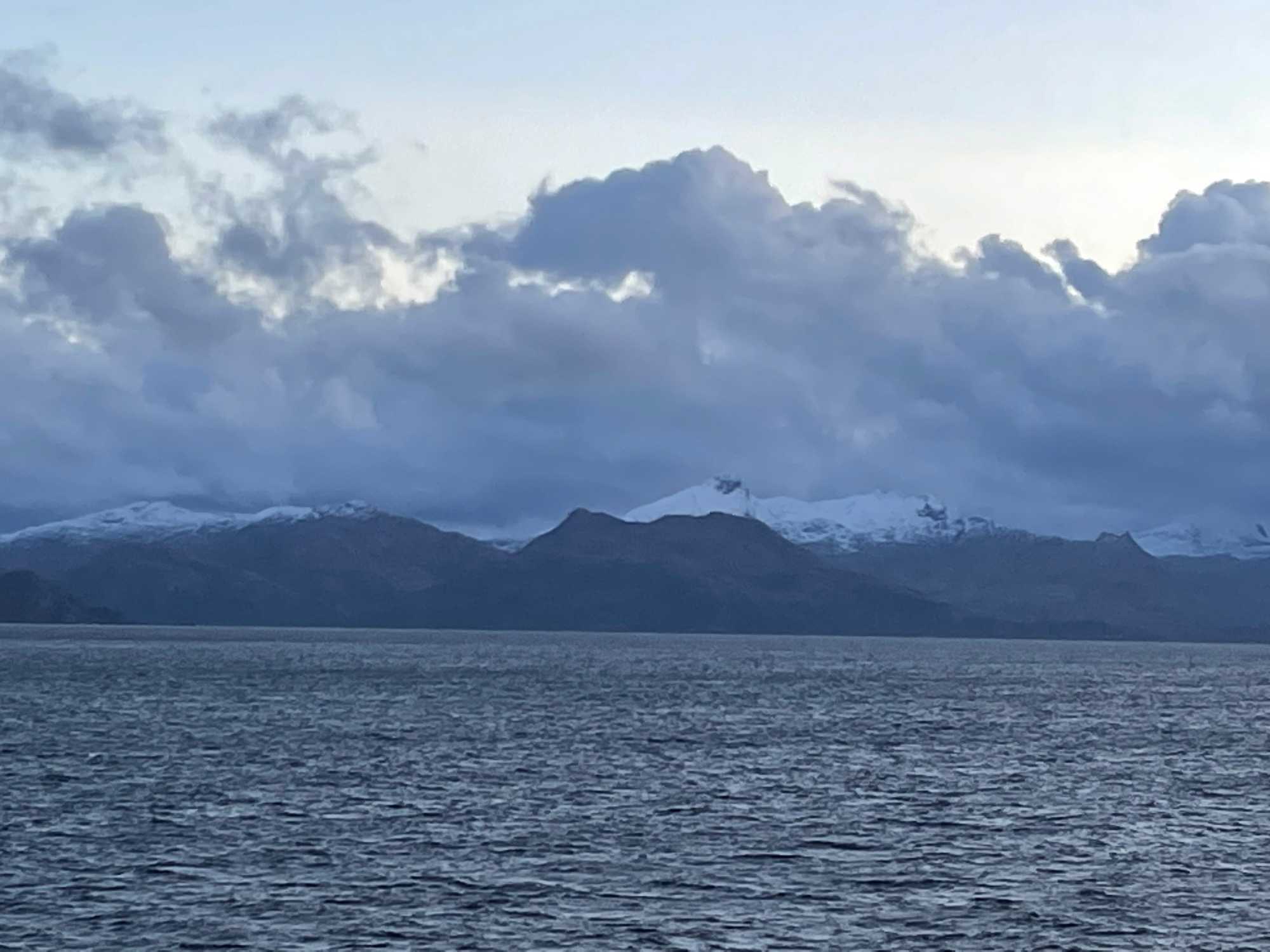 Encore aujourd'hui, on se rencontre encore autour de notre bureau pour se donner de nos nouvelles et se regrouper avant de rejoindre le restaurant Tuscan Grill pour notre 2e repas de spécialité; les fruits de mer sont à l'honneur aujourd'hui. Presque tout le groupe est là et on est heureux de se revoir car on a toutes sortes d'anecdotes à se raconter !!! Le soleil se pointe dès la fin du repas et on découvre nos premiers sommets enneigés ! Nous sommes à l'entrée du détroit de Magellan.