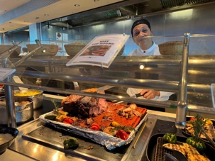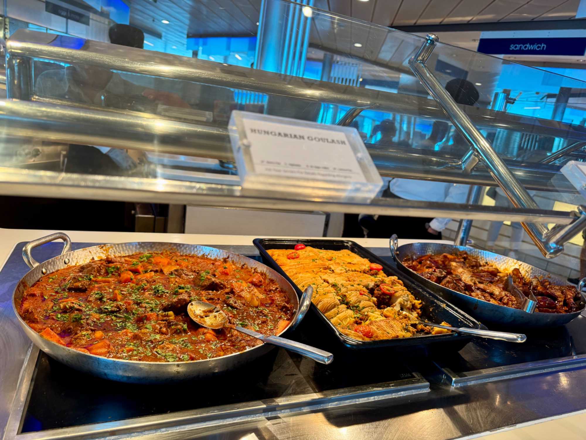 Pour le dîner, on se rend au buffet de l’Oceanview Café. Différents îlots de plats préparés nous mettent l’eau à la bouche. La configuration du buffet est vraiment originale avec ses îlots. Ceci permet de retrouver toute la nourriture au centre de la salle et les voyageurs vont s’installer aux tables de chaque côté du navire avec vue sur la mer. Puisque nous sommes arrivés tôt, cela nous donne aussi le temps de visiter les différents ponts pour se situer rapidement. Ce n’est pas évident la première journée : marchons-nous vers l’avant du navire ou vers l’arrière ? Où sommes-nous à présent ? C’est un peu confondant le premier jour pour trouver nos directions sur un grand navire comme celui-ci, mais nous y arrivons grâce aux nombreux panneaux de signalisation se trouvant à proximité des ascenseurs et avec l’aide de l’application mobile de Celebrity.