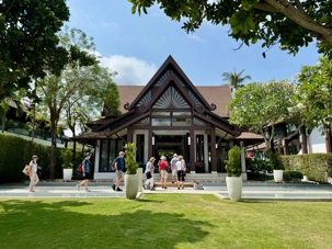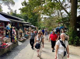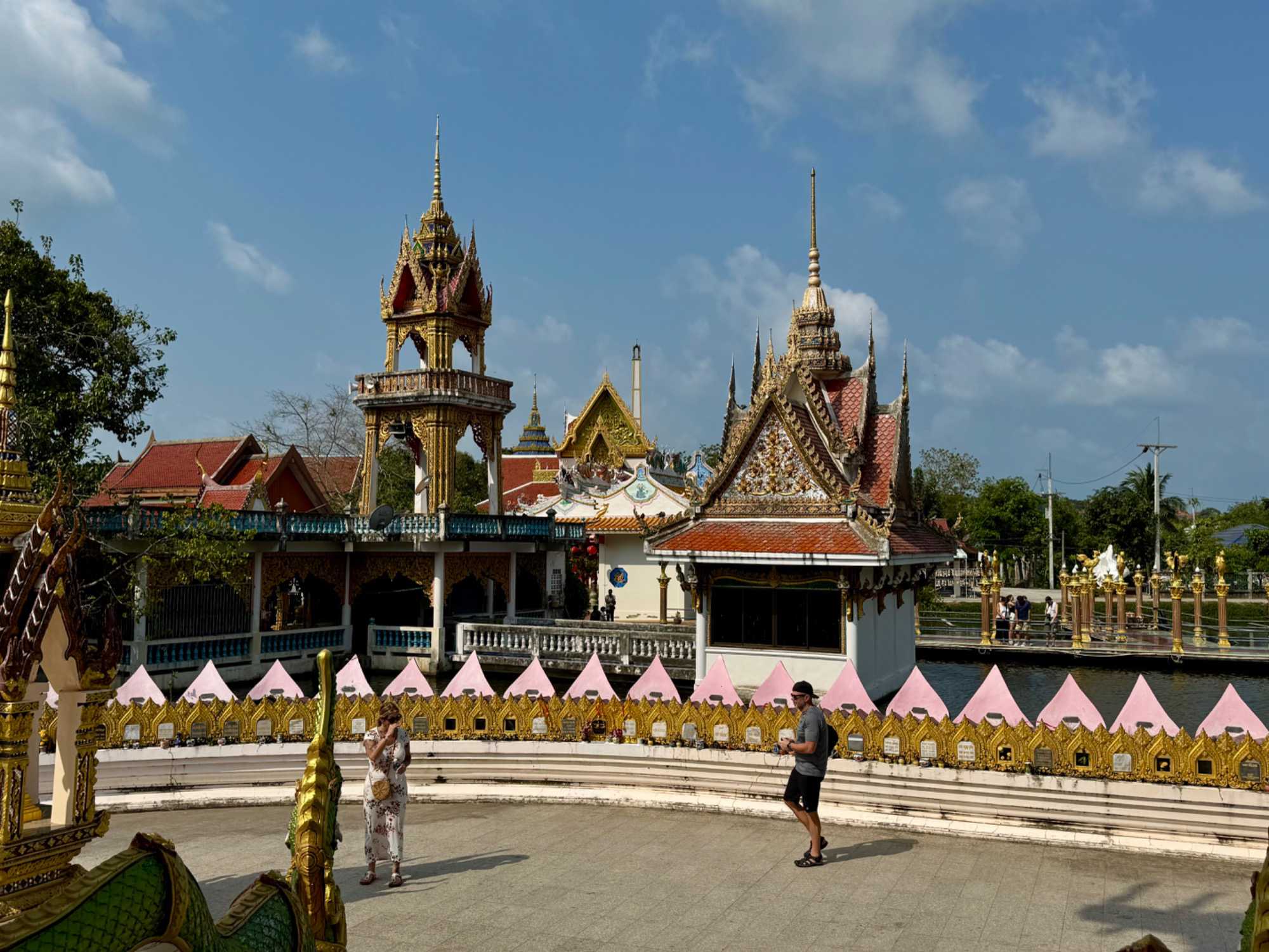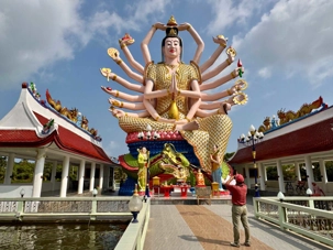 Pour le dîner, nous allons au restaurant de l’hôtel Amari Samui. Quel bel endroit pour prendre un repas en plus de profiter d’une superbe piscine, d’aller se baigner dans la mer et de marcher sur la plage. Nous avons beaucoup apprécié ce moment de détente nous offrant une pause rafraîchissante. Le dîner nous est servi sur la terrasse où une grande table est dressée pour nous. Puis, nous avons dégusté un repas mémorable ! Nous reprenons la route pour nous rendre sur la côte nord-est de Koh Samui, à proximité du temple du Grand Bouddha, pour aller voir le très vaste temple Wat Plai Laem. Son élément le plus marquant est la statue imposante du Bouddha Bodhisattva blanc à 18 bras, majestueusement placée au centre d’un vaste lac. Construit entre les années 1990 et 2000, le Wat Plai Laem est rapidement devenu un site touristique et religieux majeur à Koh Samui. L’architecture élaborée de cette pagode et la richesse des détails artistiques témoignent du dévouement et du savoir-faire des artisans qui ont contribué à sa construction. Pour terminer notre visite à Koh Samui, nous offrons du temps libre aux voyageurs pour aller dans les magasins de la charmante ville de Nathon Town avant de retourner prendre un « tender boat » pour retourner sur notre majestueux hôtel flottant.