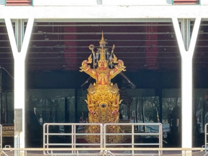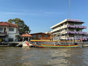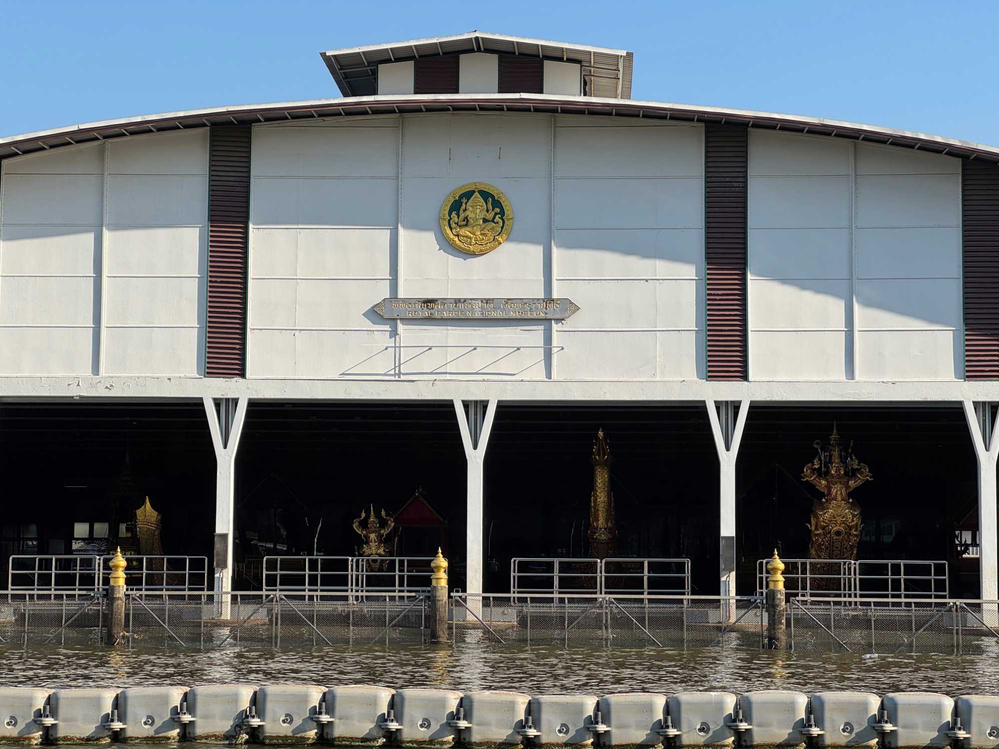 Nous faisons un arrêt en face du Musée National des Barques Royales. Situé sur le canal Bangkok Noi, près du fleuve Chao Phraya et non loin du pont Phra Pinklao, ce musée expose plusieurs barges royales ornées de sculptures et décorées de motifs uniques. Le plus long mesure 164 pieds et demande un équipage de 50 rameurs, 7 pilotes, 2 navigateurs ainsi qu’un marin s’occupant du drapeau et un autre pour maintenir le rythme. Autrefois des vaisseaux de guerre, ces embarcations servent aujourd’hui lors des célébrations royales et des cérémonies officielles. La plus célèbre et la plus belle des barges, « Suphannahong », transporte le Roi lors d’une procession royale sur le fleuve à l’occasion de la cérémonie de Kathin, qui se tient généralement en octobre ou en novembre, et au cours de laquelle de nouvelles robes sont offertes aux moines selon la tradition bouddhiste.