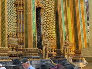 Ensuite, nous allons visiter le Palais Royal et son fameux Bouddha d’Émeraude. Ici, 95% de la population est bouddhiste. Environ 11,2 millions de personnes résident dans la zone métropolitaine de Bangkok et 71,8 millions pour l’ensemble de la Thaïlande. Ce matin pour cette visite, il y a une foule immense. De plus, la température est très chaude et humide. Nous y allons malgré ces inconvénients et cela en vaut le coup puisque c’est un des plus beaux palais au monde. Le Palais Royal, a été construit en 1782 par le roi Rama 1er sur la rive gauche de la Chao Phraya. Il abrite non seulement la résidence royale et la salle du trône, mais aussi un grand nombre de bureaux gouvernementaux et le temple du Bouddha d’Émeraude, le Wat Phra Kaeo. Le palais couvre une surface de 21,8 hectares et il est entouré de quatre murs de 1900 m de long.