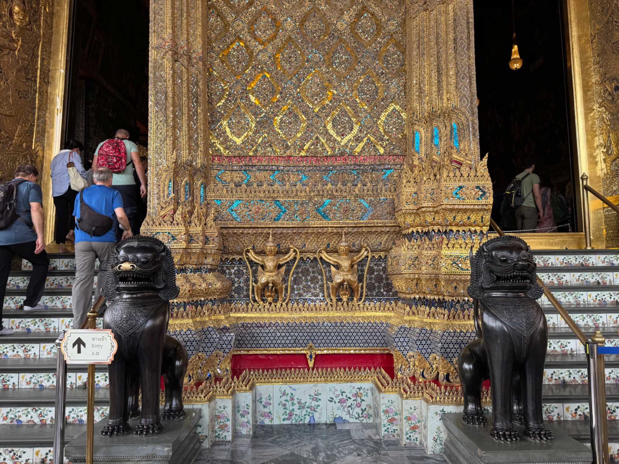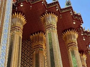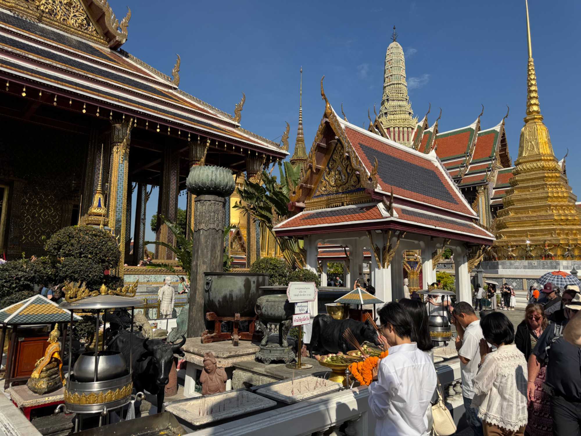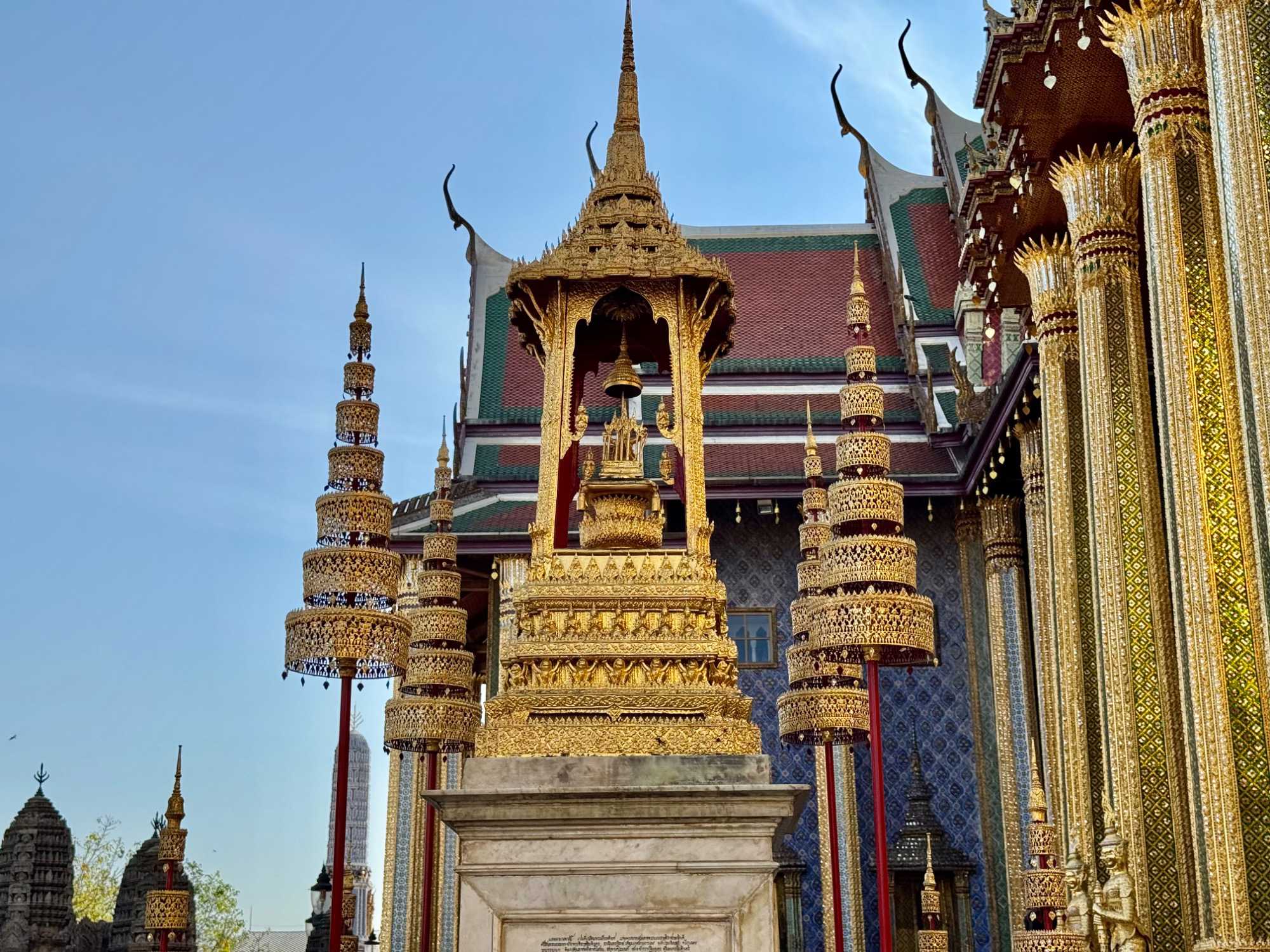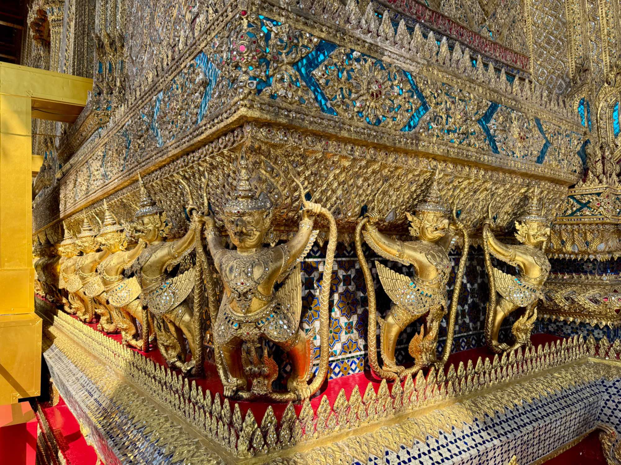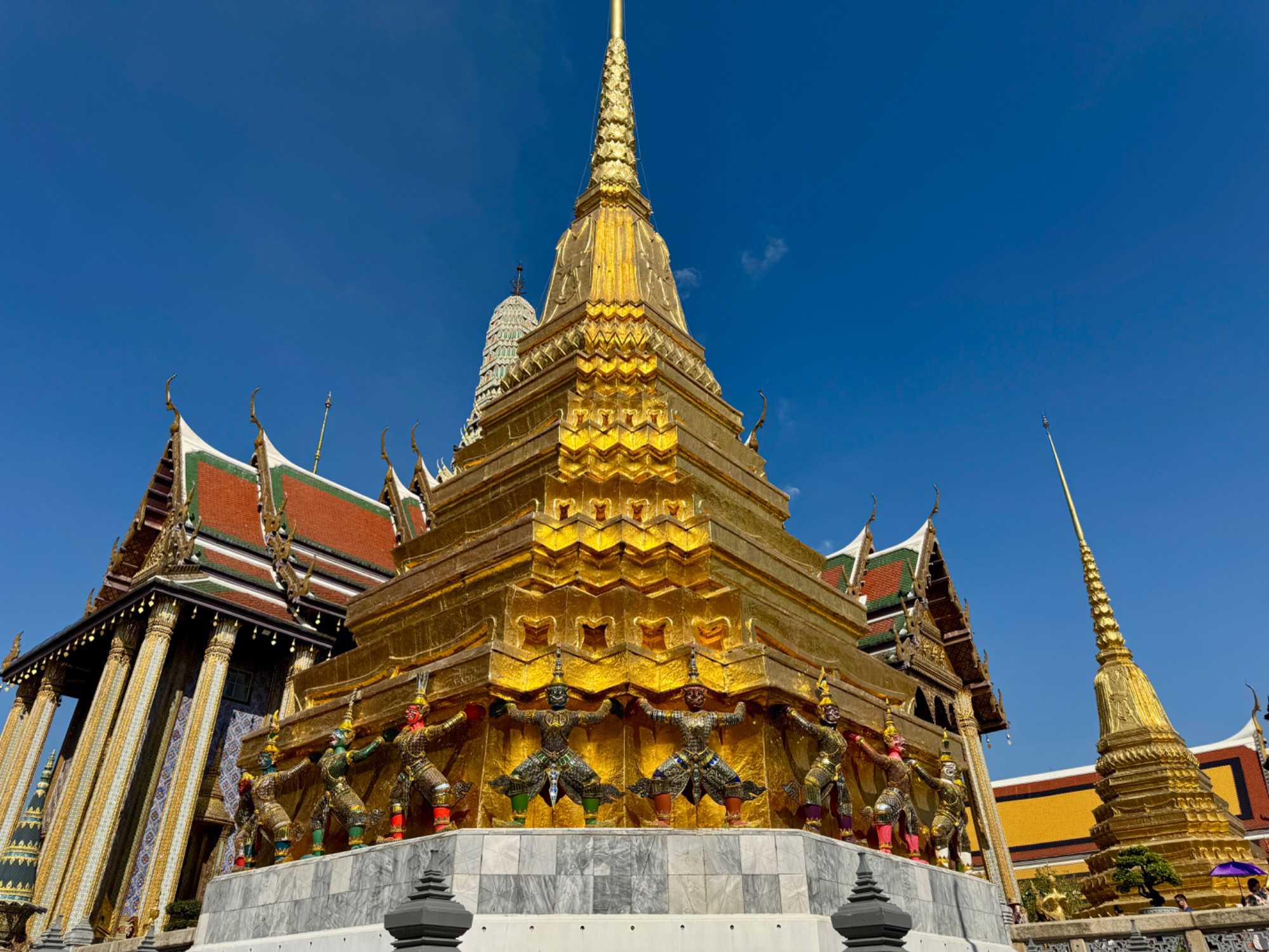 Ce splendide palais abrite plusieurs monuments et des temples ornés aux styles architecturaux différents dont la splendeur nous laisse sans voix. Des dorures, des tuiles étincelantes et des statues de Bouddha ornent l’ensemble architectural. Le magnifique Wat Phra Kaeo, trésor de l’art thaïlandais, abritant le Bouddha d’Émeraude, la représentation de Bouddha la plus vénérée de Thaïlande, se trouve au coeur du site que nous visitons.