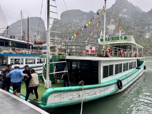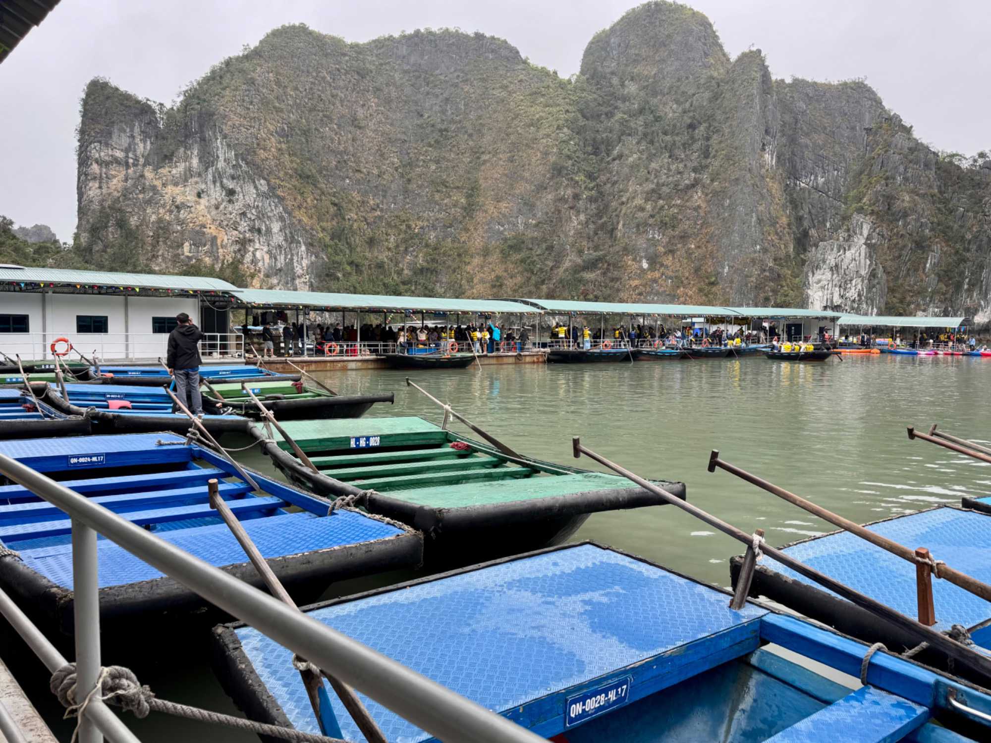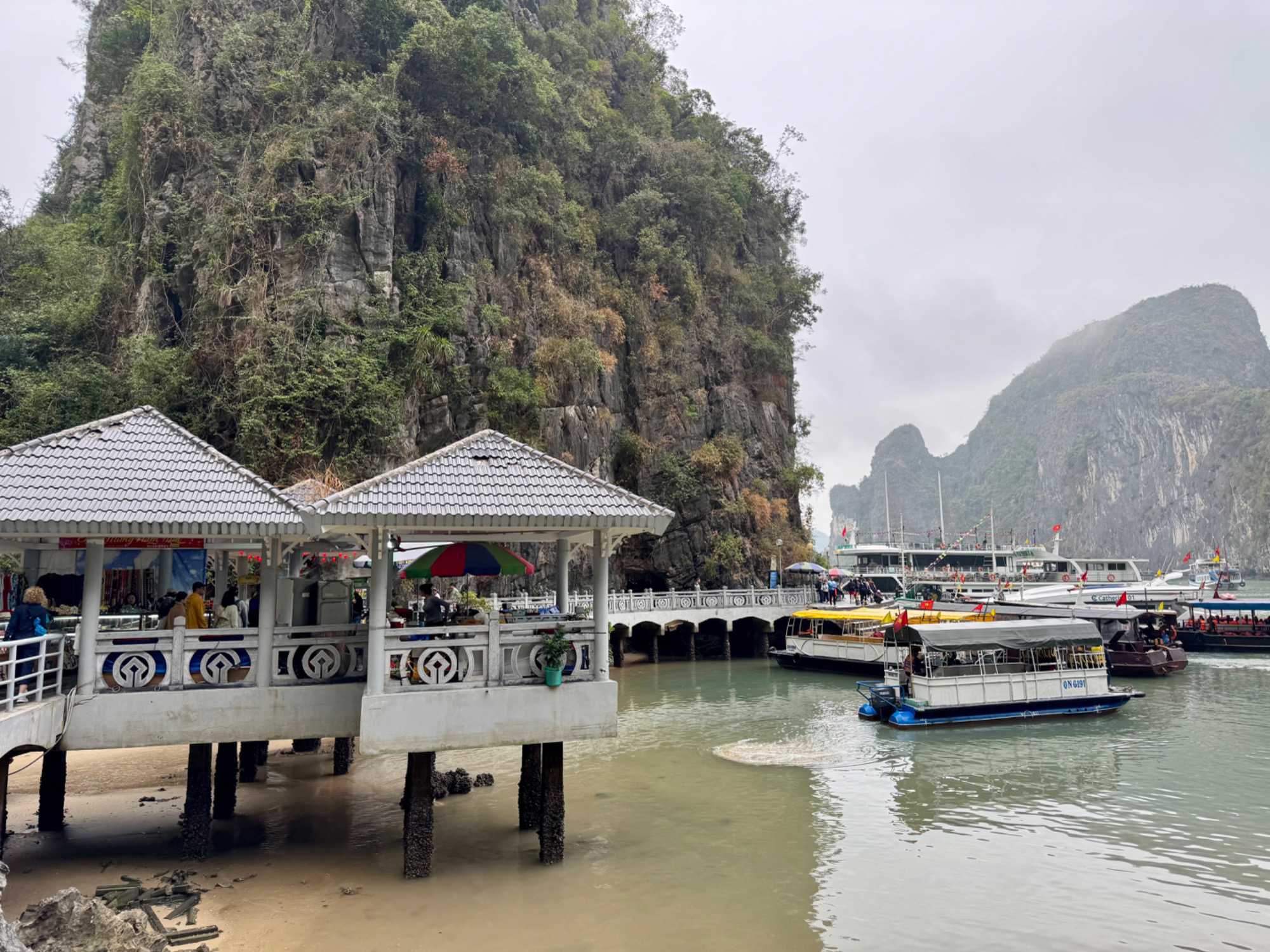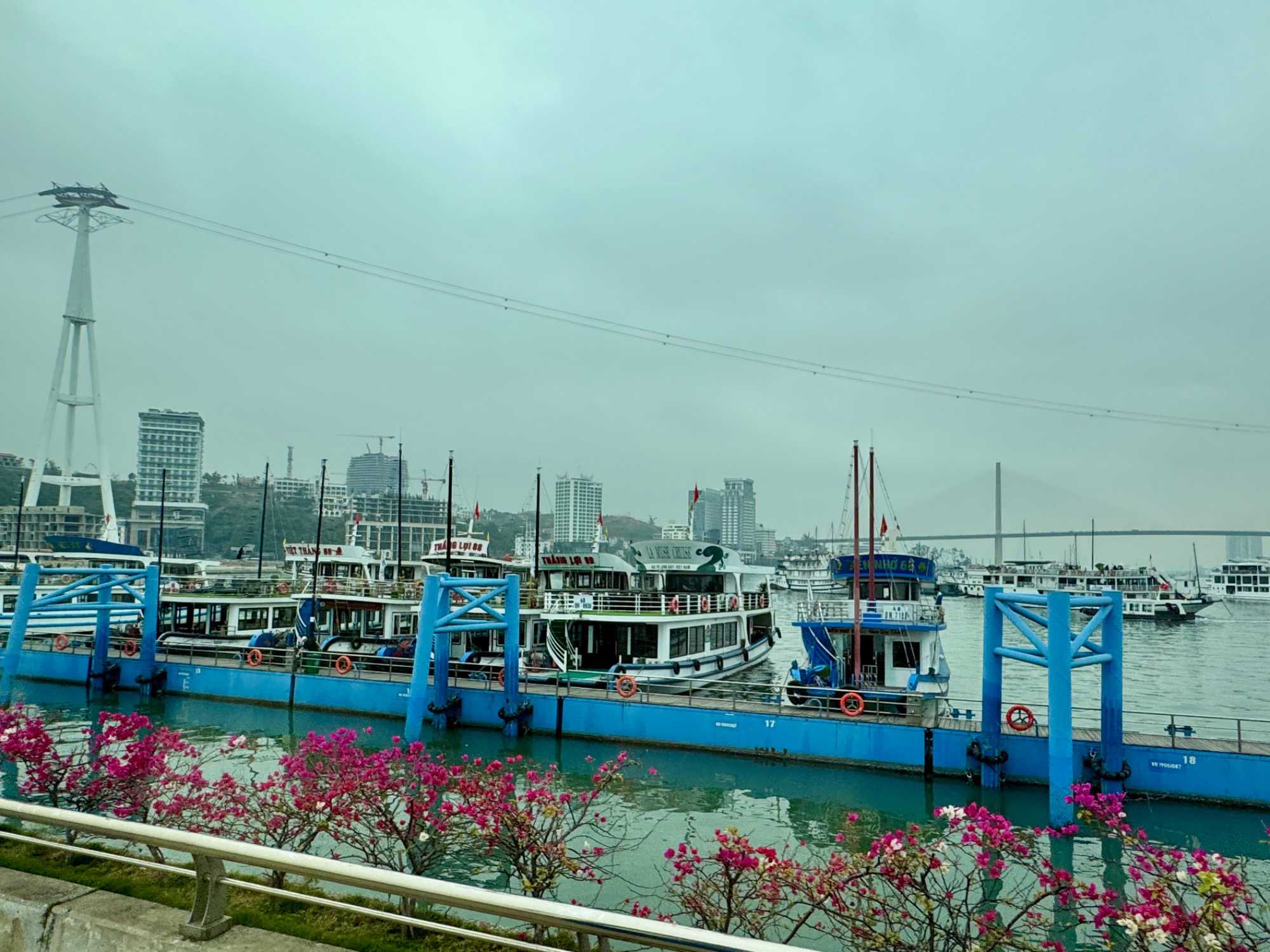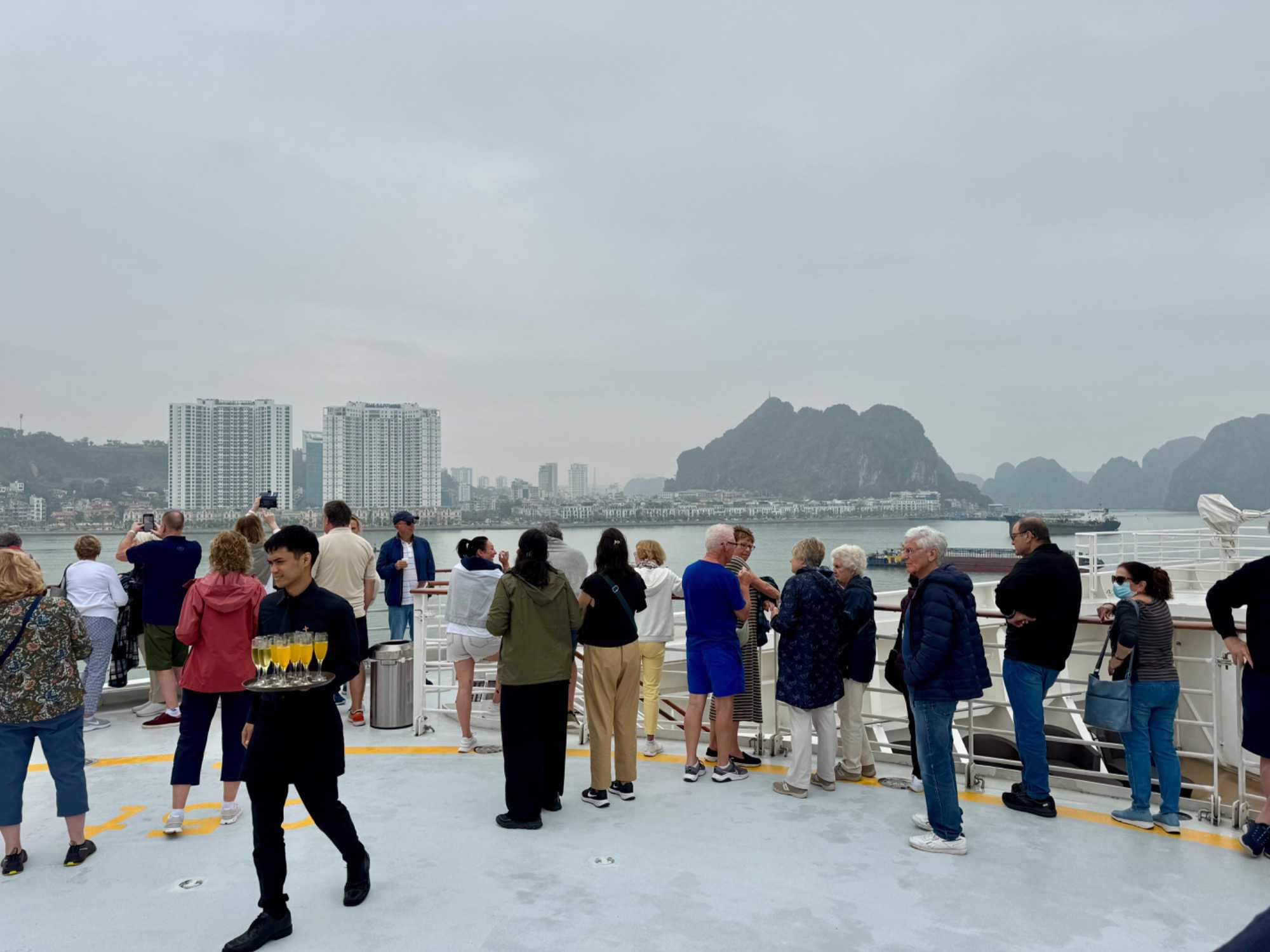 Le navire arrive au port à 11h00. Cela nous laisse amplement de temps à tous pour se préparer tranquillement et prendre un bon déjeuner. Peu avant notre arrivée, la température est fraîche car aujourd’hui on nous annonce 19 degrés C. Il pleut un peu et nous avons la vue sur le décor de la Baie d’Halong depuis 9h00 ce matin. Le capitaine nous a avisé de l’heure d’entrée dans la Baie afin de nous permettre de profiter de ce paysage unique, patrimoine mondial de l’Unesco. Notre groupe a été invité pour assister au spectacle sur le plancher de l’héliport, en avant du navire, quelle bonne idée. Aussitôt arrivé au port de Halong on se donne rendez-vous pour sortir du navire. Nous prenons des petites navettes électriques pour aller rejoindre notre guide, monsieur Ha, et notre autobus. C’est un très beau décor qui s’offre à nos yeux : une belle ville, propre et en plein essor touristique. Une courte distance nous sépare de l’autre port d’où nous prendrons la jonque pour une croisière dans la Baie. En route, nous sommes à même de voir des cultures de perles ainsi que diverses constructions, plusieurs ayant pour mission d’héberger les nombreux touristes qui se déplacent jusqu’ici.