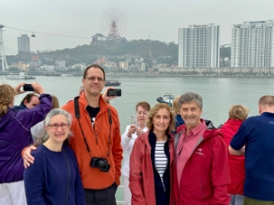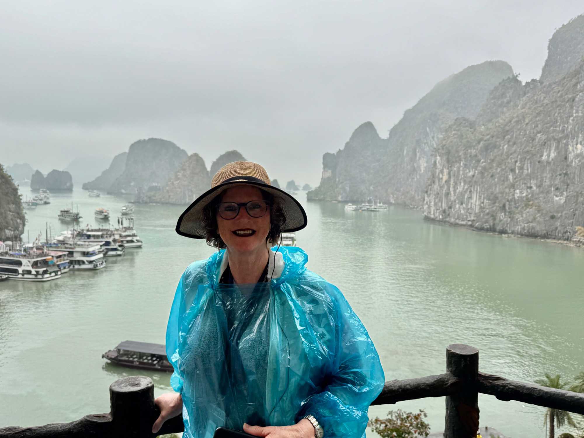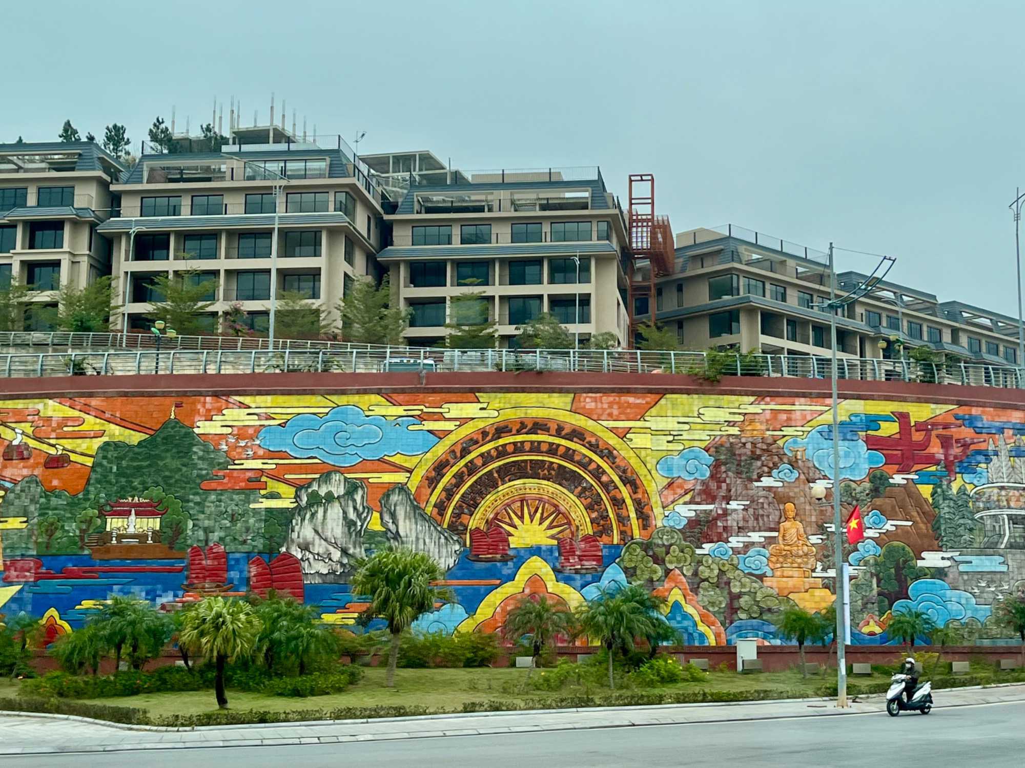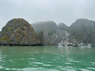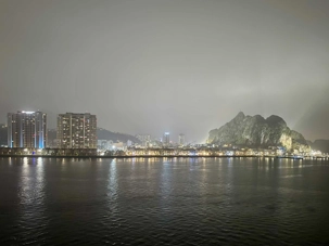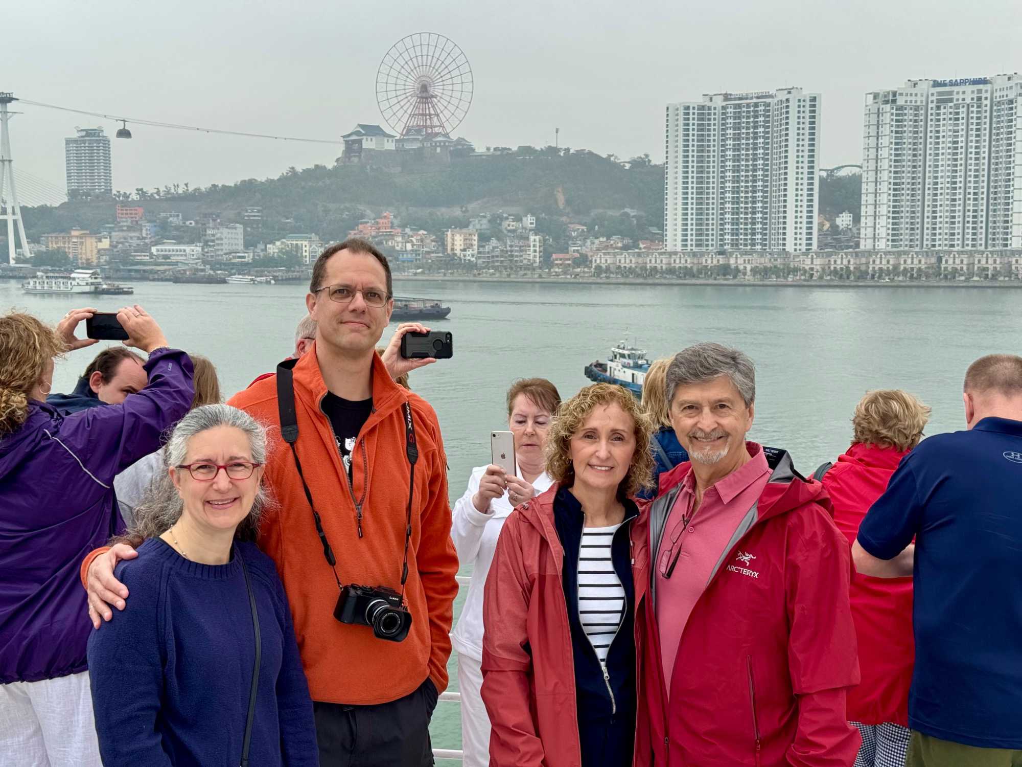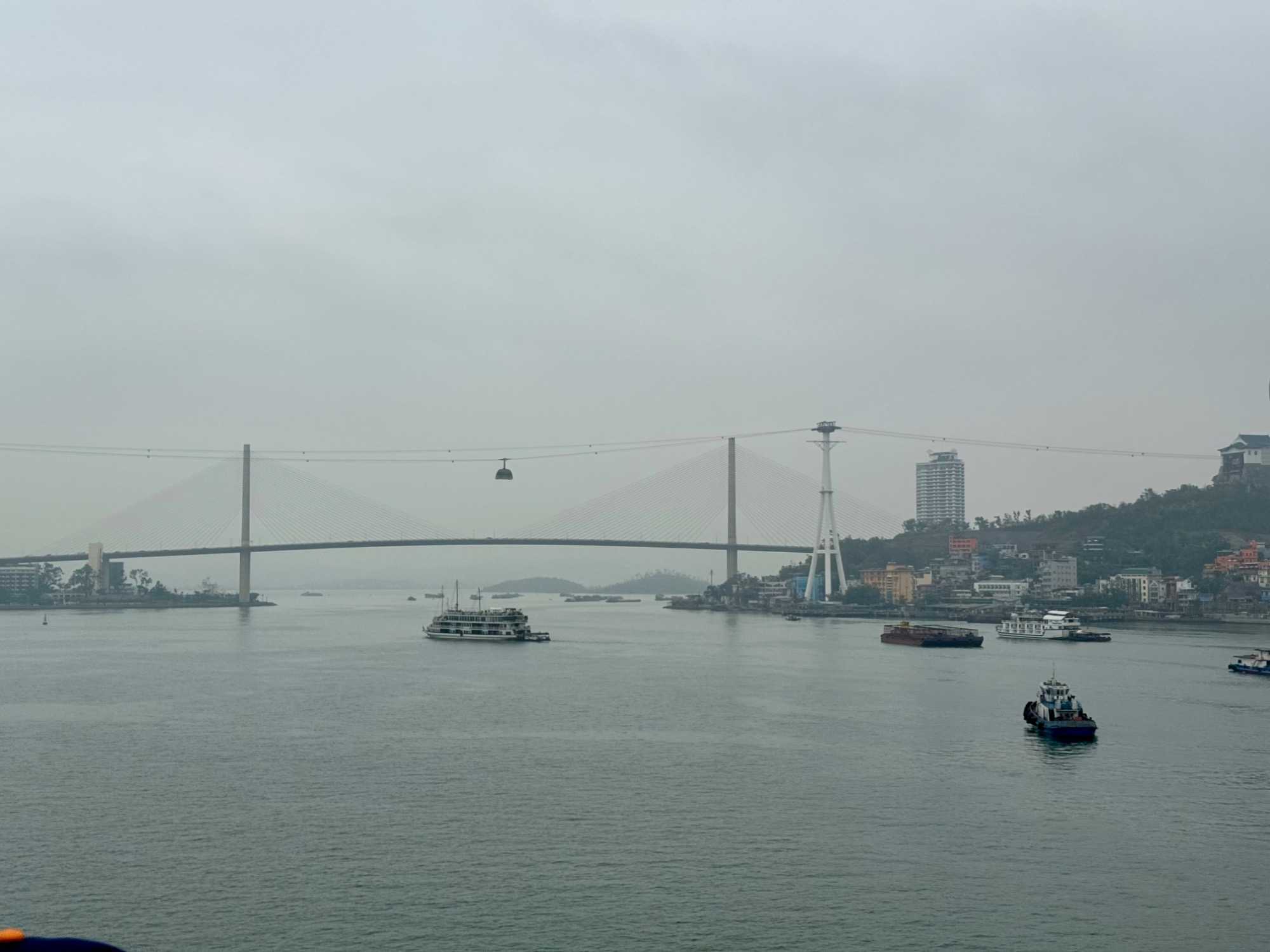 Le navire arrive au port à 11h00. Cela nous laisse amplement de temps à tous pour se préparer tranquillement et prendre un bon déjeuner. Peu avant notre arrivée, la température est fraîche car aujourd’hui on nous annonce 19 degrés C. Il pleut un peu et nous avons la vue sur le décor de la Baie d’Halong depuis 9h00 ce matin. Le capitaine nous a avisé de l’heure d’entrée dans la Baie afin de nous permettre de profiter de ce paysage unique, patrimoine mondial de l’Unesco. Notre groupe a été invité pour assister au spectacle sur le plancher de l’héliport, en avant du navire, quelle bonne idée. Aussitôt arrivé au port de Halong on se donne rendez-vous pour sortir du navire. Nous prenons des petites navettes électriques pour aller rejoindre notre guide, monsieur Ha, et notre autobus. C’est un très beau décor qui s’offre à nos yeux : une belle ville, propre et en plein essor touristique. Une courte distance nous sépare de l’autre port d’où nous prendrons la jonque pour une croisière dans la Baie. En route, nous sommes à même de voir des cultures de perles ainsi que diverses constructions, plusieurs ayant pour mission d’héberger les nombreux touristes qui se déplacent jusqu’ici.