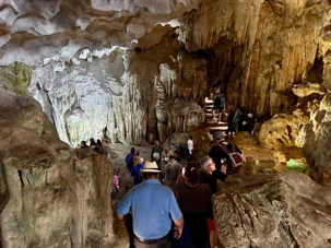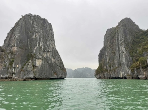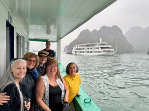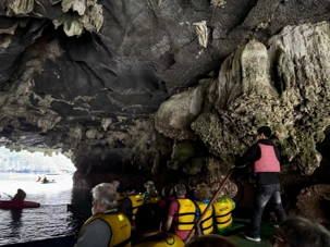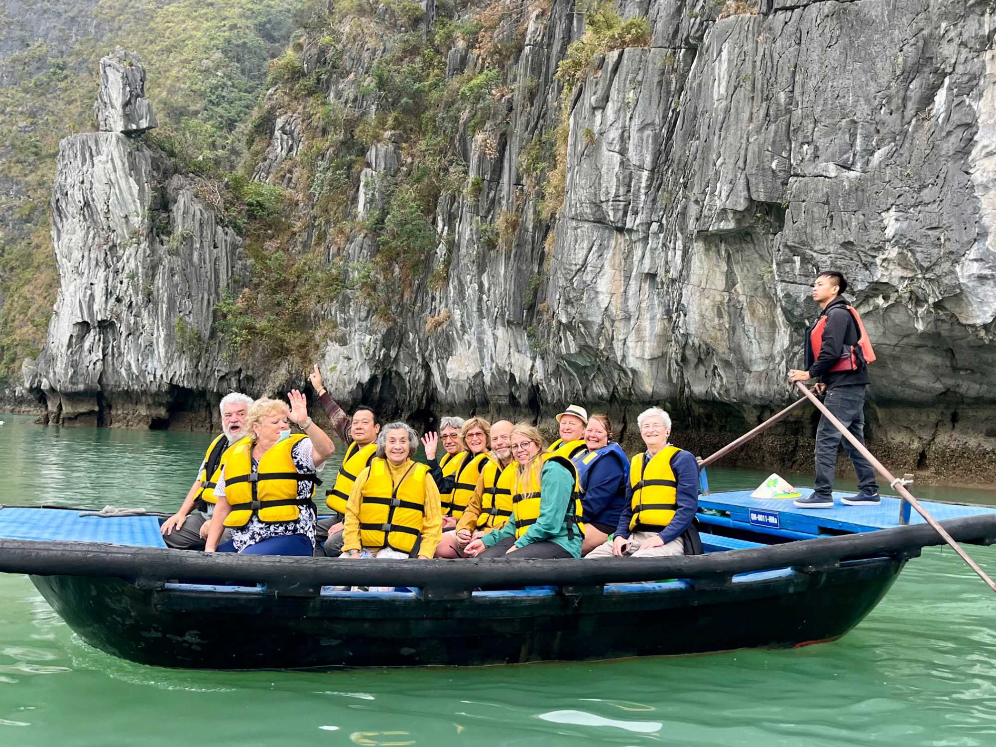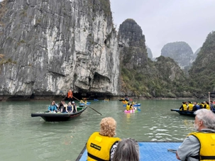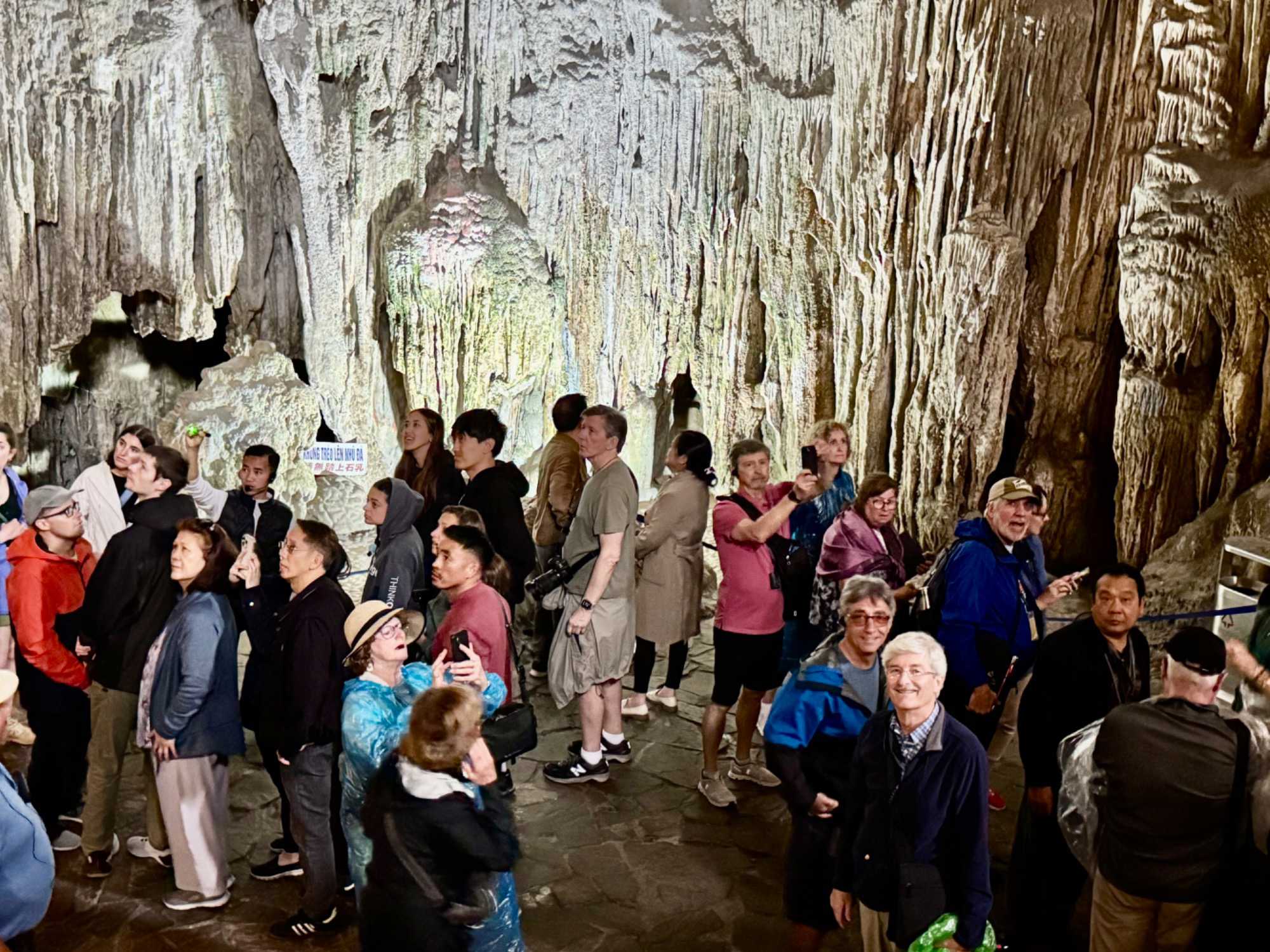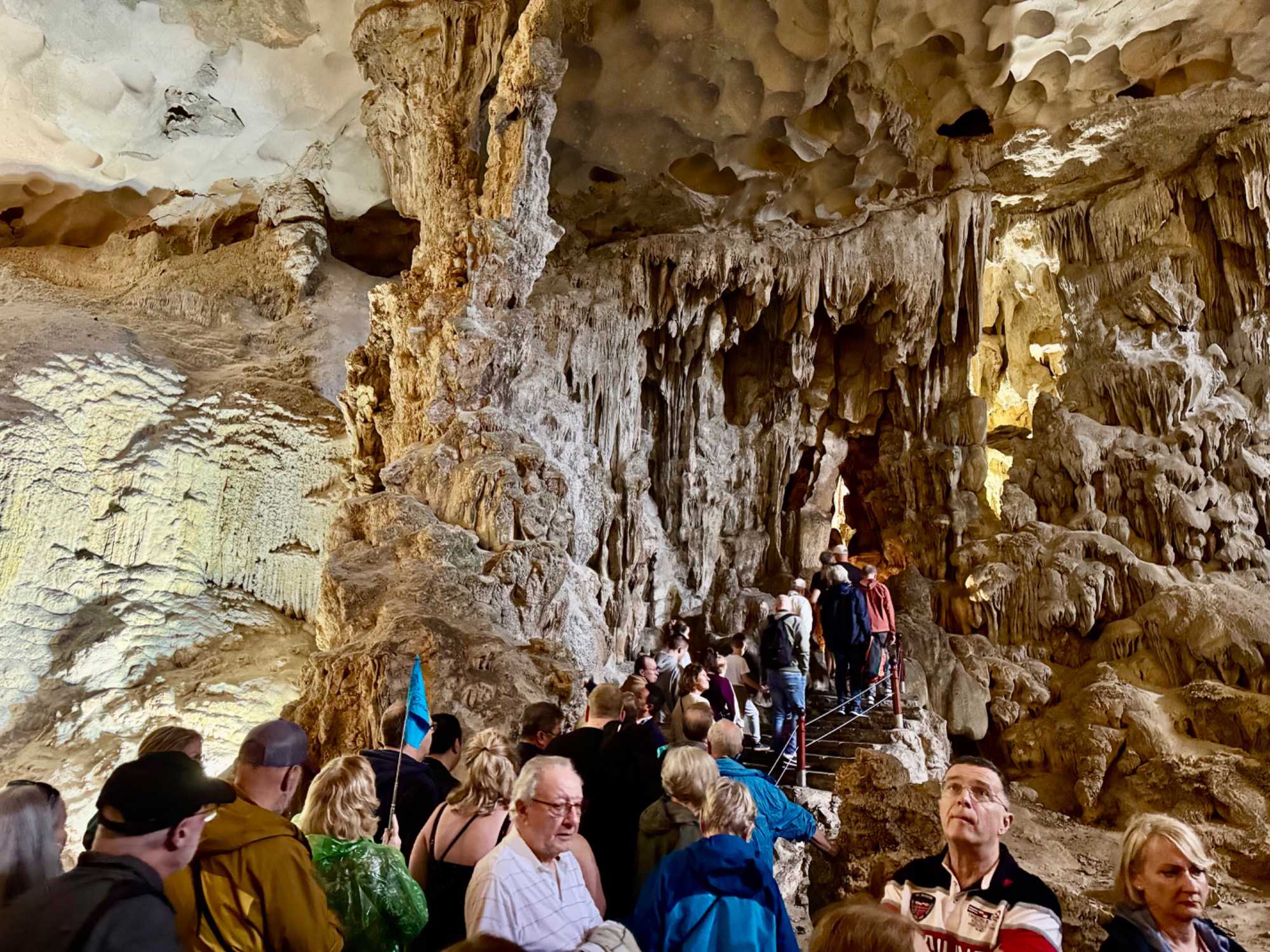 Nous naviguons allègrement dans la Baie. Du pont supérieur, nous sommes à même d’admirer les merveilles que la nature a créées pour le plaisir de nos yeux. Le calme est palpable, ce moment était fort attendu des voyageurs. Pour plusieurs, c’est au-delà de leurs espérances. Un moment d’émerveillement avec, comme toile de fond, un cadre tout à fait enchanteur. Nous débarquons afin d’aller visiter une grotte. Nous allons visiter la grotte Hang Sung Sot qui est très bien aménagée. Il y a un sentier en pierres et en béton avec un éclairage très bien pensé tout le long de la visite; nous y restons pendant une heure. Cette grotte, immense, nous donne la sensation de visiter un musée naturel tout à fait remarquable ! Par la suite, nous prenons le temps de faire un ballade dans une barque à fond plat. Nous passons sous un passage naturel pour déboucher dans une petite baie où plusieurs asiatiques expérimentent pour la première fois le kayak… Le paysage nous entourant est tout à fait époustouflant.