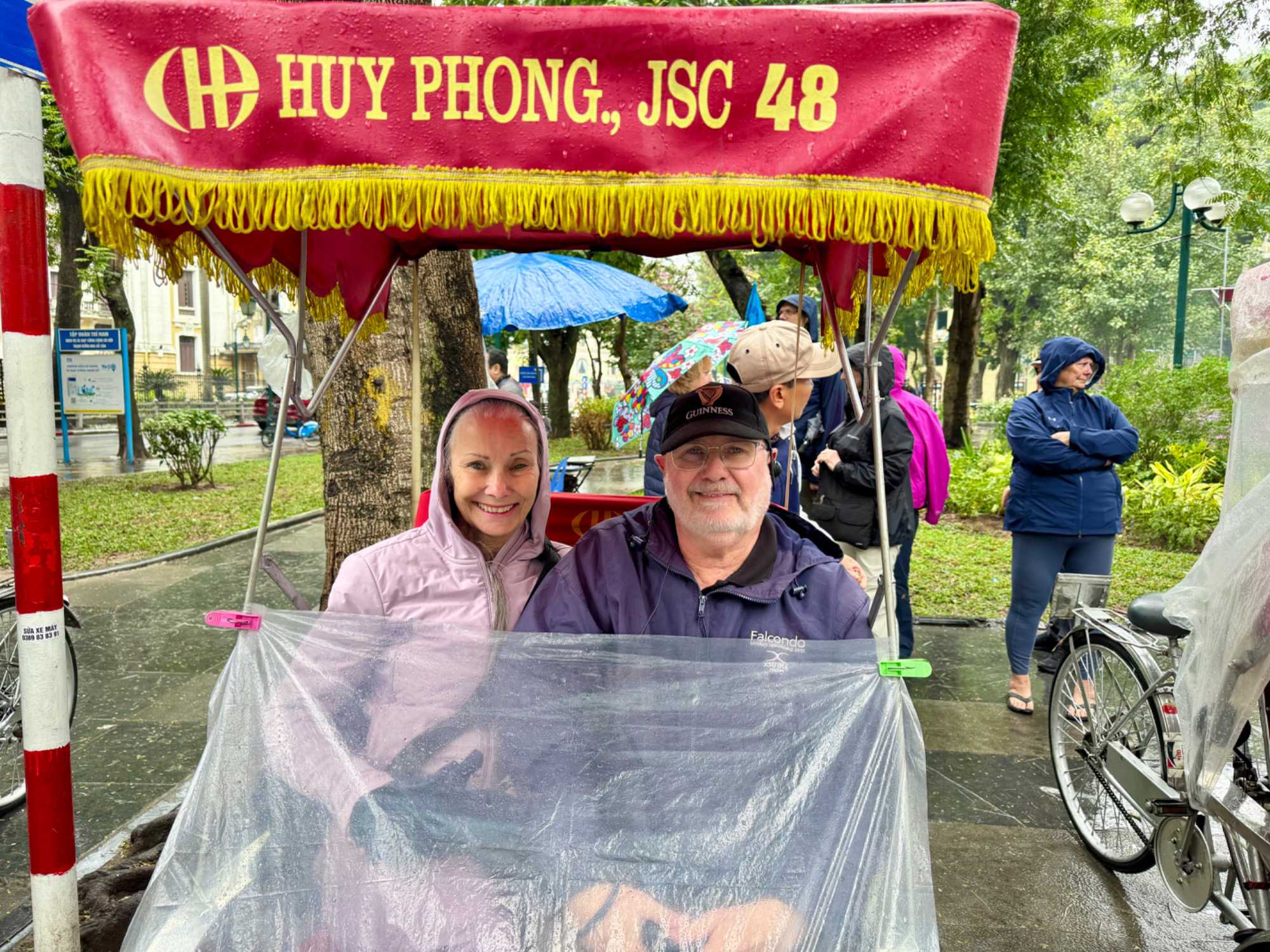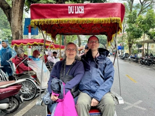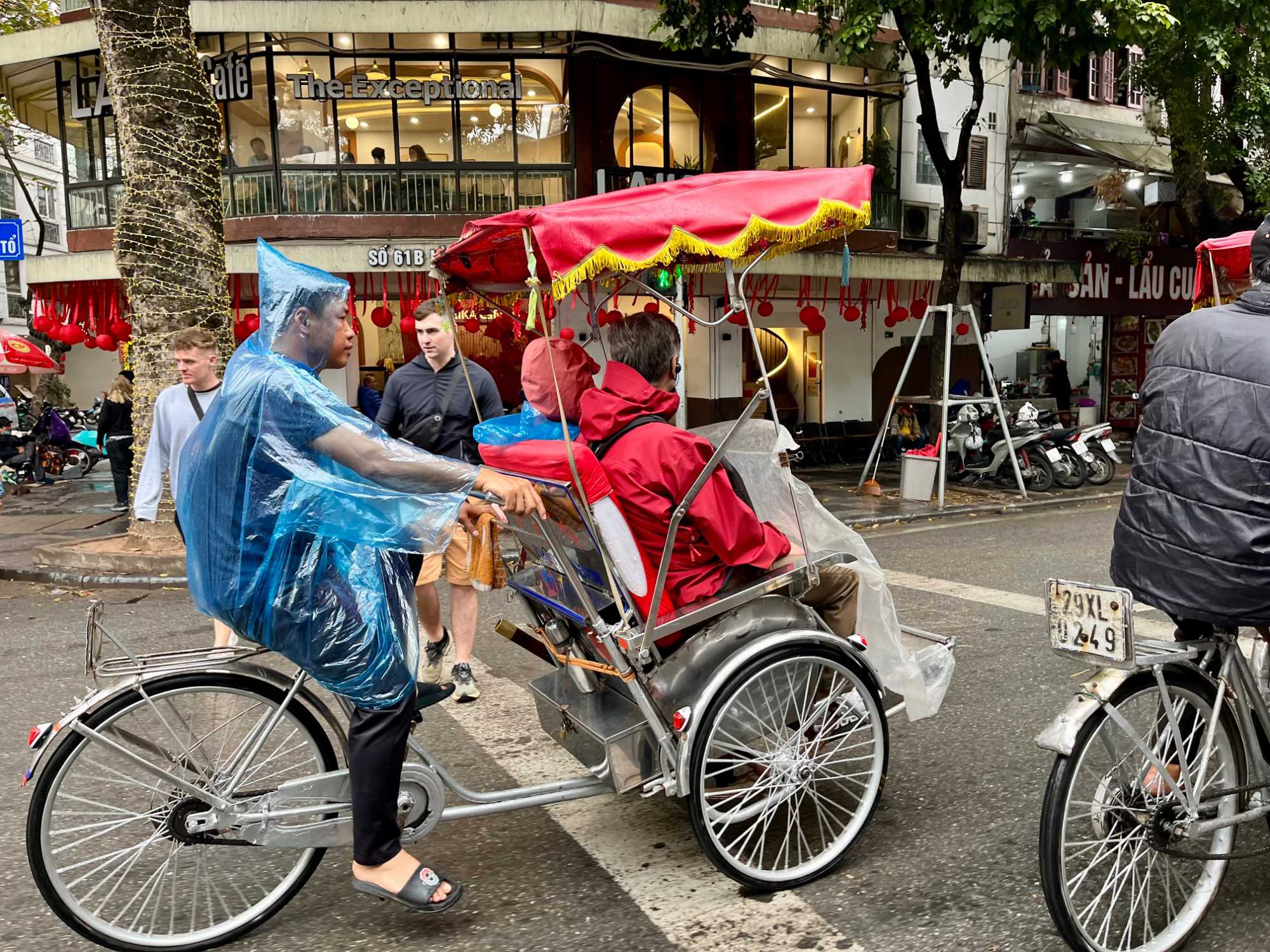 Ensuite, nous faisons une petite balade en cyclo-pousse dans le quartier français et le vieux quartier de Hanoï. C’est un véritable voyage dans le temps que nous vivons en longeant ces bâtiments témoins de la période coloniale. Les motocyclettes et les voitures qui nous croisent et nous frôlent sans cesse nous rappellent que nous sommes bien en 2025 dans une ville de 10 millions d’habitants. Tout le monde s’active dans un rythme effréné mais personne ne semble aucunement stressé. Nous avons l’impression d’assister à une chorégraphie réglée au quart de tour. Nous le savions, Hanoï est une ville en constante ébullition avec ses milliers de scooters qui rendent la traversée d’un passage piéton presqu’impossible à faire, pour nous nord-américains. Pourtant, en une journée complète, nous n’avons vu aucun accident, les piétons, cyclistes, motocyclistes et automobilistes se respectent et tentent de faire leur chemin, tant bien que mal, sans nuire aux autres usagers de la voie publique.