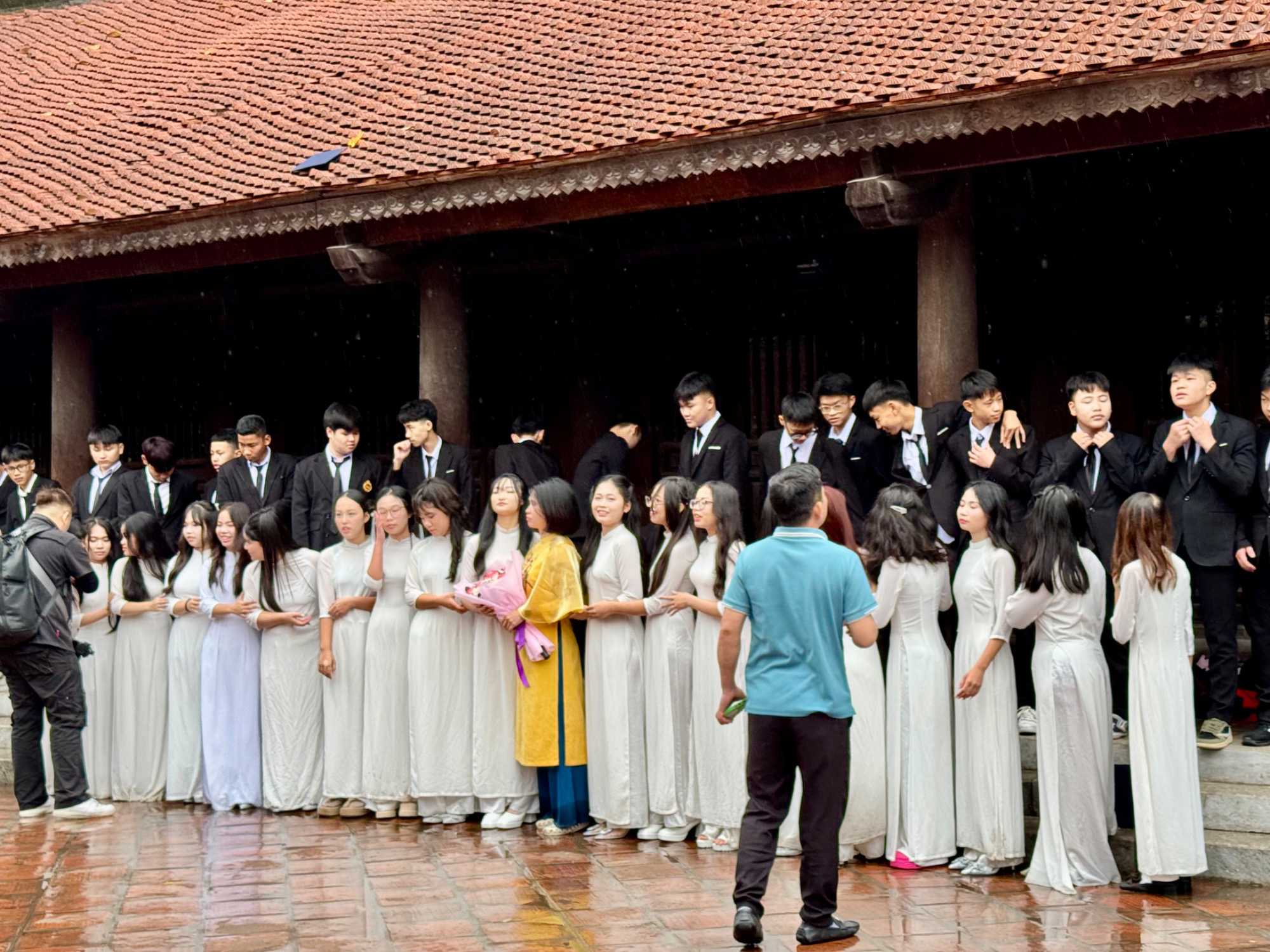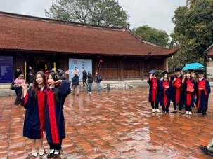 Nous débutons avec le Temple de la Littérature (Van Mieu), superbe ensemble architectural agrémenté d’un vaste jardin et cerné d’un haut mur de briques. Ce sanctuaire dédié au culte de Confucius fut bâti en 1070 sous le règne de Ly Thaï Tong. Ce complexe portait en fait une double appellation car il abritait également l’école des Fils de l’Etat, première université nationale fondée en 1076. Sous les Tran, en 1235, ce centre des hautes études fut rebaptisé Collège national. Il devait acquérir son nom de temple de la Littérature lorsque la capitale et le Collège national furent transférés à Hué par les Nguyen, au début du XIXe siècle. Le Van Mieu est bâti sur un terrain de 3 hectares. De nombreuses constructions furent ajoutées au cours des siècles par les souverains vietnamiens et par de riches mécènes. Il se divise en cinq cours fermées, percées de portes. Au fronton de la porte principale, qui s’ouvre au sud, une inscription rappelait aux cavaliers qu’ils devaient descendre de leur monture, en témoignage de respect envers les divinités du sanctuaire. Après avoir traversé les deux premières cours en suivant une large allée, on parvient au pavillon de la Constellation Khue qui présidait aux activités littéraires. Ainsi, lors des concours de poésie, c’est du balcon du deuxième étage que les lettrés récitaient leurs poèmes. Nous sommes surpris par le nombre d’étudiants présents en groupe et vêtus de leurs beaux costumes de graduations. Certains demandent à Linda de prendre la photo avec eux.
