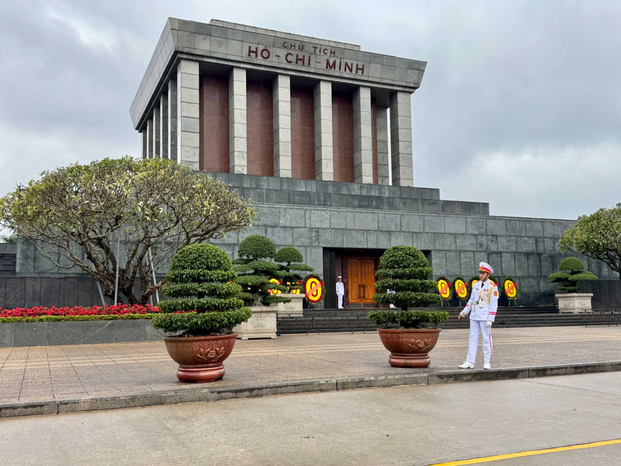 Nous embarquons dans notre autobus pour aller à la place Ba Dinh. En son centre se dresse l’imposant mausolée du président Ho Chi Minh, où, dans un sarcophage de verre, repose le corps embaumé du père de l’indépendance vietnamienne. Le mausolée est fermé deux mois par an, lorsque le corps est envoyé en Russie pour y être remis en état par les embaumeurs. Le mausolée, dont la construction débuta en septembre 1973, fut achevé en août 1975 et inauguré un mois plus tard. Les matériaux utilisés (marbre, granit et bois précieux) vinrent de toutes les régions du pays. C’est sur cette place historique de Ba Dhin que Ho Chi Minh proclama l’indépendance du pays, le 2 septembre 1945.