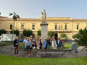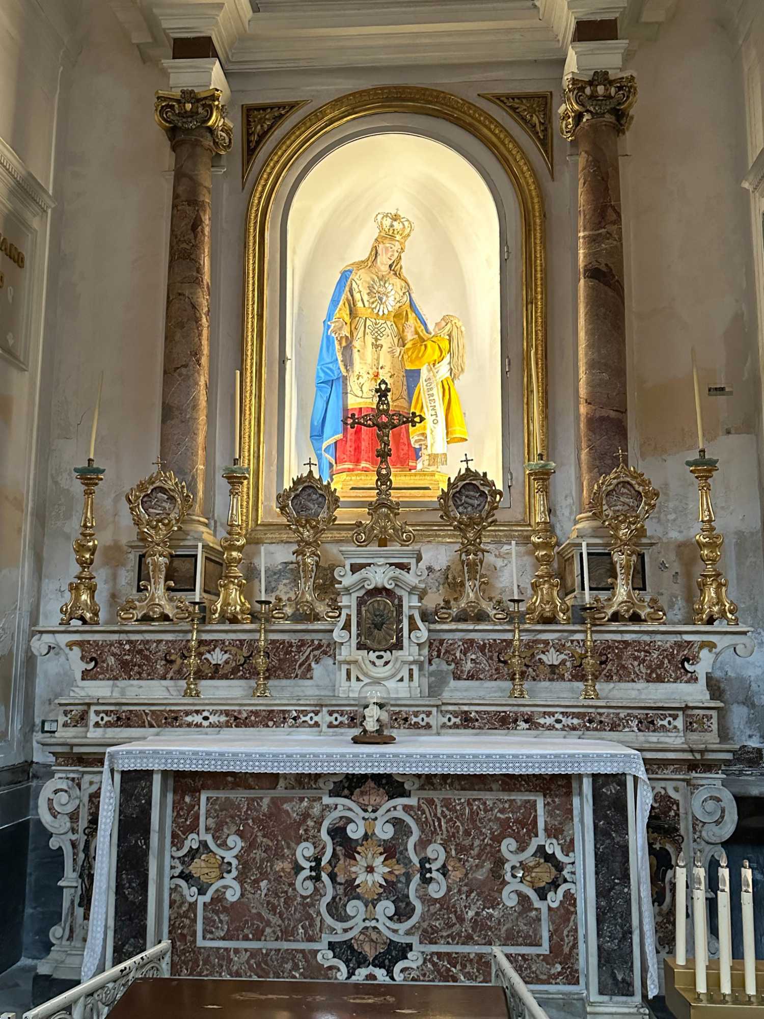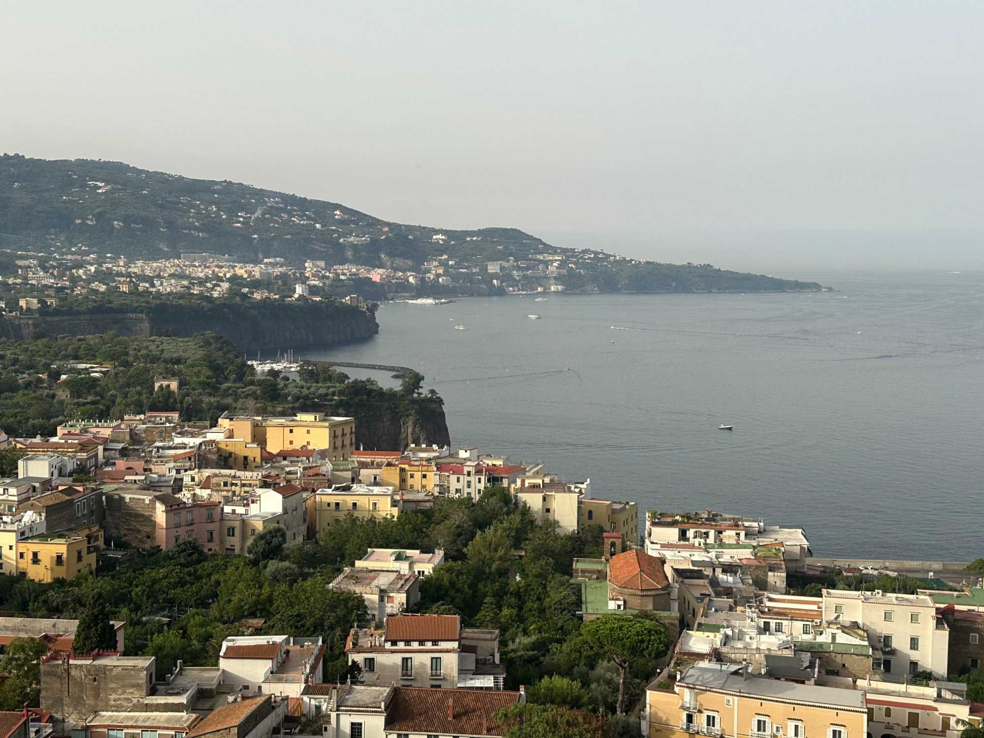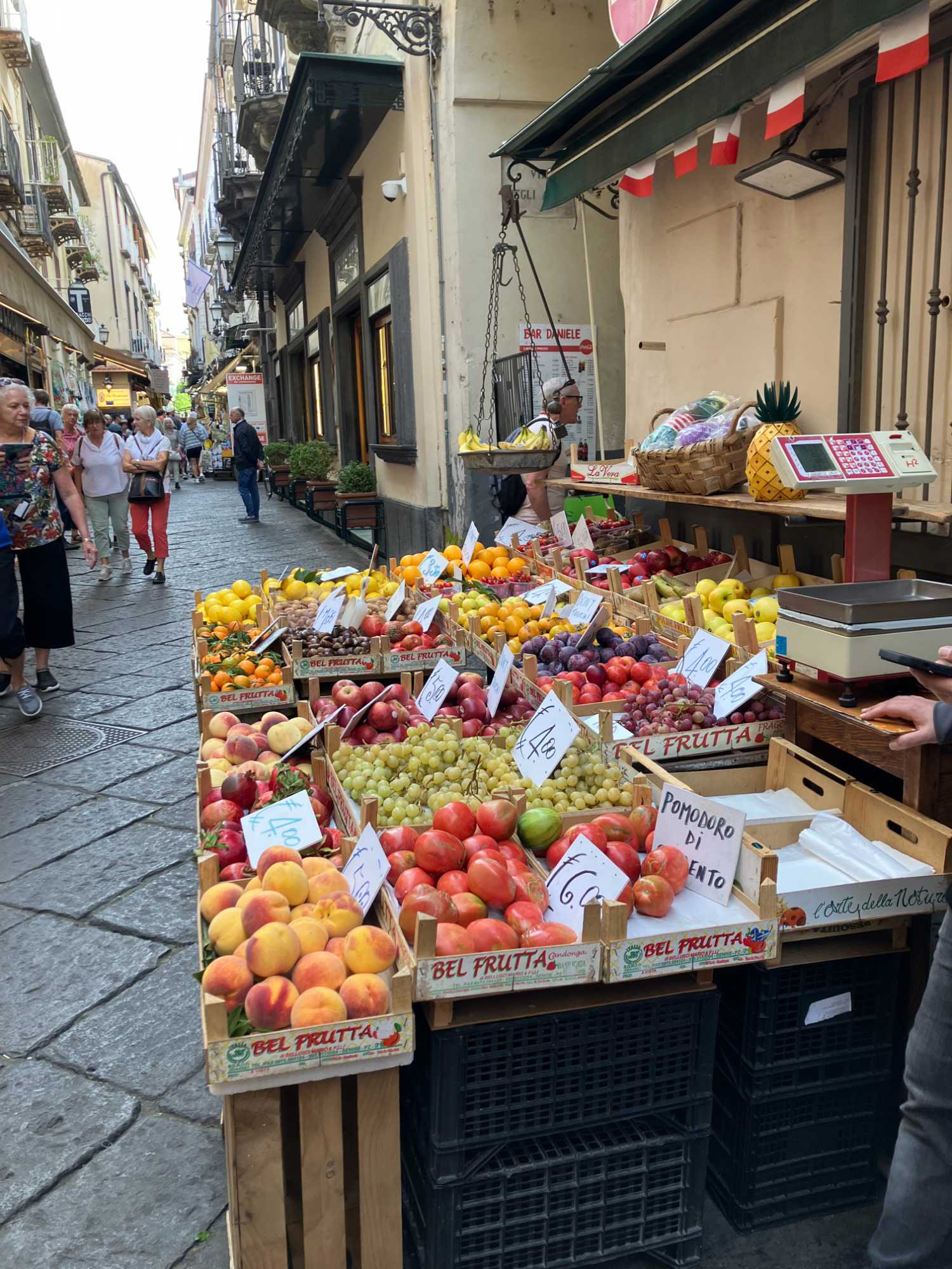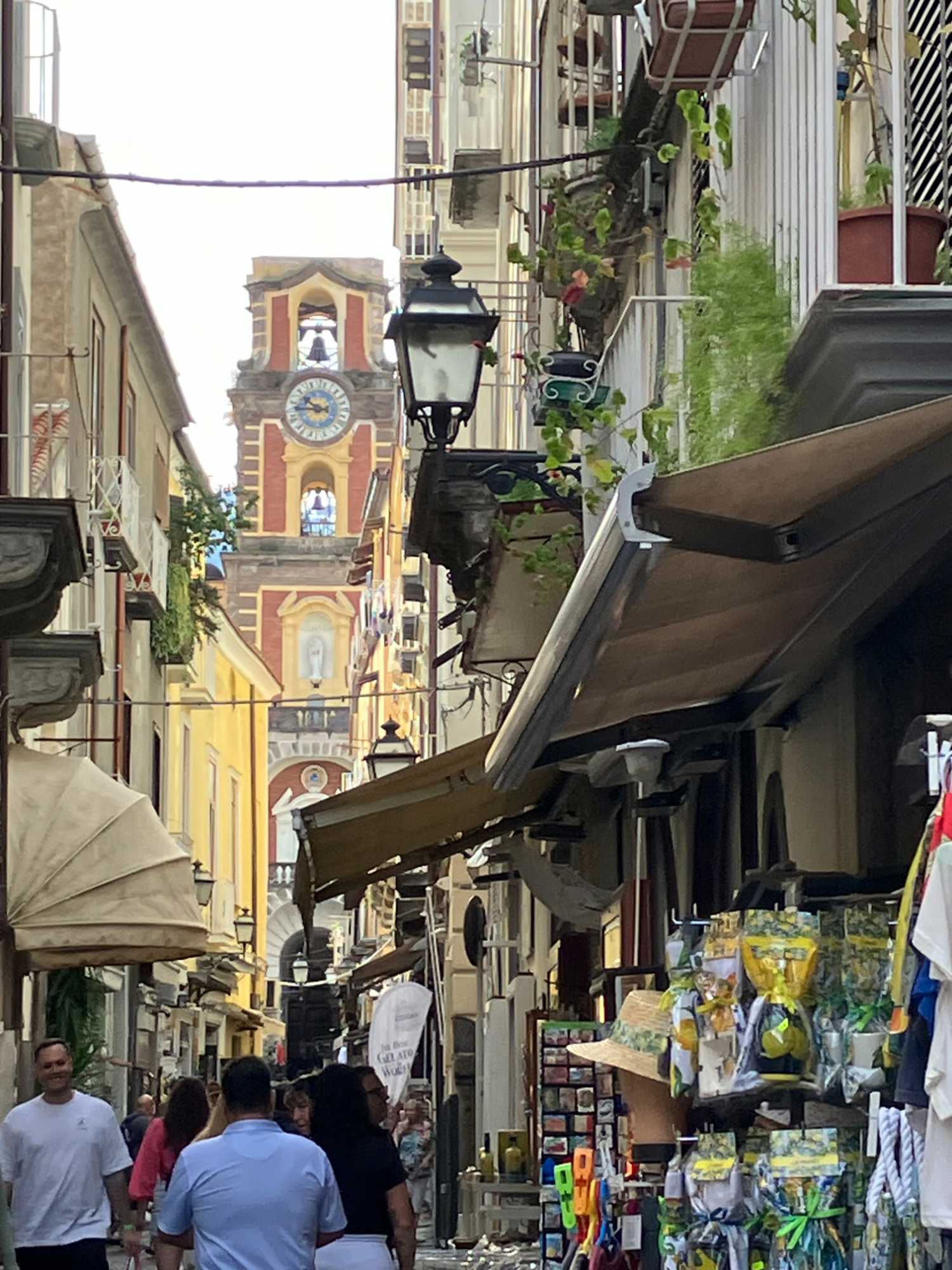 Notre première escale nous conduit à la presqu’île de Sorrento qui divise en deux parties distinctes la côte de Sorrento et la côte amalfitaine. La ville bénéficie d’un climat méditerranéen très agréable, qui favorise la culture des agrumes, particulièrement celle des citrons, qui ont la particularité d’avoir la pelure plus épaisse. C’est ici qu’est né le Limoncello. Le passé glorieux et mouvementé de Sorrento a laissé des traces de l’Antiquité et de la Renaissance dont la beauté saute aux yeux. Les nombreuses villas italiennes d’autrefois ont été transformées en hôtels de luxe et stations balnéaires. Déambuler à la piazza Tasso et dans les petites rues bordées de boutiques est un pur ravissement. Le temps est magnifique pour notre promenade. Nous sommes allés dans la cathédrale baroque de Sorrento, où nous avons vu la crèche perpétuelle de santons et les boiseries de la nef, toute de marquetterie, tant renommées ici. Quelle visite enrichissante ! Merci à Erminia qui nous fait découvrir ces trésors.