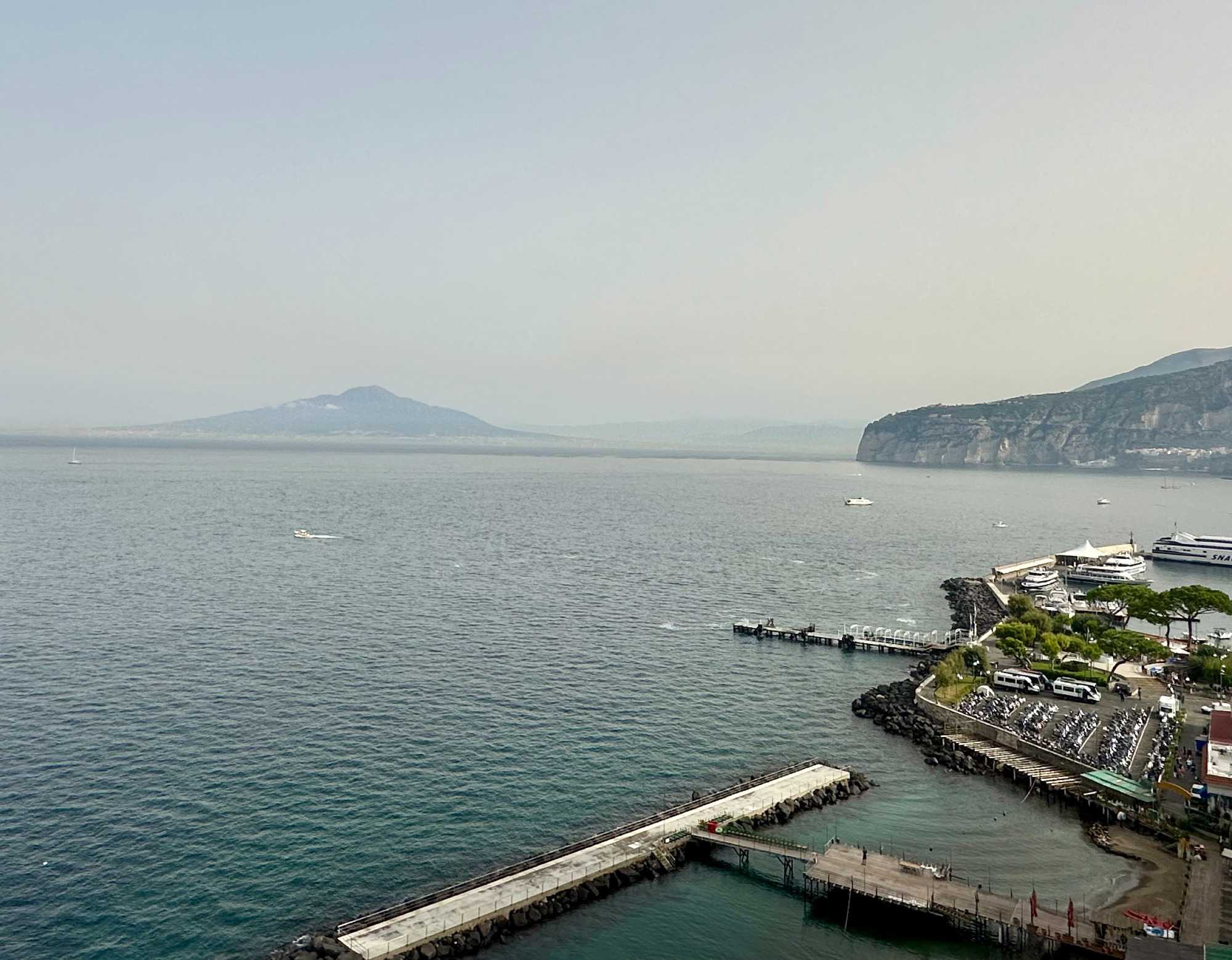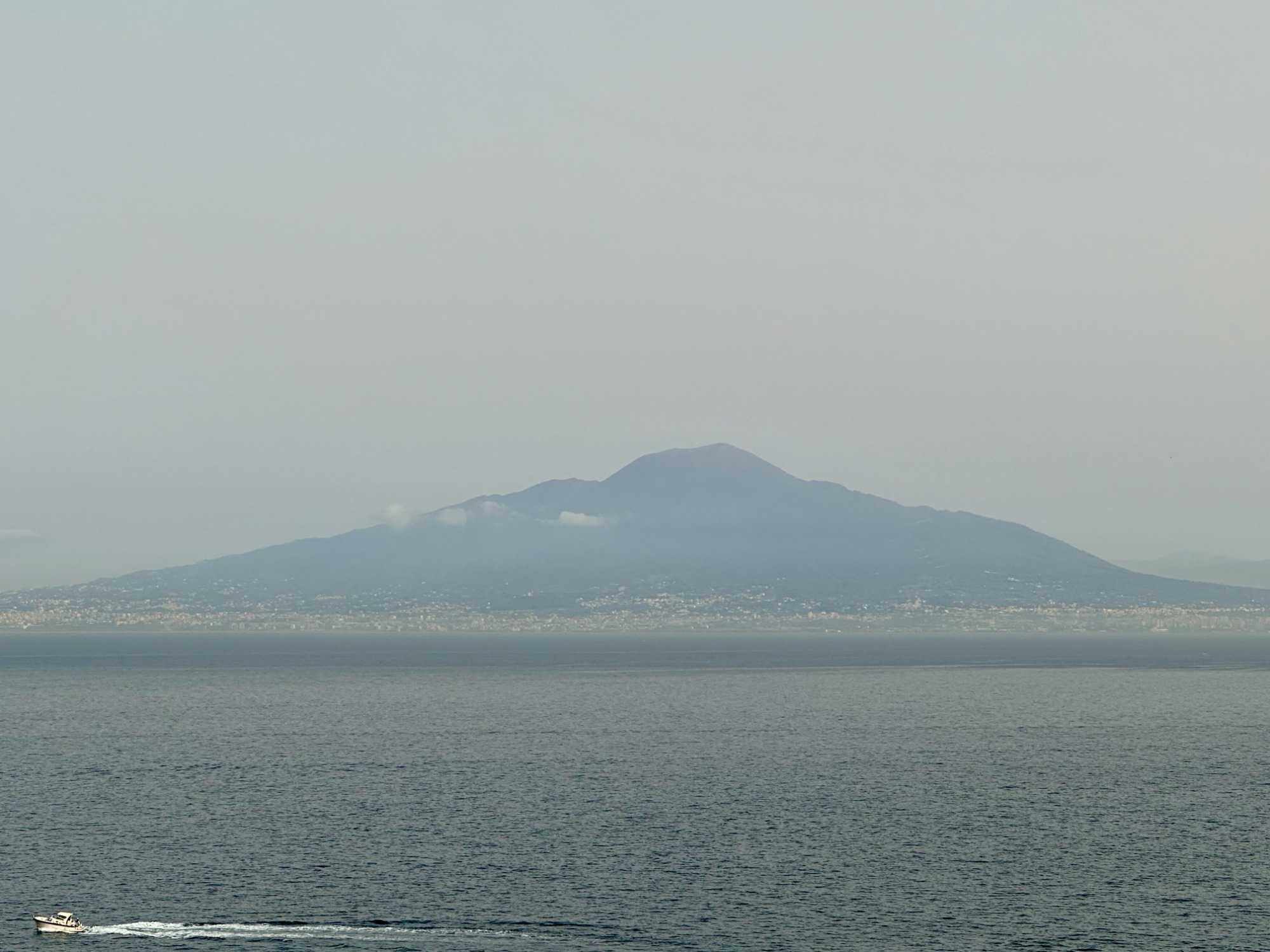 En empruntant l’autoroute à la sortie du port, l'imposant Vésuve, un volcan dont la dernière éruption date de 1944, s’impose à notre vue. Il est devenu parc national en 1955 et comprend des sentiers qui permettent de le gravir jusqu'au sommet à 1280 m. De ses terres riches, couvertes de végétation, une production généreuse de tomates cerise et un vin tout spécial appelé “larmes du Christ” sont produits sur cette montagne.