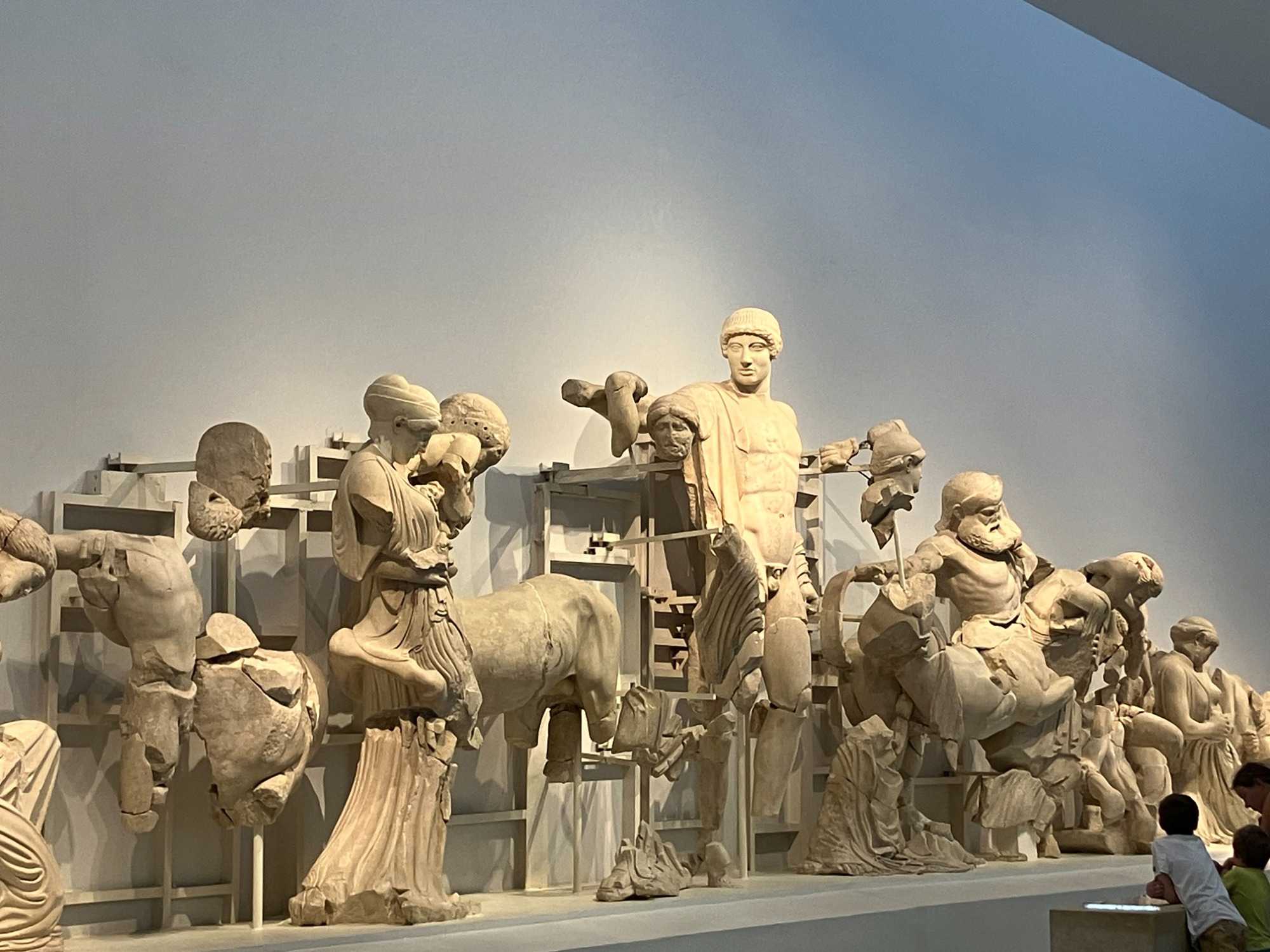 On remonte dans le mini-bus, avec le sympathique chauffeur Christos. En route vers Olympie! D’abord un petit arret “gringnotine et magasinage”, puis nous poursuivons vers le musée. Les multiples salles du musée sont remplis de trésors retrouvés au fil des années lors des fouilles. C’est une incursion dans les temps anciens: vases, urnes funéraires, armes en bronze en métal, armures, boucliers, fresques, statues, sculptures et reconstitutions d’objets de l’antiquité grecque sont exposés.