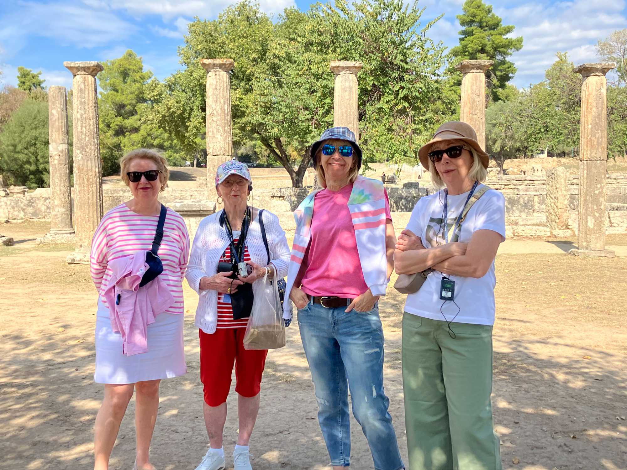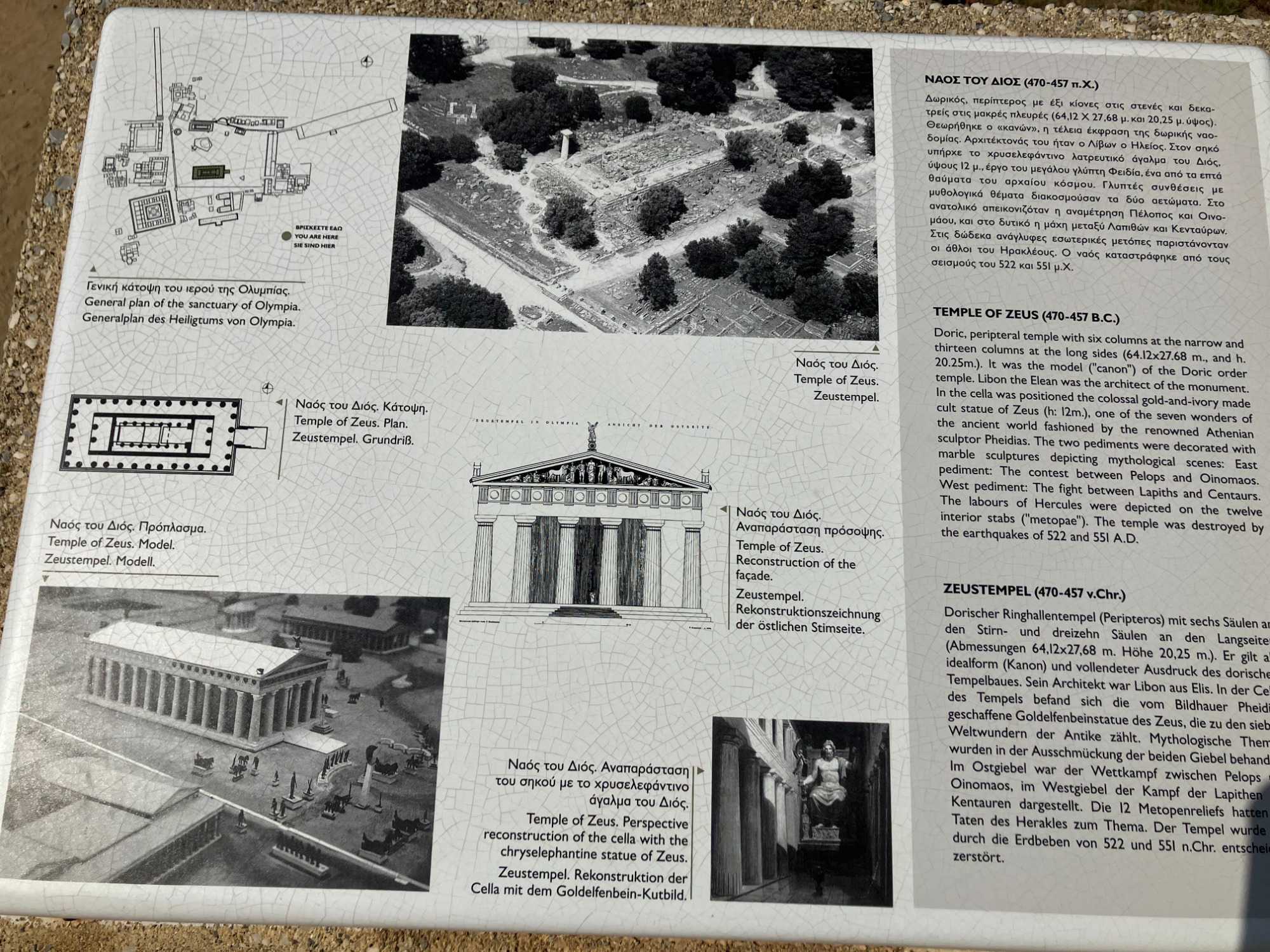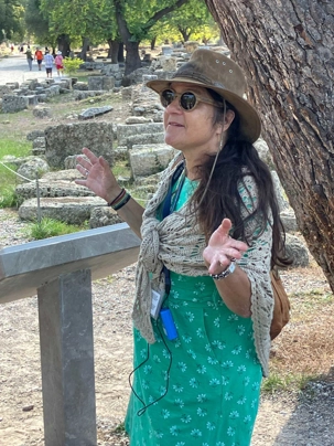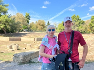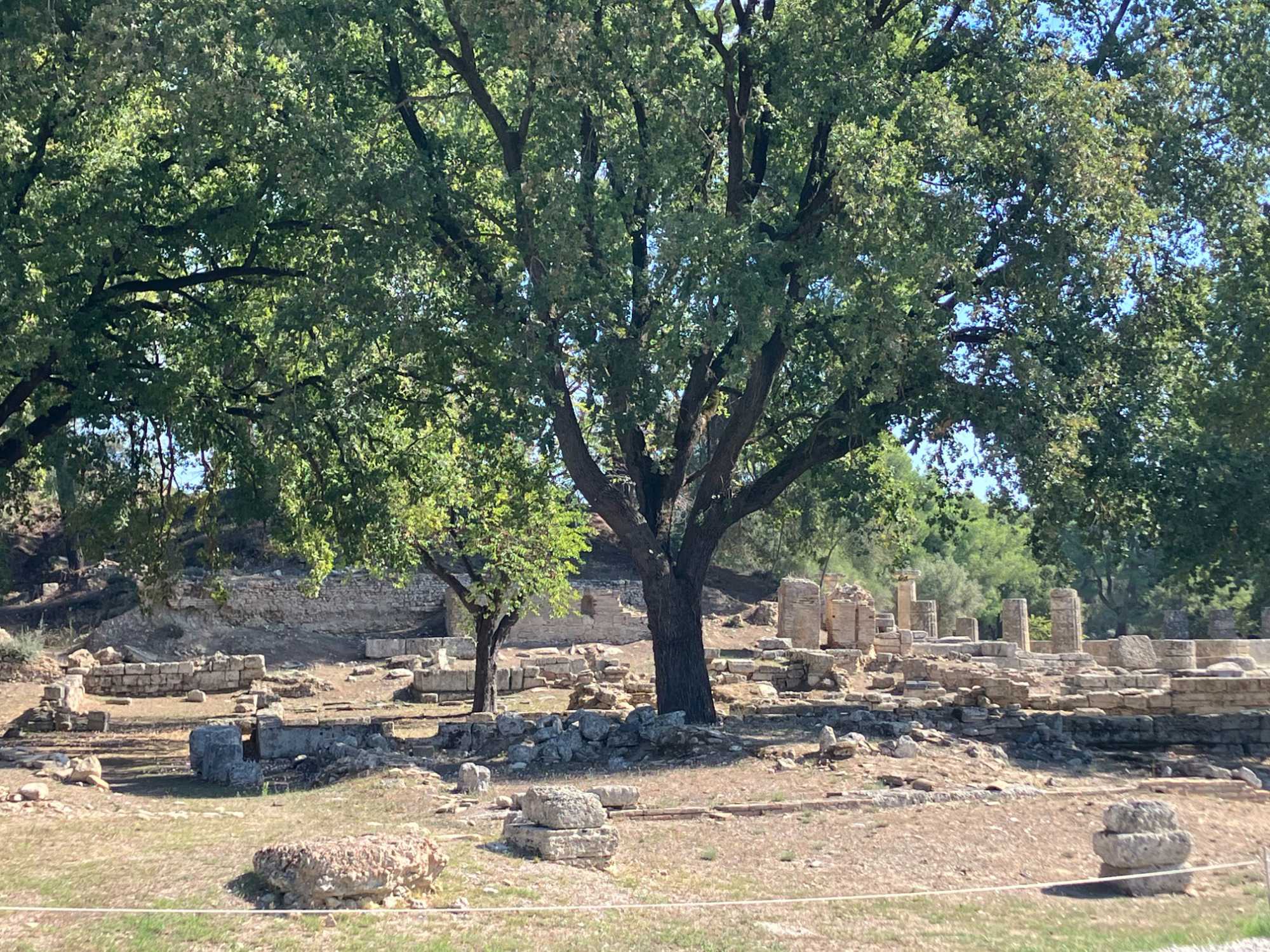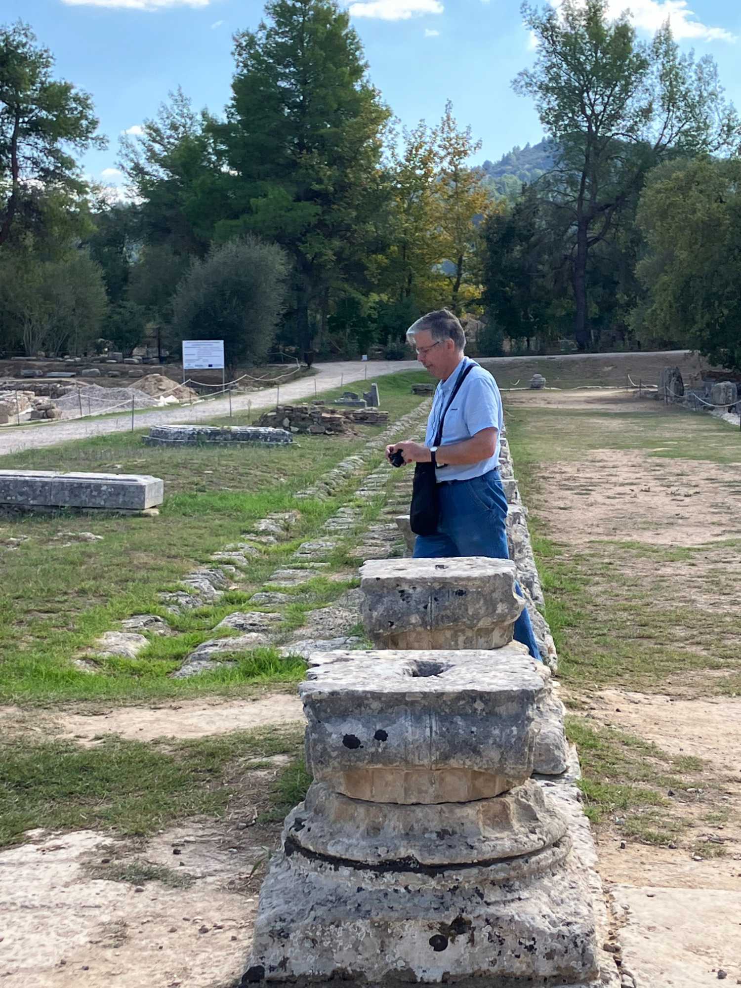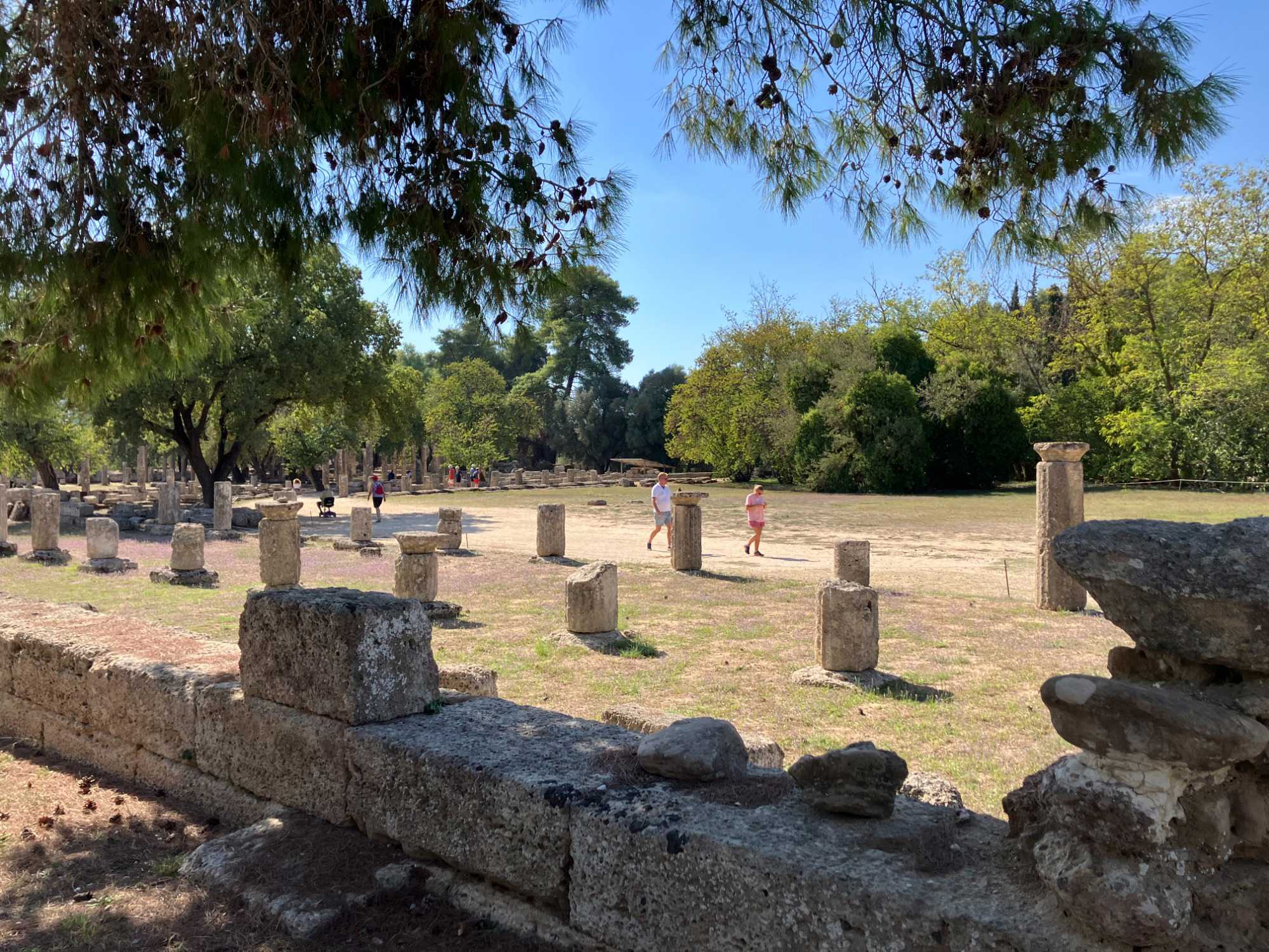 On continu ensuite à pied vers le site archéologique en plein air. Installé dans une vallée du Péloponnèse, le site d’Olympie, dès l’époque de la préhistoire, s'y implanta le culte de Zeus dès le Xe siècle av. J.-C. C’est dans ce site paisible que furent vénérées plus que partout ailleurs la force et la résistance humaine. Les édifices du site d’Olympie, détruits par les tremblements de terre, par un raz de marée ou pillés par les Romains, furent érigés ici en un vaste sanctuaire renfermant des temples, des autels de diverses divinités, des trésors, des statues des Dieux et des vainqueurs des jeux. Il y a peu de touristes cet après-midi, on se promène avec notre guide, tout à notre aise et nous avons le loisir de faire de très belles photos.