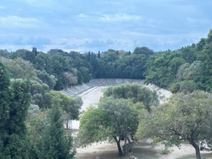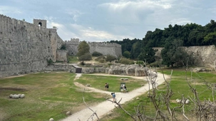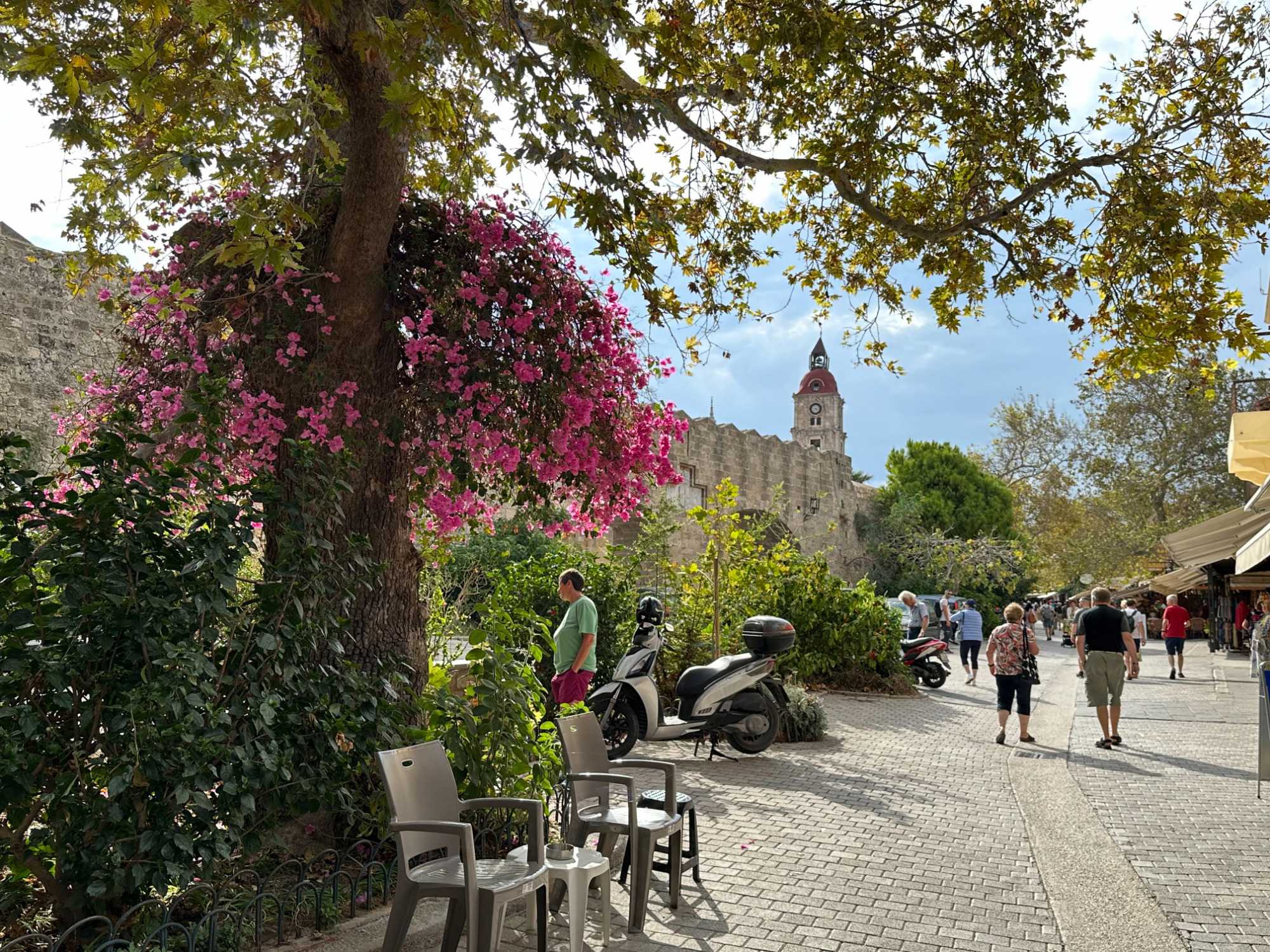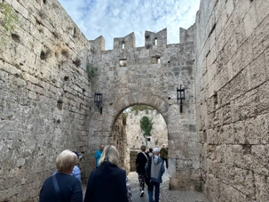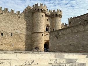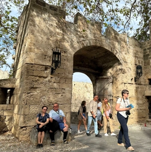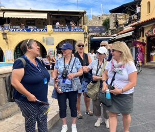 Mariana, notre guide préférée de Rhodes, ville inscrite à la liste des 20 endroits à visiter par l’UNESCO, nous attend dès notre sortie du navire, en compagnie de notre chauffeur Manus. C’est une dame très cultivée, chaleureuse, enseignante à l’université qui nous transmet avec passion et générosité non seulement l'histoire médiévale de la région, mais nous trace aussi l’évolution des différentes conquêtes vénitiennes, allemandes, anglaises qui ont façonné la vie quotidienne des gens d’ici. Elle nous enchante et nous captive par sa façon de nous enseigner l'étymologie à travers quelques pans de la mythologie grecque. Honnêtement, elle donne envie de s’y intéresser davantage. Nos voyageurs sont très intéressés par les enseignements de Mariana et ils n'hésitent pas à la questionner pour en savoir plus. En faisant d’abord un tour panoramique de la ville en autocar, nous longeons les murailles et le port de Mandraki. À notre descente de l’autocar, nous entendons les chants de la messe orthodoxe de la cathédrale de Mandraki dont les portes sont ouvertes. La cérémonie a déjà commencé depuis 6h ce matin et dure jusqu’à 10h30. Plusieurs bâtiments du secteur méritent que nous y fassions un arrêt. À l’entrée du port de plaisance, on voit aisément les statues du cerf et de la biche déposés sur leur colonne respective, symbole de l’île et situées tout près du Fort de St-Nicolas (datant du 15e siècle). On peut trouver quelques plages, qui nous offrent une belle vue sur cette mer d’un bleu unique. Les montagnes au loin appartiennent à la Turquie, située à seulement 17 km de nous.