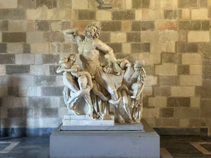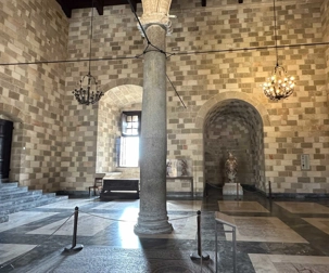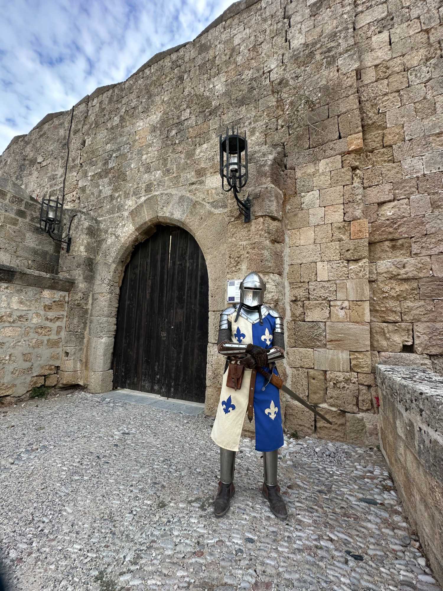 Au 14e et 15e siècle, les chevaliers de l’ordre de St-Jean de Jérusalem construisirent les murailles du Fort St-Nicolas avec un fossé sec, d’une longueur de 5 km, comptant 11 portes d’entrée. Nous visitons le palais des chevaliers. Un impressionnant et superbe exemple de l’architecture médiévale avec 4 murets de défense! Les plafonds sont en cyprès dont on peut sentir l’odeur de la résine lorsque le toit se réchauffe en été. Rhodes est en effet une des îles les plus chaudes de Grèce ! Marianna nous décrit les salles du Palais comme si elle y résidait ! Les mosaïques des planchers ont leur histoire propre. Chaque salle est associée à des récits de la mythologie grecque comme la belle Méduse qui, suite à sa transformation en monstre par Athéna, avait le pouvoir de pétrifier un homme en sel simplement par son regard ! Méduse fut tuée la tête tranchée et Athéna porta l'œil de Méduse comme égide à son bouclier et depuis, cet œil, que l’on voit partout dans les boutiques et sous toutes les formes partout en Grèce est donc un objet assurant la sécurité de celui qui le détient, selon la mythologie grecque.