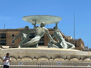 Simone notre guide nous parle de l’architecture baroque raffinée comme ses monuments élaborés: le Palais des grands maîtres et, la cathédrale Saint-Jean, richement décorés des bannières et des blasons des chevaliers de la croisade. D’ailleurs, le Palais des Grands Maîtres, convertit en résidence du Président de Malte, contiendrait des armures confirmant l’importance des Chevaliers de l’Ordre de St-Jean. On a bien vu les Trois Trittons de bronze de … La Fontaine des Trittons, située juste à l'extérieur de la porte de la ville de La Valette. Ces trittons mi-animal, mi-humain, soutiennent un grand bassin, en équilibre sur une base concentrique construite en béton entre 1952 et 1959, la fontaine constitue l'un des monuments modernistes les plus importants de Malte. Magnifique. Les chevaliers se vantaient d‘avoir les meilleurs architectes. La Valette possède aussi des oeuvres d'art précieuses et exclusives, dont un Caravaggio (technique du clair-obscur qui donnait des tableaux très sombres).